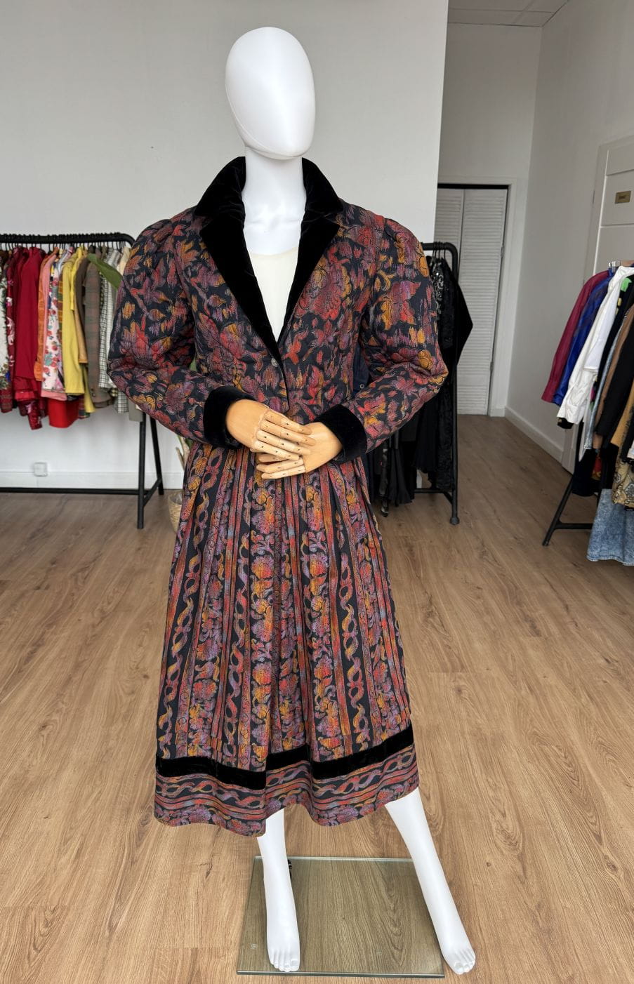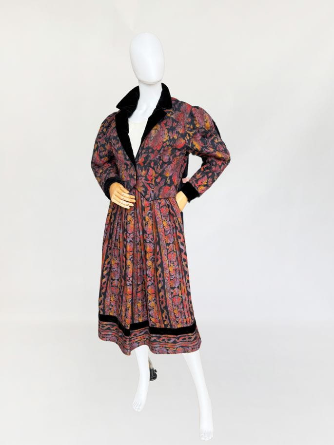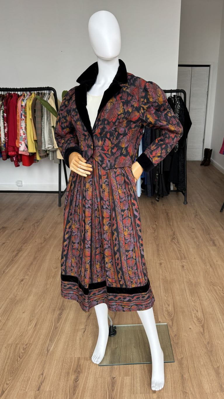 Spódnica vintage wykonana z lekkiej bawełnianej tkaniny w barwne wzory. Rozkloszowany fason. Wykończona czarną aksamitną lamówką.
