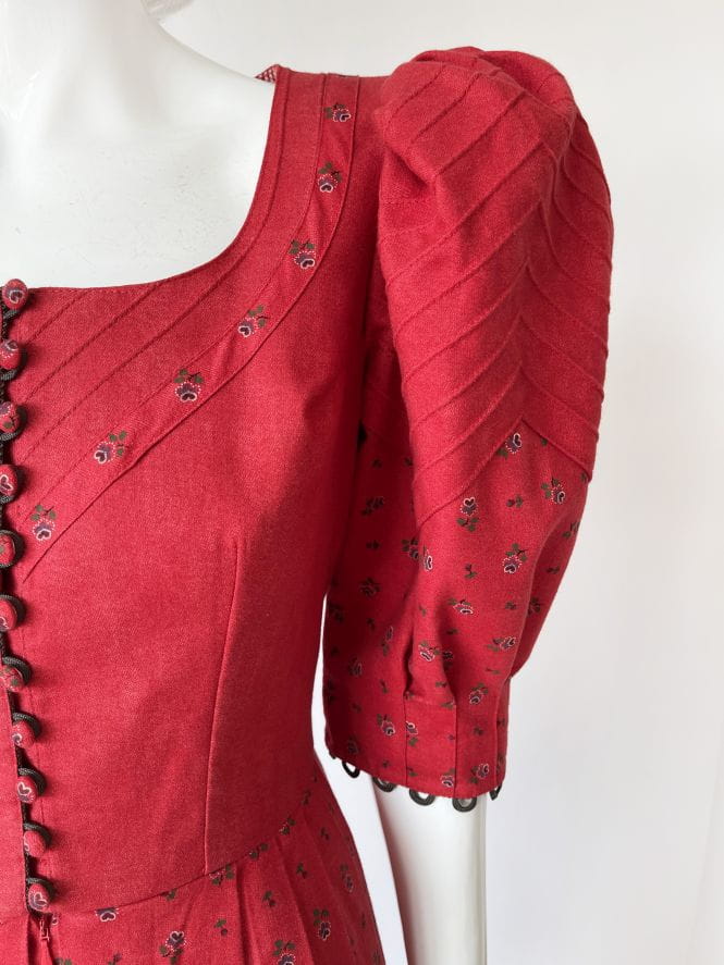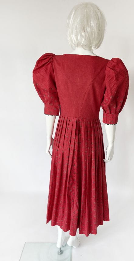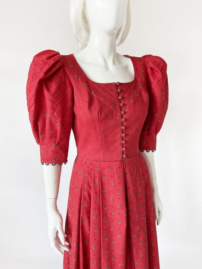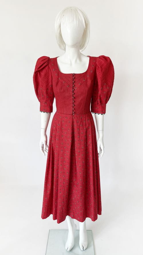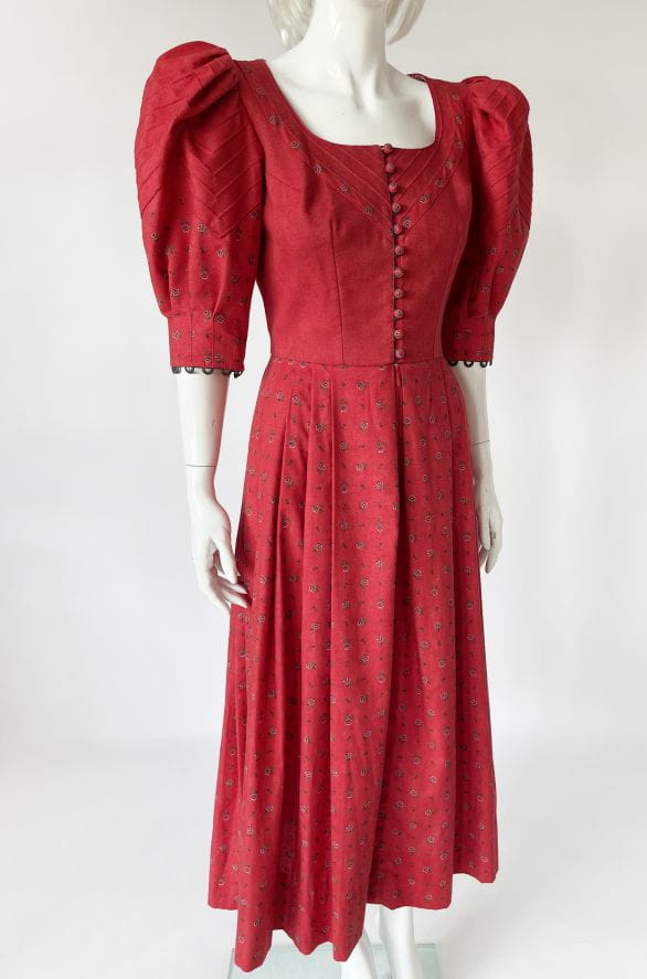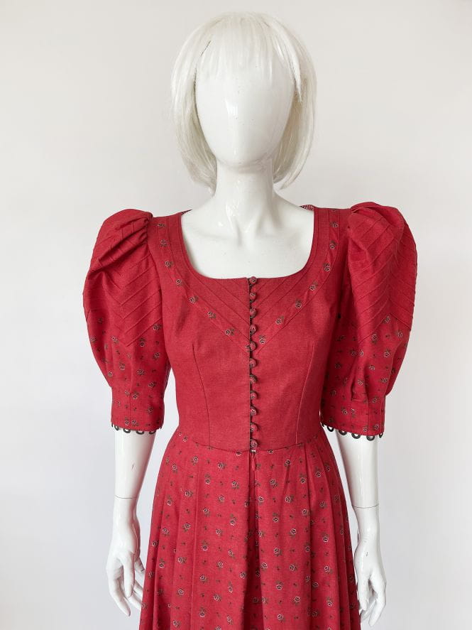 Przepiękna bawełniana sukienka cottagecore, o długości maxi i rozłożystym kroju. Dopasowana góra zapinana na drobne urocze guziki. Rękawy mocno bufiaste w ramionach. Rozłożysty dół z zakładkami. Deseń w drobne kwiatowe wzory. Wykonana z mocnej, przyjemnej bawełny. Górna partia z podszewką.