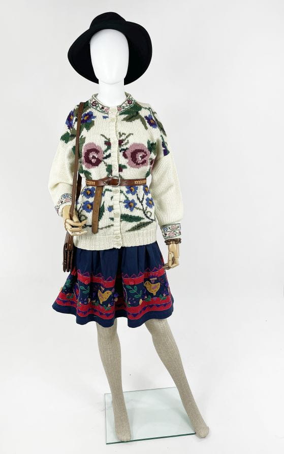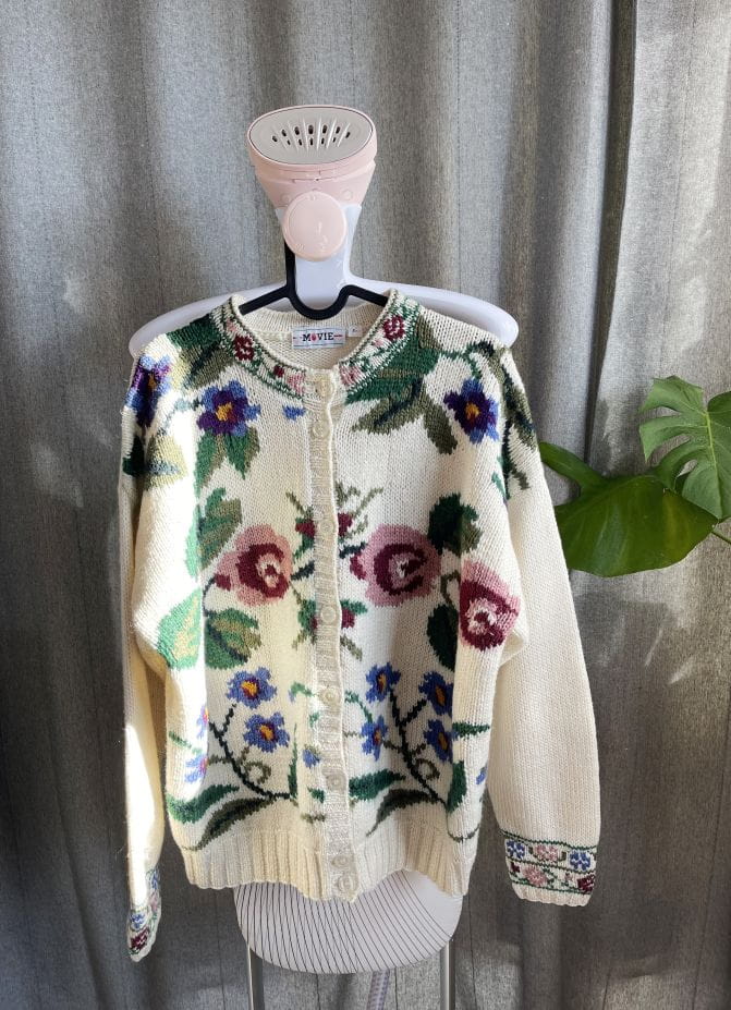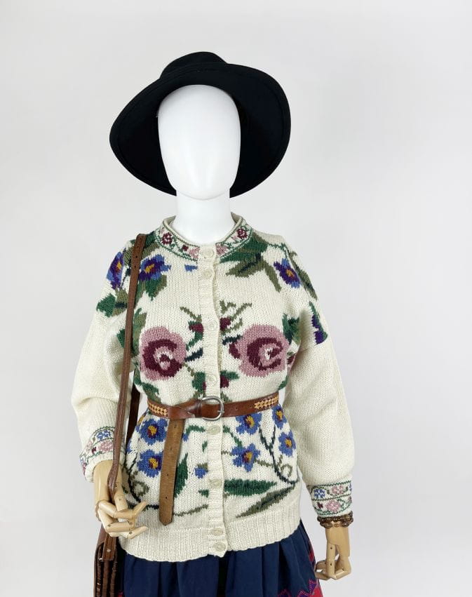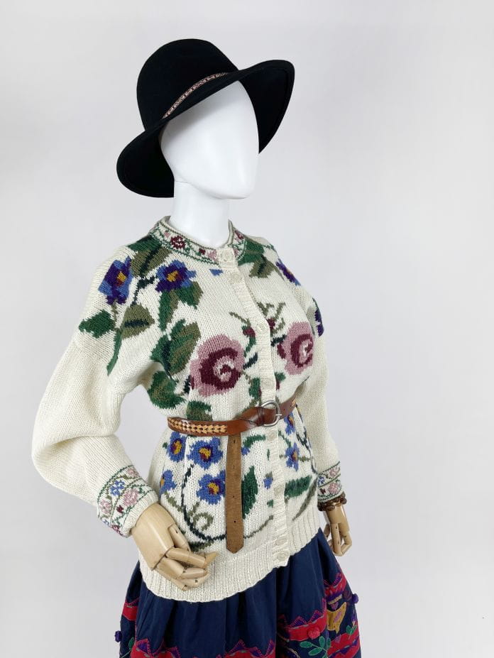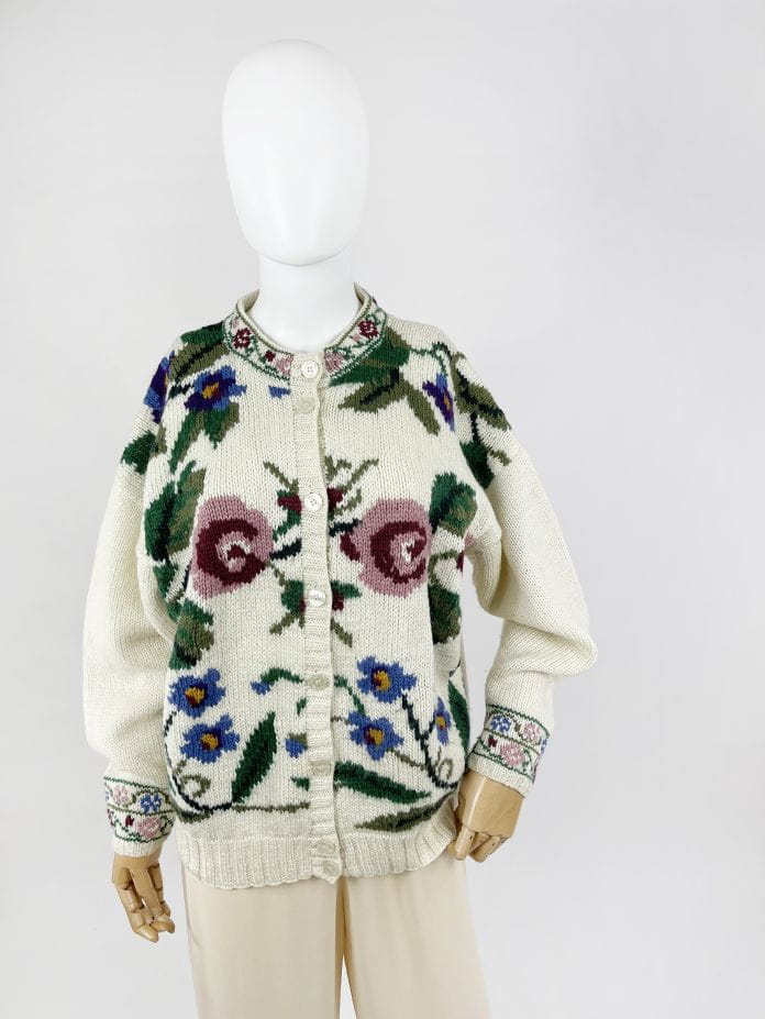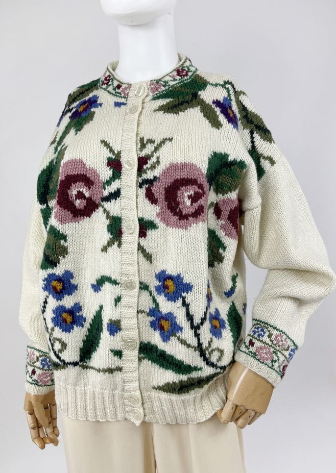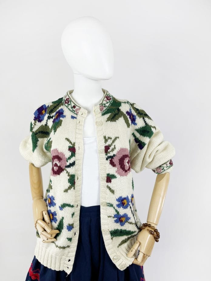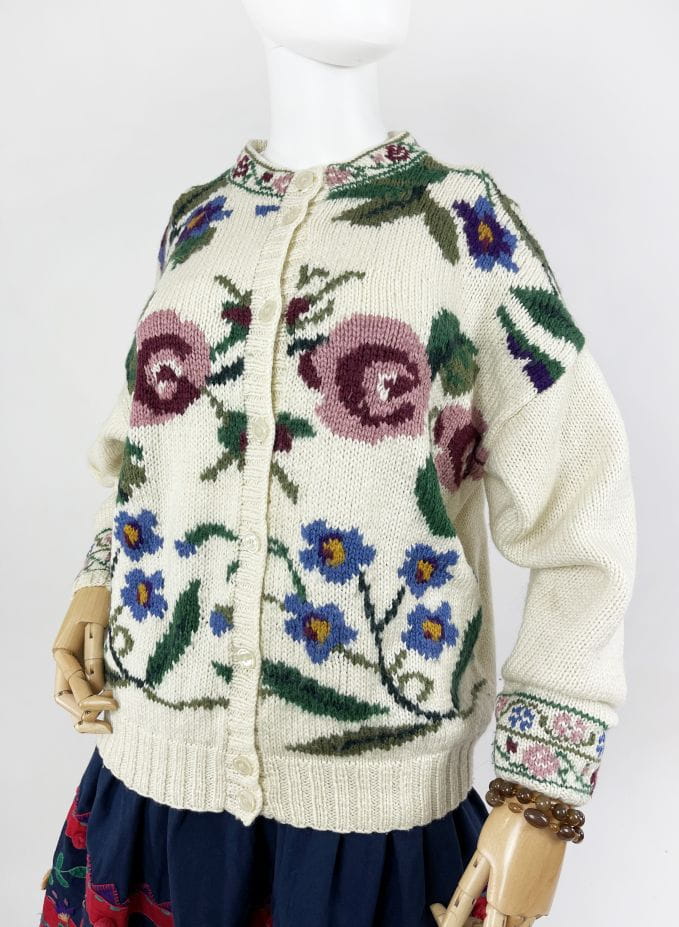 Rozpinany sweter vintage wykonany z miękkiej dzianiny w kolorze kremowym. Z przodu duże kolorowe kwiatowe wzory. Prosty rozpinany model z obniżoną linią ramion.