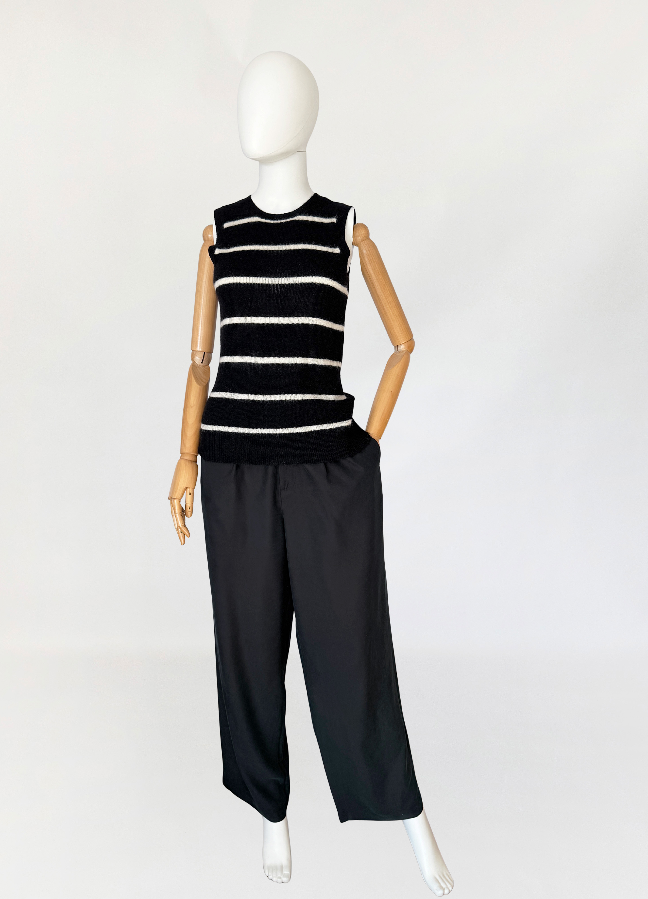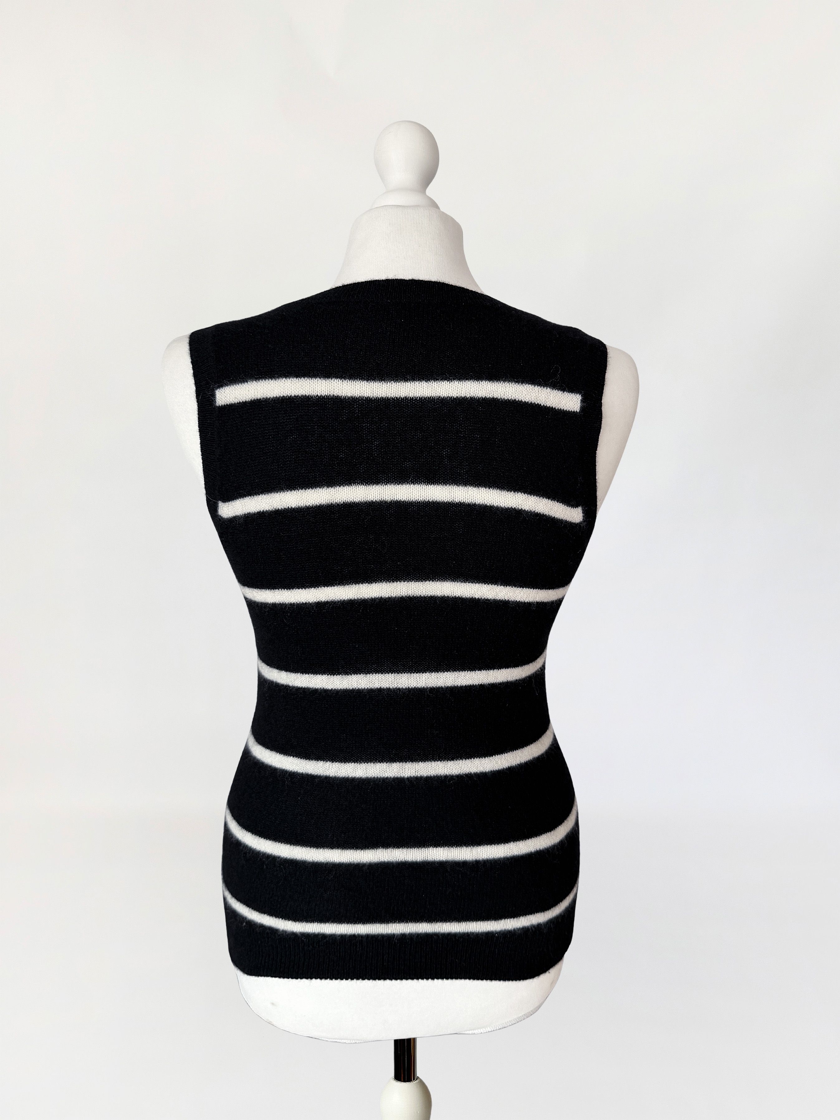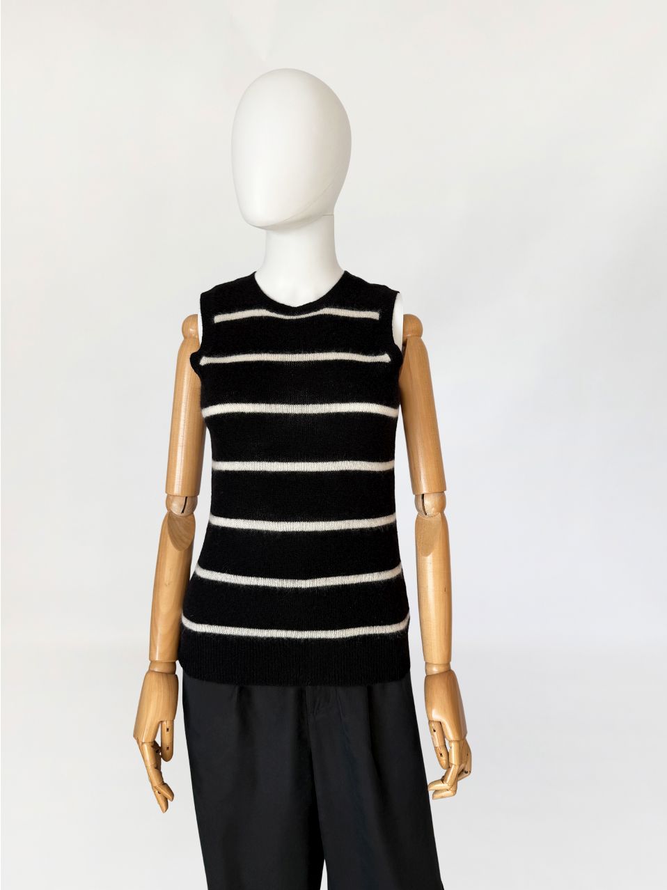 Top marki Saks Fifth Avenue wykonany w 100% z kaszmiru w czarnym kolorze z kontrastowymi, poziomymi pasami w odcieniu kremowym. Fason dopasowany, bez rękawów, z zabudowaną linią ramion i półokrągłym dekoltem wykończonym ściągaczem. Dolna krawędź wykończona wąskim ściągaczem.