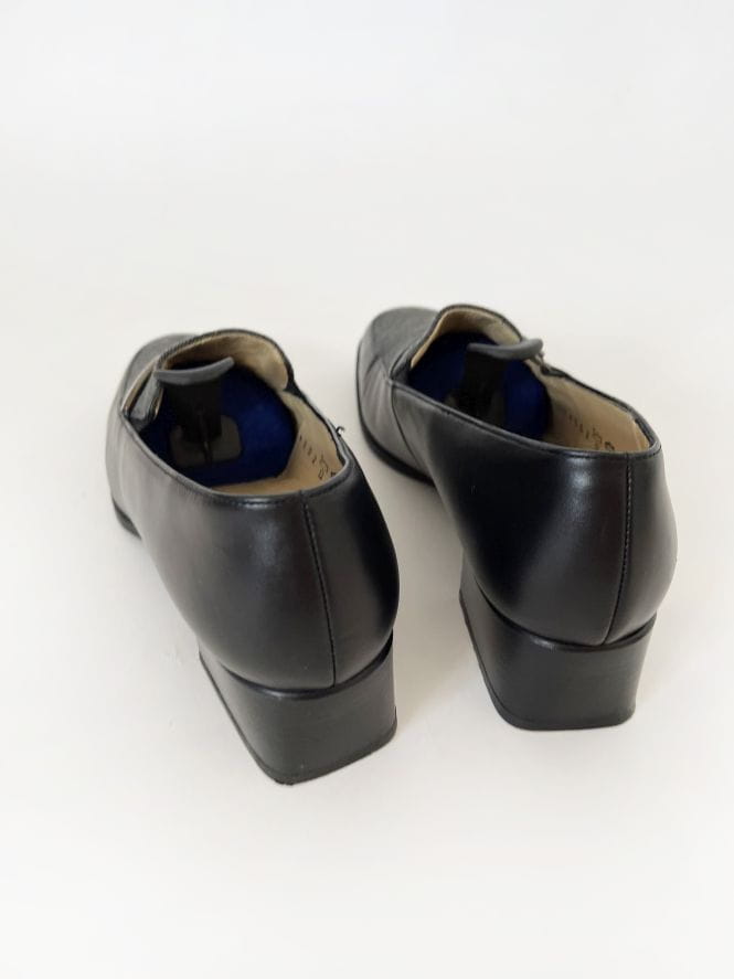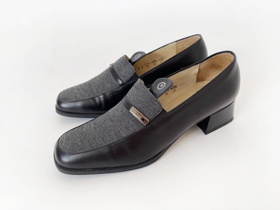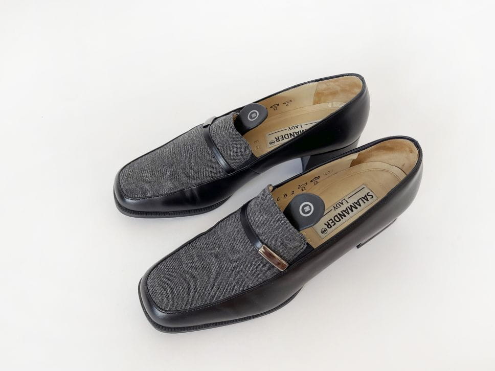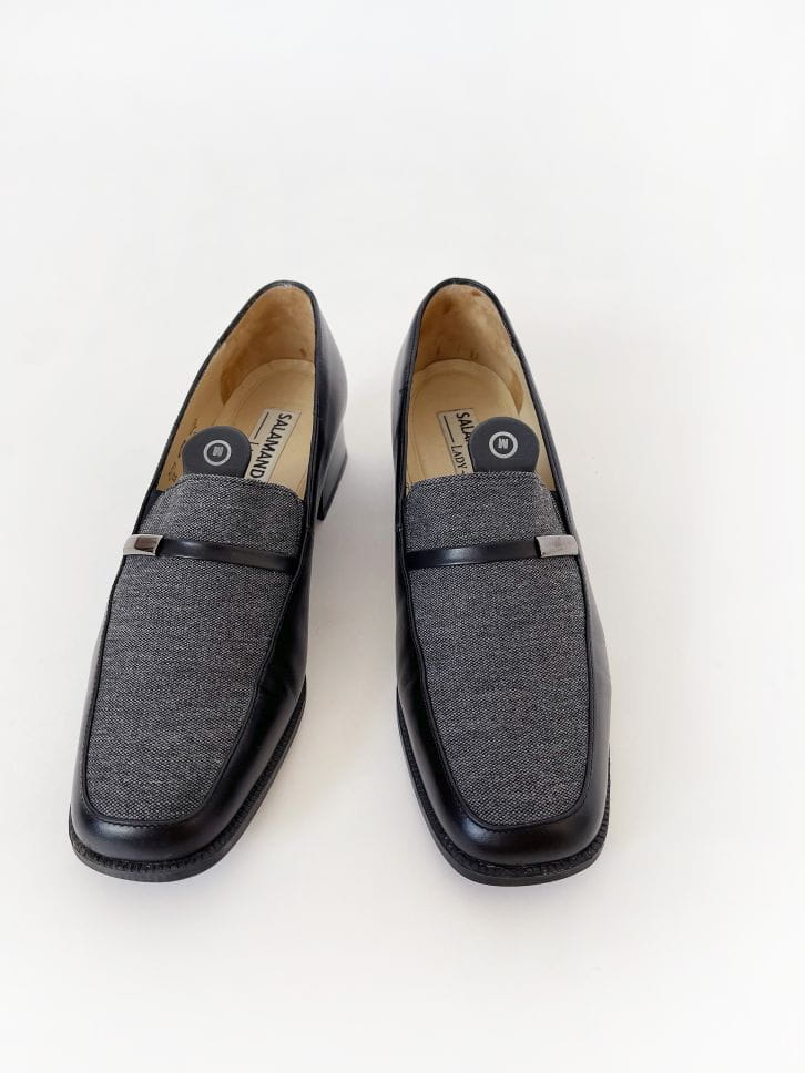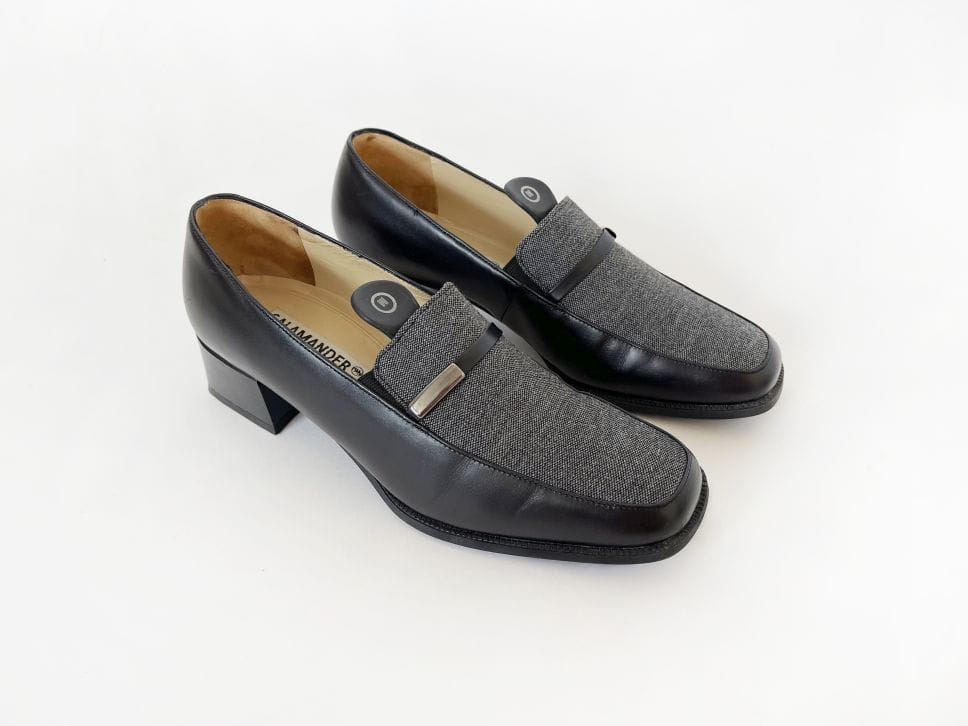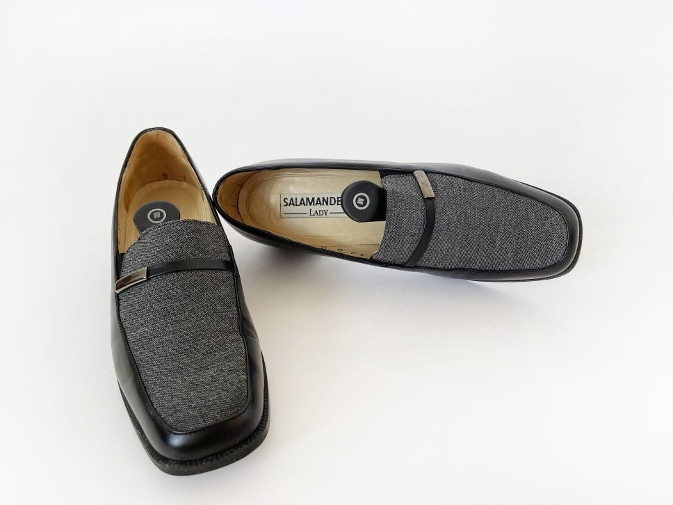 Stylowe półbuty marki Salamander. Połączenie czarnej skóry naturalnej i tkaniny. Model na niewielkim stabilnym obcasie. Sfotografowane z prawidłami (stąd dodatkowy język od wewnątrz :) )