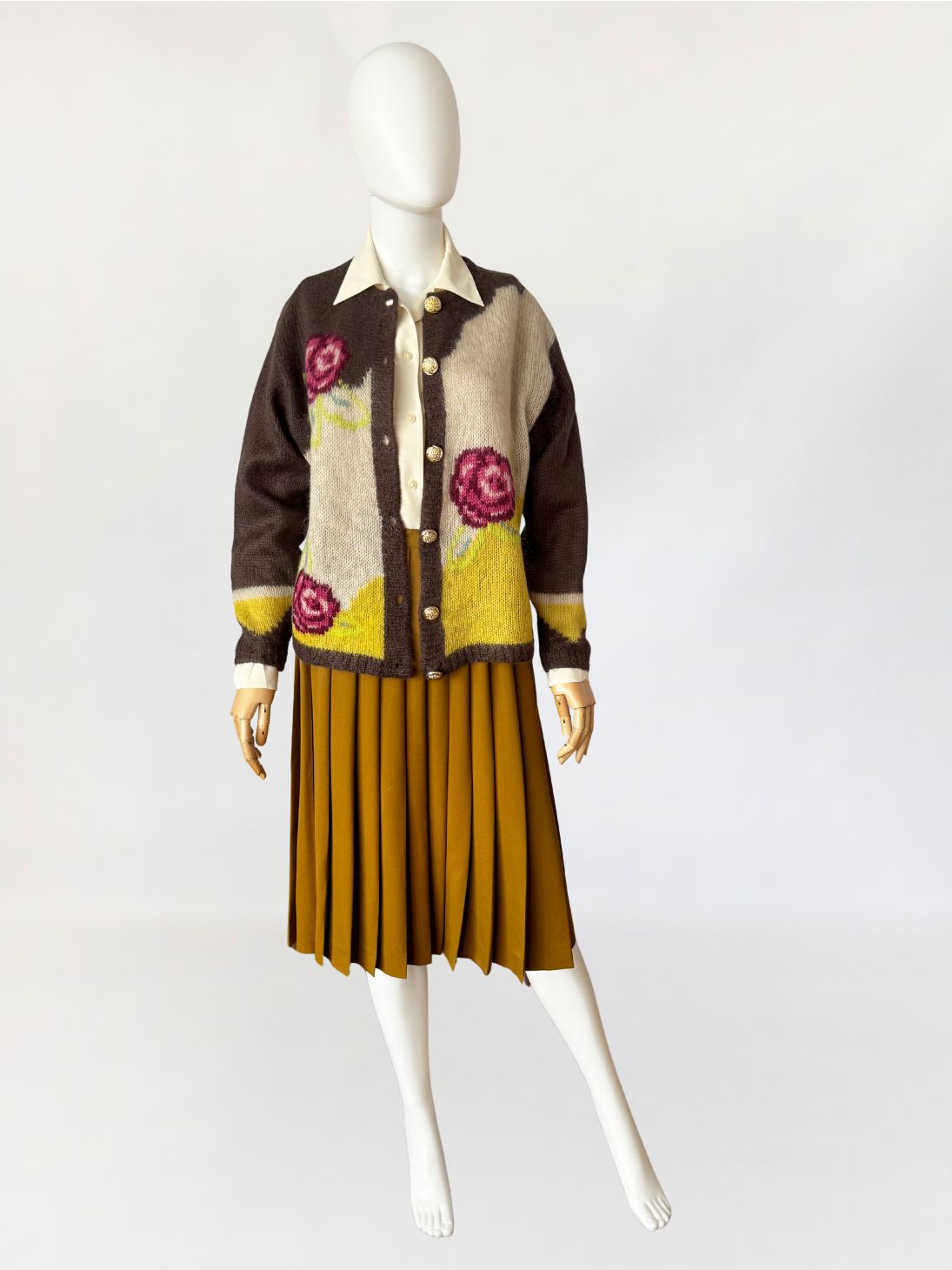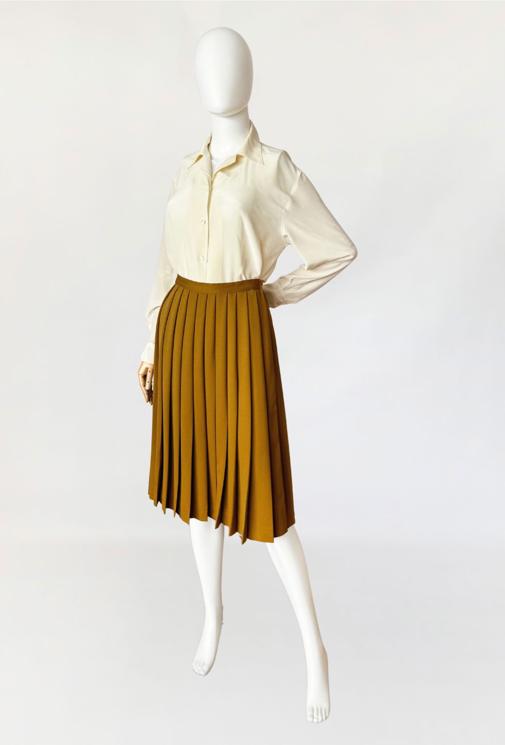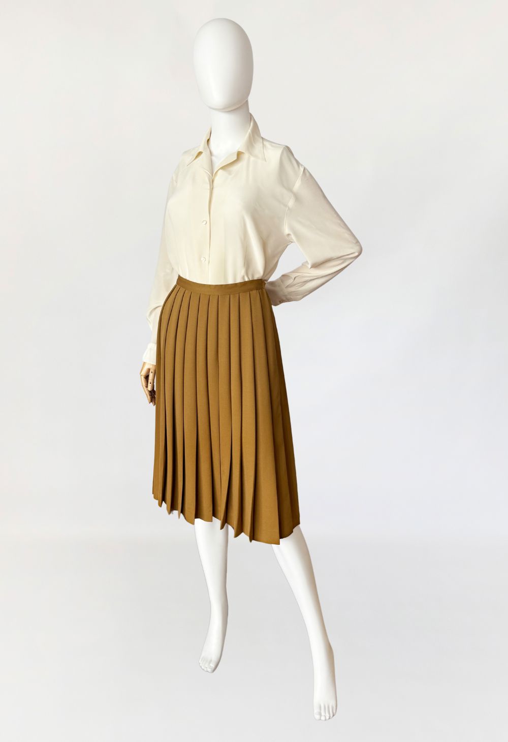 Plisowana spódnica vintage z lat 80-tych od Salvatore Ferragamo. Wykonana z wełnianej tkaniny w odcieniu khaki o subtelnych oliwkowych tonach. Klasyczny trapezowy fason z podwyższoną talią. Model bez podszewki.