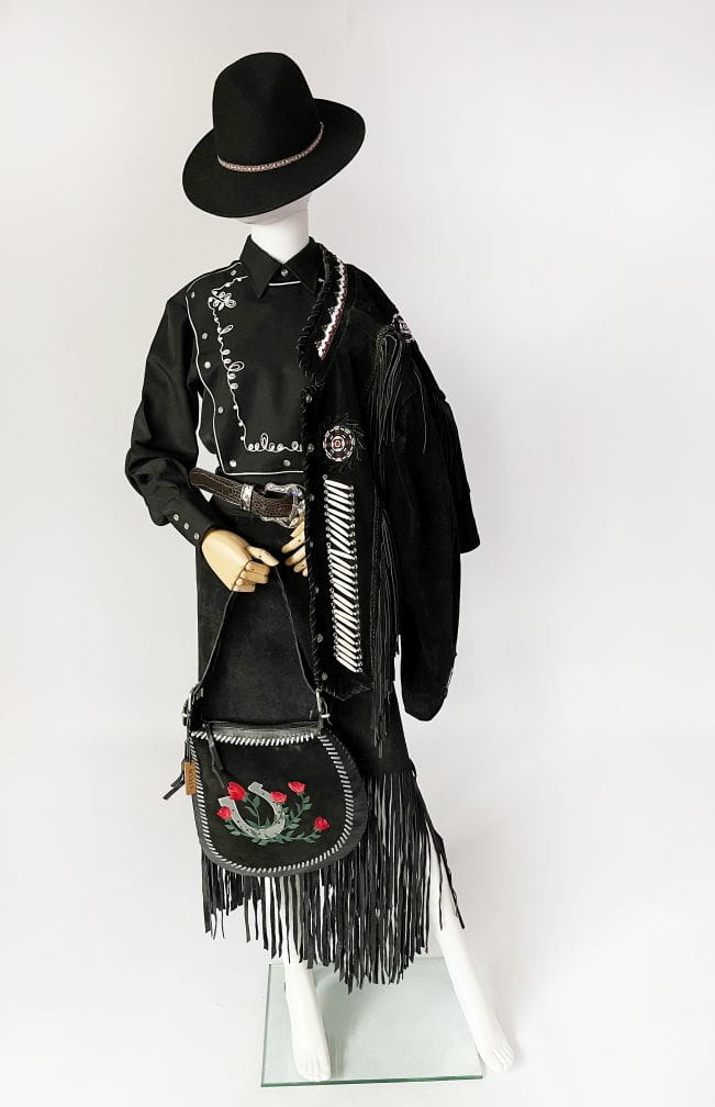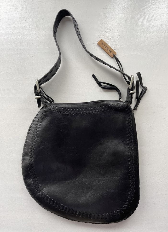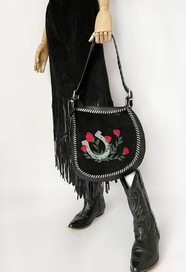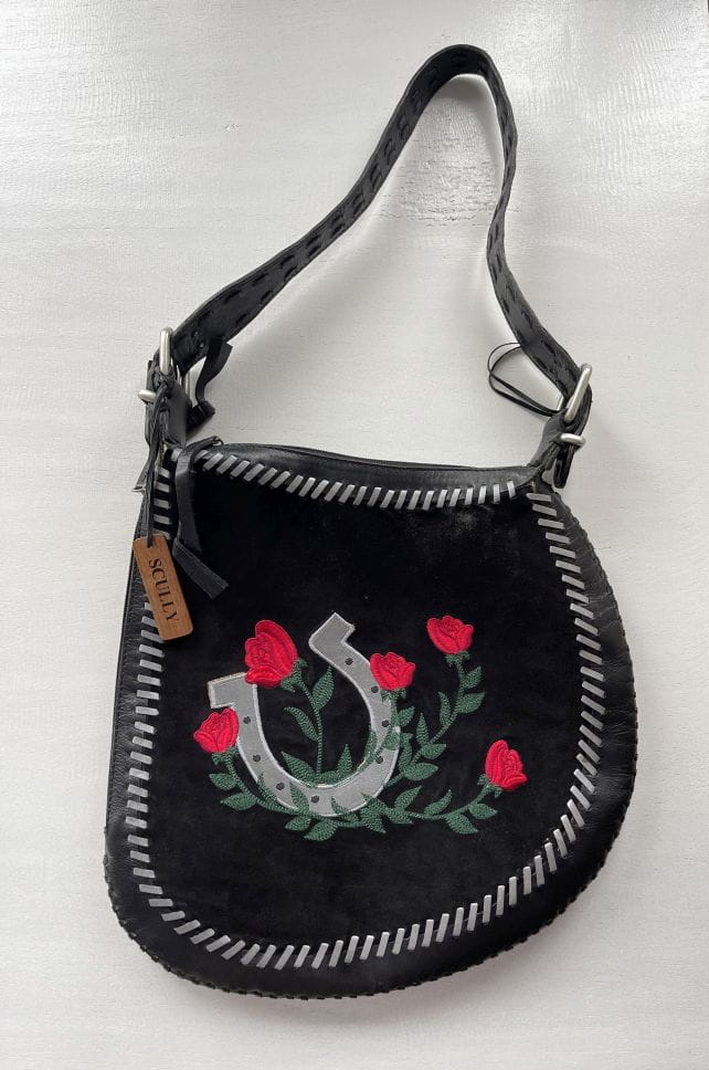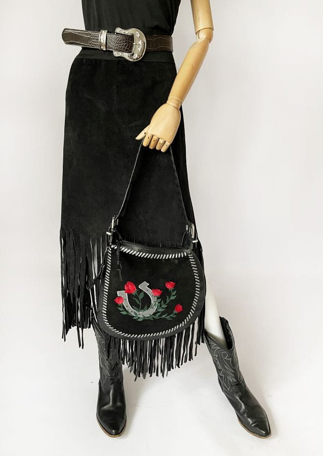 Obłędna skórzana torba "siodło" renomowanej marki Scully. Totalnie w westernowym stylu. Wykonana z solidnej czarnej skóry bydlęcej. Od frontu duża zamszowa wstawka, z dekoracyjną dużą podkową i haftowanymi aplikacjami. Podkowę i wykończenia wstawki wykonano ze srebrnej skóry. Model z grubym regulowanym, niedługim paskiem. Wewnątrz na podszewce z tkaniny i skórzanymi akcentami, duża komora z zasuwaną kieszonką i przegrodami na telefon, klucze a nawet długopisy. Wykończona obszyciami ze skórzanych rzemyków. Przy pasku drewniana metka z nazwą marki. Totalnie unikatowy model.