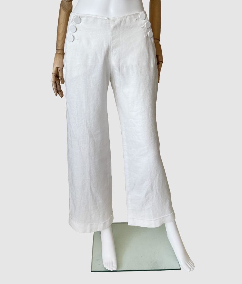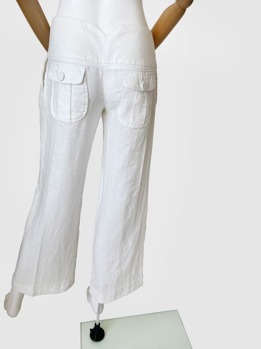 Spodnie marki Sisley wykonane z przewiewnej lnianej tkaniny. Model z długimi nogawkami i niższym stanem. Od frontu po 3 boczne oblekane tkaniną guziki. Z tyłu dwie kieszenie z patkami.