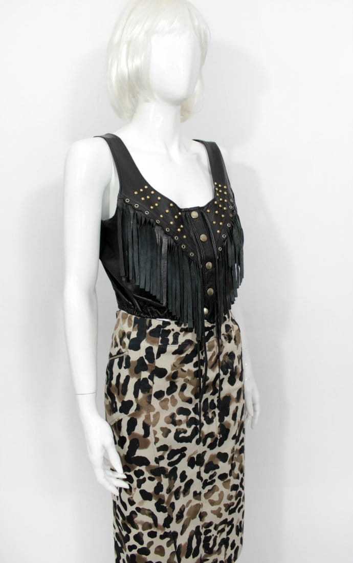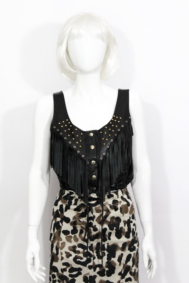 Skórzana czarna bluzka - top z długimi wiszącymi frędzlami. Zapinana na napy, góra wysadzana ćwiekami. U dołu ściągacz. Krój krótki. Skóra naturalna. Model vintage
