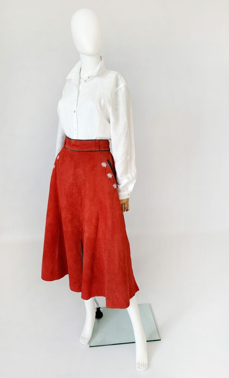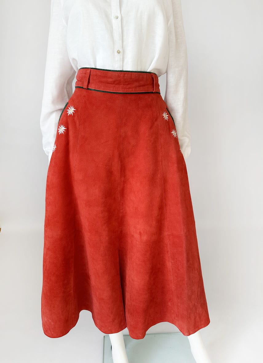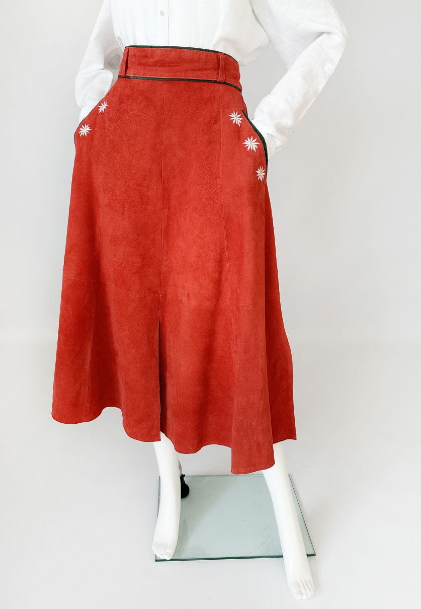 Austriacka długa spódnica vintage. Wykonana z miękkiego naturalnego zamszu w koralowym odcieniu. Rozkloszowany fason z wyższym stanem. W górnej części wsuwane kieszenie z haftowanymi aplikacjami - szarotkami alpejskimi. Wykończenia drobną lamówką w kolorze butelkowej zieleni. Z tyłu u dołu rozporek.