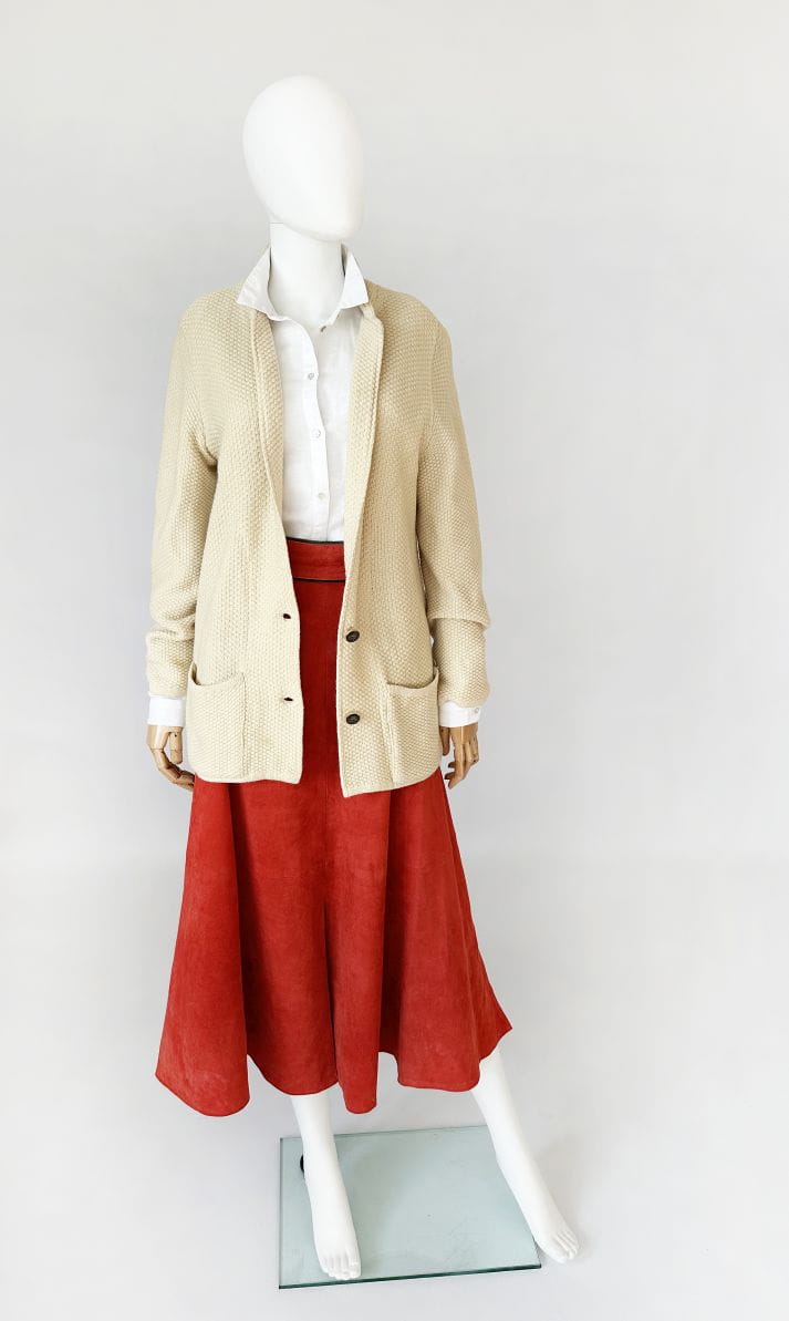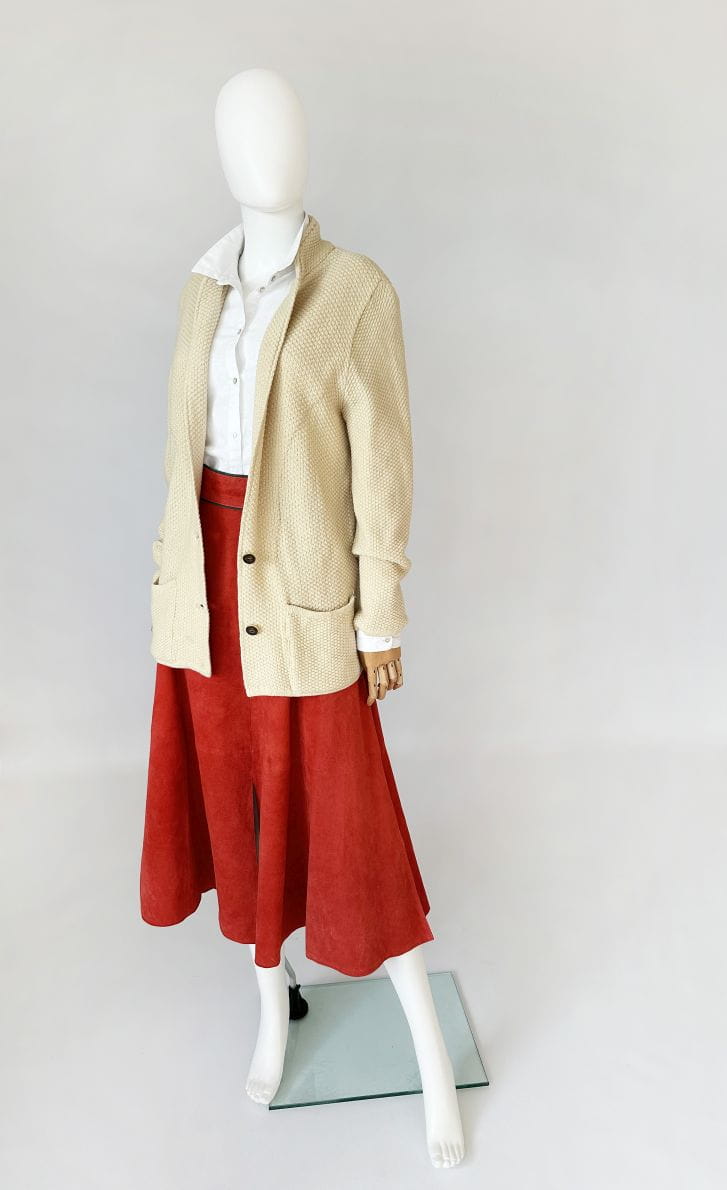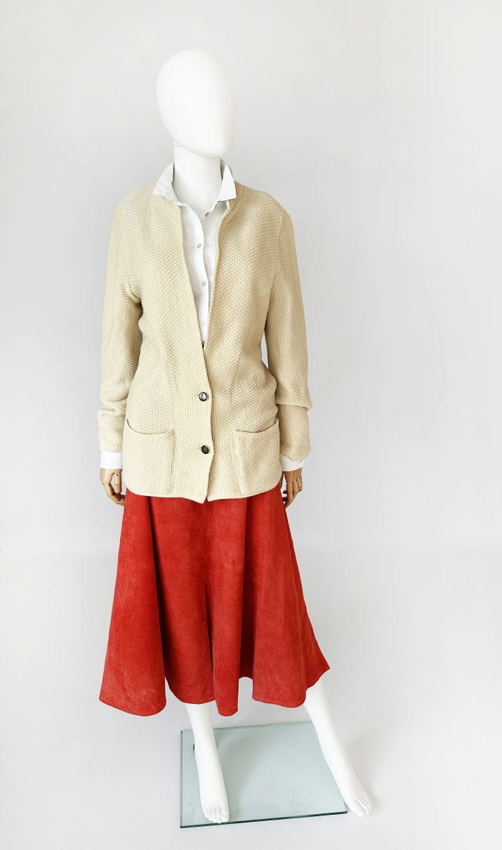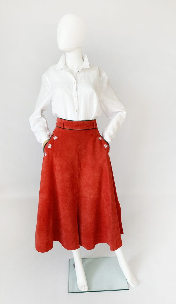 Austriacka długa spódnica vintage. Wykonana z miękkiego naturalnego zamszu w koralowym odcieniu. Rozkloszowany fason z wyższym stanem. W górnej części wsuwane kieszenie z haftowanymi aplikacjami - szarotkami alpejskimi. Wykończenia drobną lamówką w kolorze butelkowej zieleni. Z tyłu u dołu rozporek.