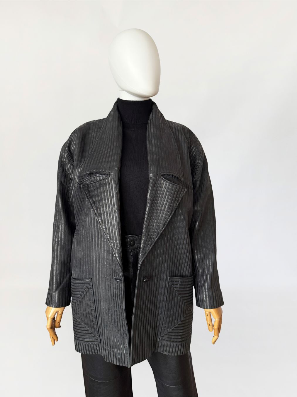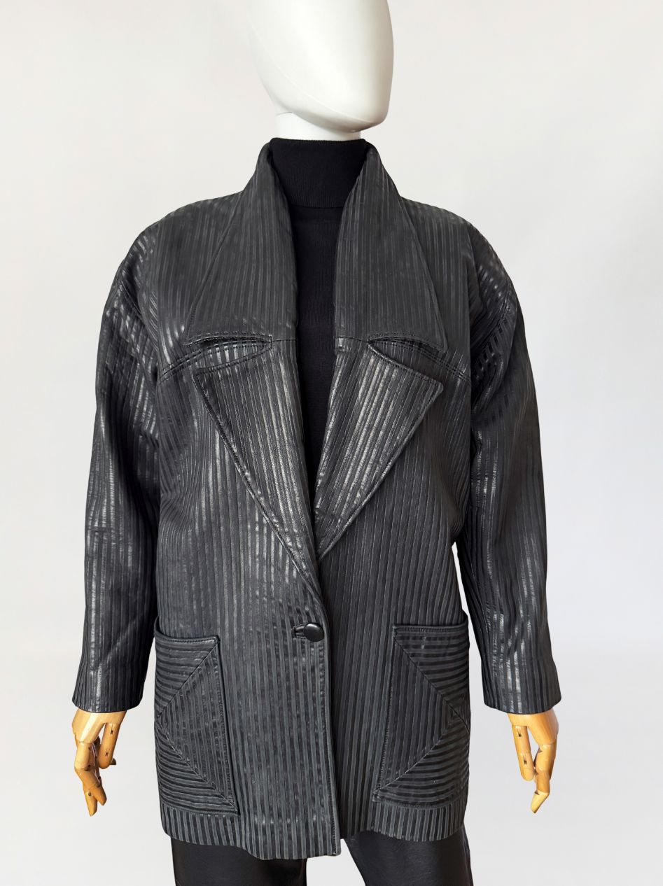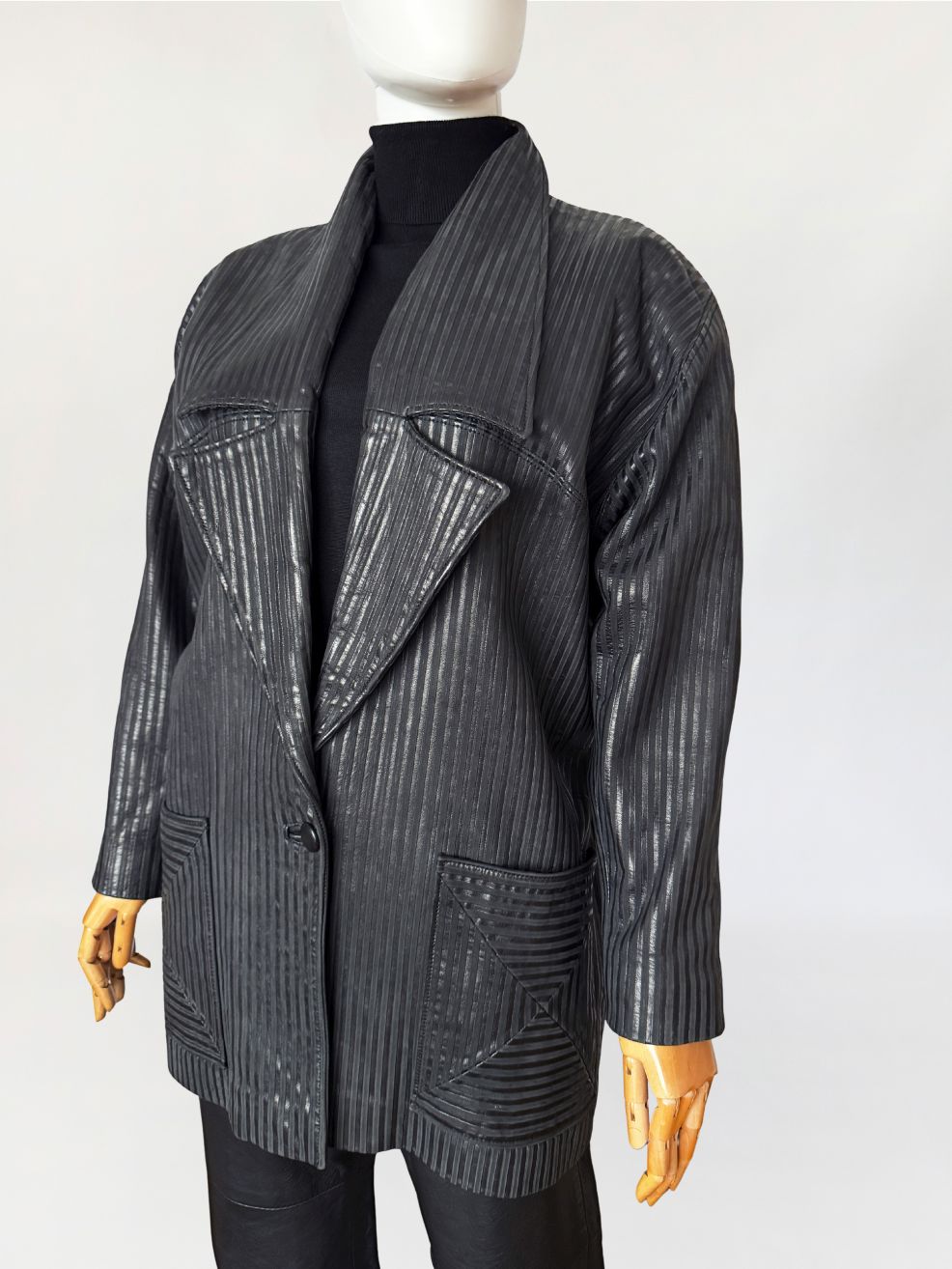 Kurtka/marynarka vintage z lat 80-tych, wykonana ze skóry naturalnej w pionowe, tłoczone prążki o efekcie 3D. Fason prosty, o długości sięgającej bioder, z mocno zaznaczoną linią ramion typu power shoulders. Przód z kołnierzem rewersowym i jednorzędowym zapięciem na guzik. Po bokach naszywane kieszenie o geometrycznej formie, z układem prążków prowadzonym pod innym kątem niż na korpusie. Rękawy długie, wszyte klasycznie, zachowujące objętość w górnej części. Tył prosty, z poziomym cięciem konstrukcyjnym w górnej partii pleców.