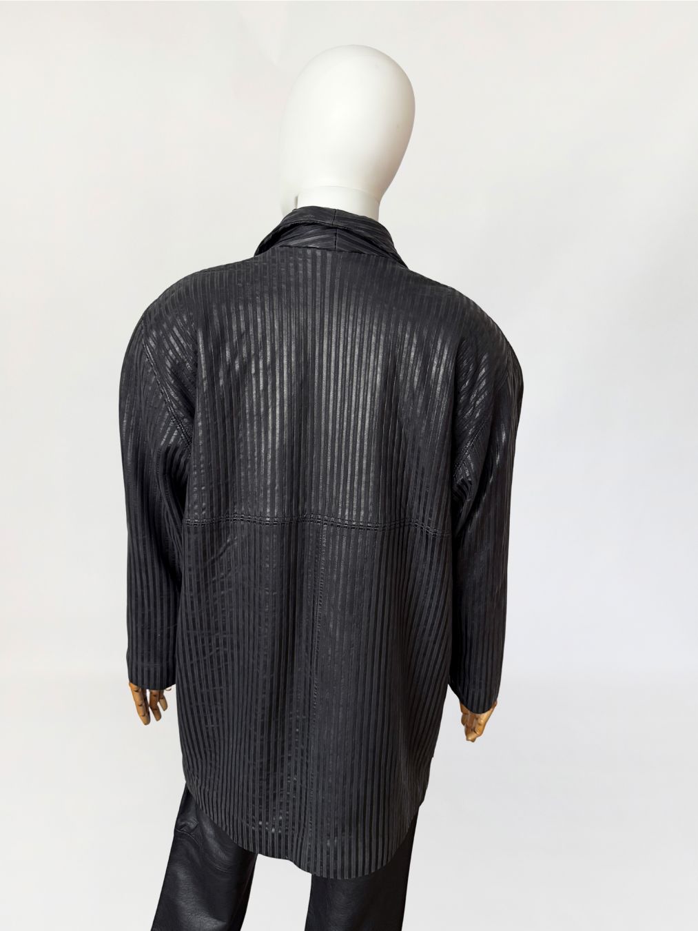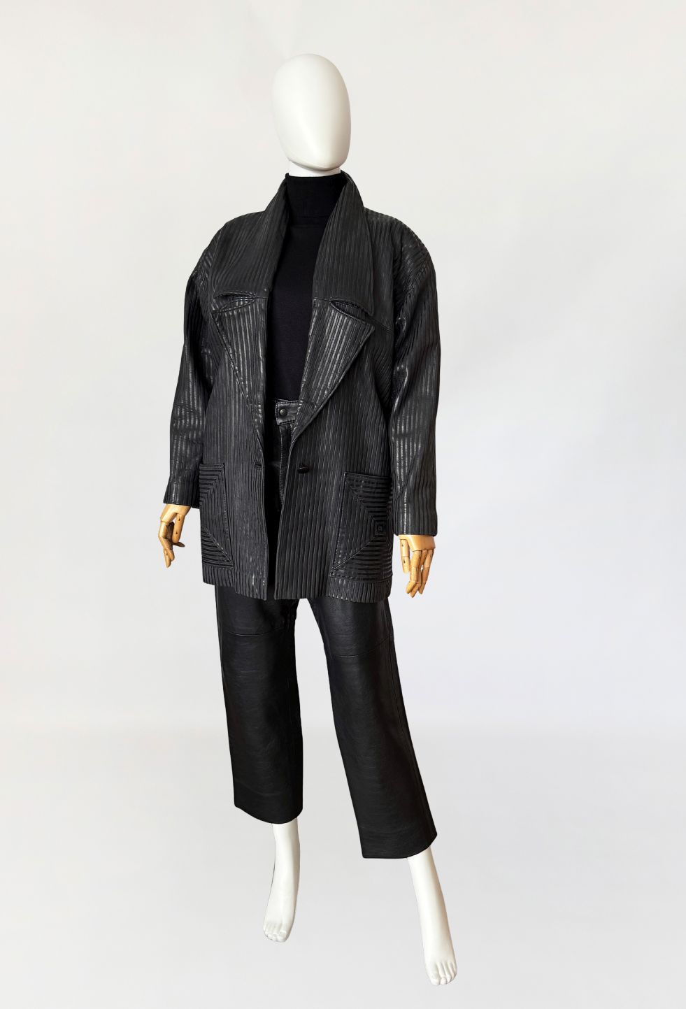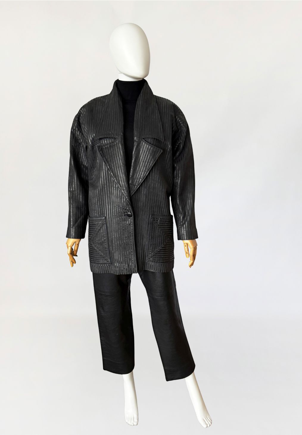 Kurtka/marynarka vintage z lat 80-tych, wykonana ze skóry naturalnej w pionowe, tłoczone prążki o efekcie 3D. Fason prosty, o długości sięgającej bioder, z mocno zaznaczoną linią ramion typu power shoulders. Przód z kołnierzem rewersowym i jednorzędowym zapięciem na guzik. Po bokach naszywane kieszenie o geometrycznej formie, z układem prążków prowadzonym pod innym kątem niż na korpusie. Rękawy długie, wszyte klasycznie, zachowujące objętość w górnej części. Tył prosty, z poziomym cięciem konstrukcyjnym w górnej partii pleców.