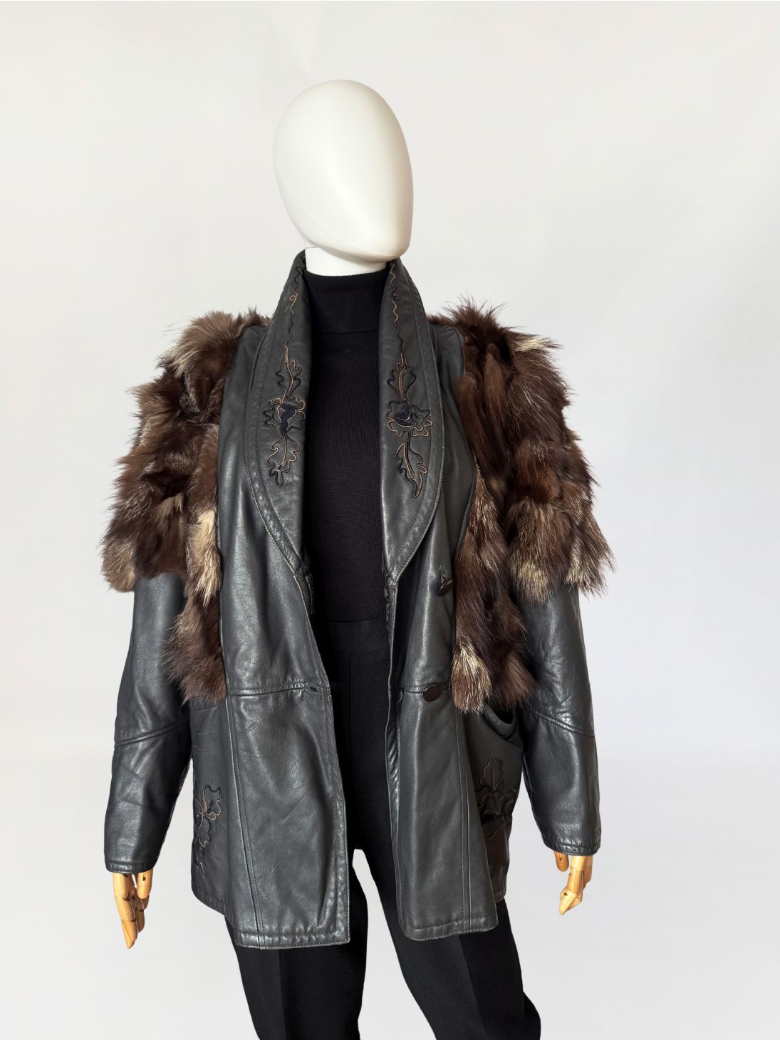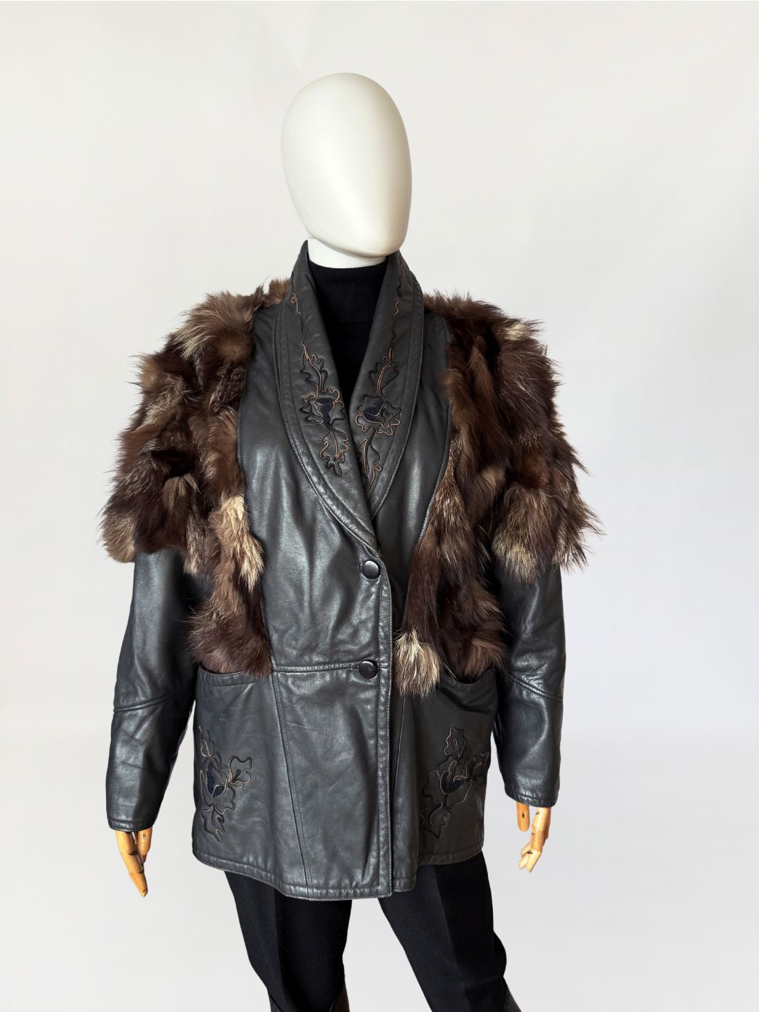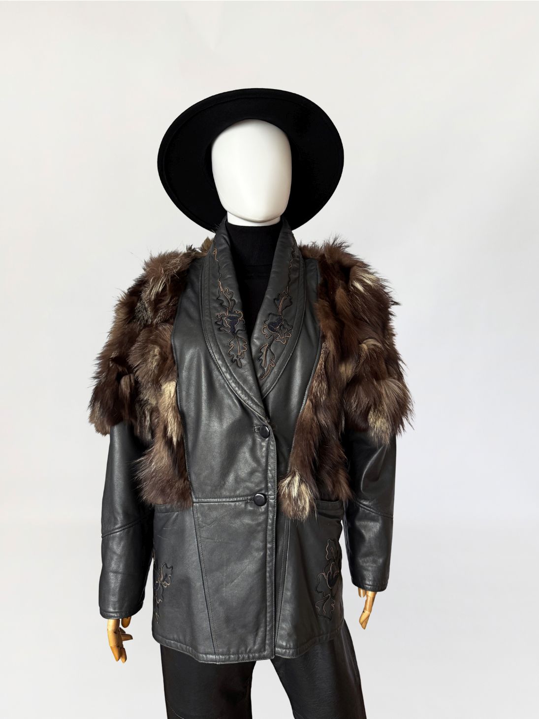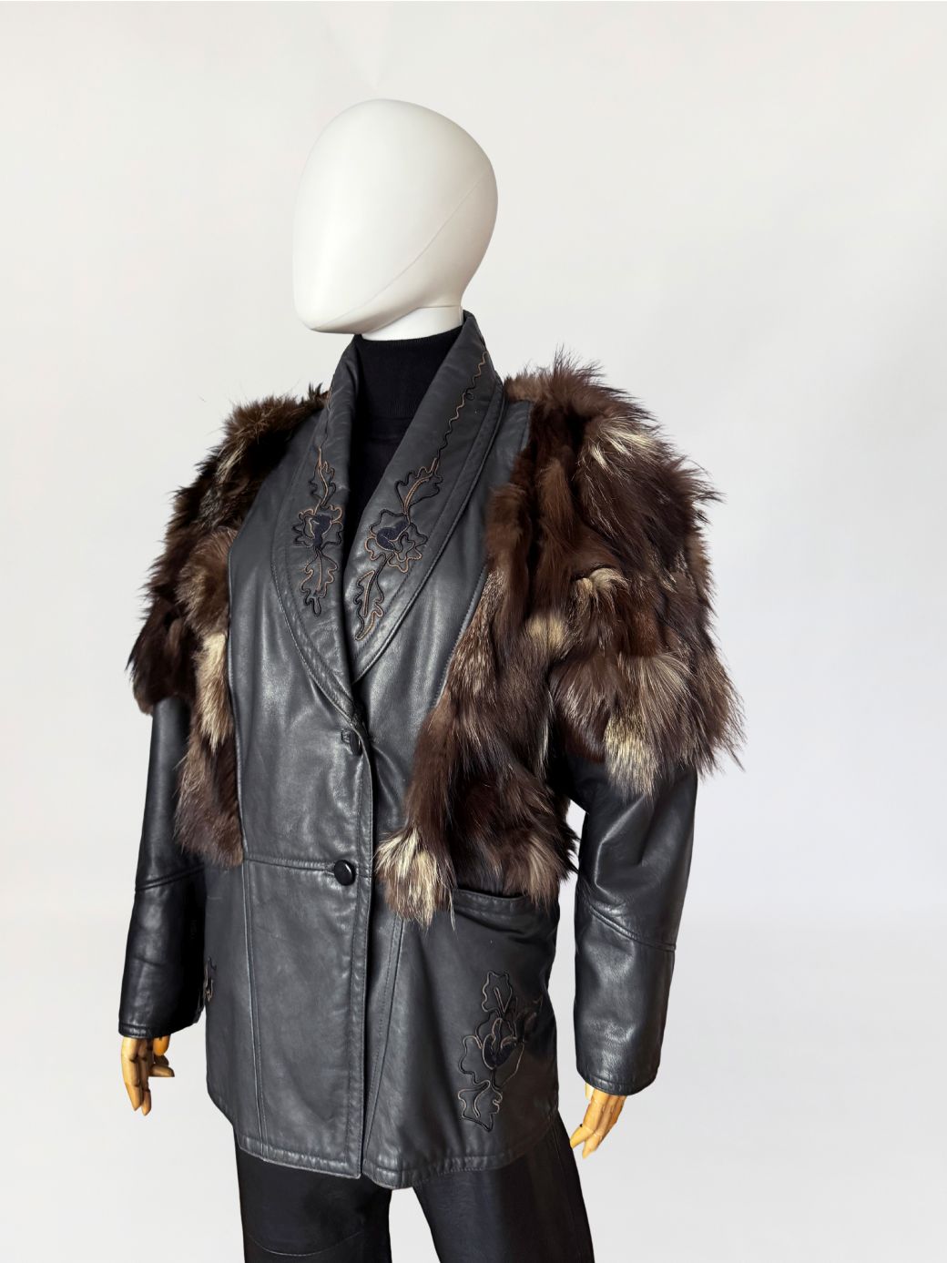 Włoska kurtka vintage z lat 80-tych, wykonana z miękkiej naturalnej skóry w grafitowo-szarym odcieniu, z rozbudowaną partią barków i pleców wykończoną naturalnym futrem o zróżnicowanej długości włosa i wyraźnym melanżu brązów, beżu i kremowych tonów. Model o lekko wydłużonym kroju, zapinany na powlekane guziki. Przód wykończony szerokimi klapami z dekoracyjnym haftem o motywie roślinnym, powtórzonym również w dolnych partiach kurtki. Haft prowadzony kontrastową nicią, czytelny na tle skóry. Futro naturalne naszywane na konstrukcję kurtki obejmuje barki oraz górną część pleców, tworząc zwartą, estetyczną formę. W dolnej części wsuwane kieszenie.