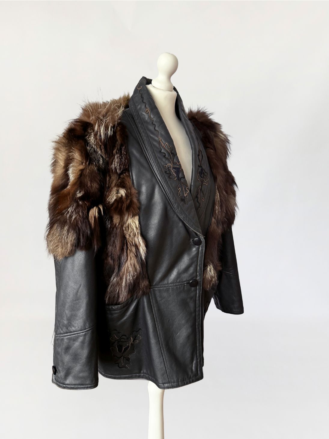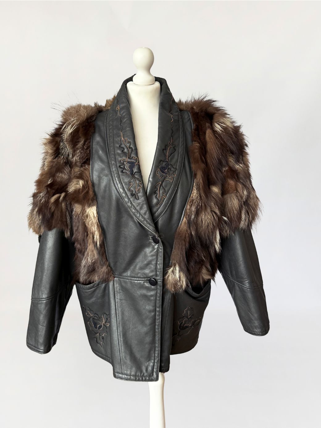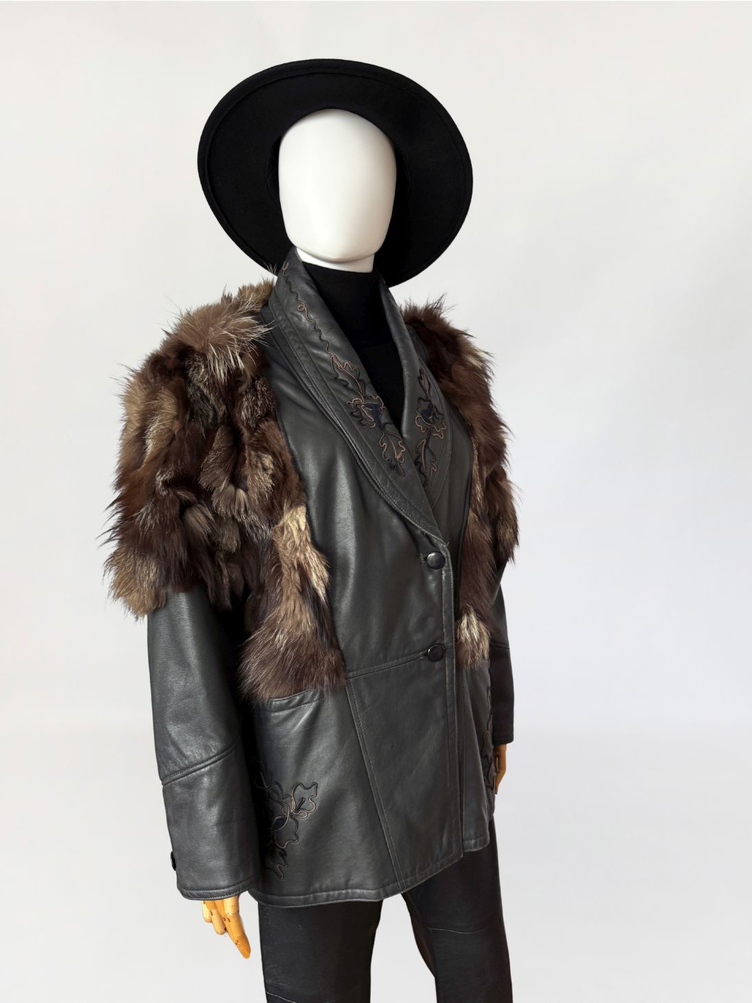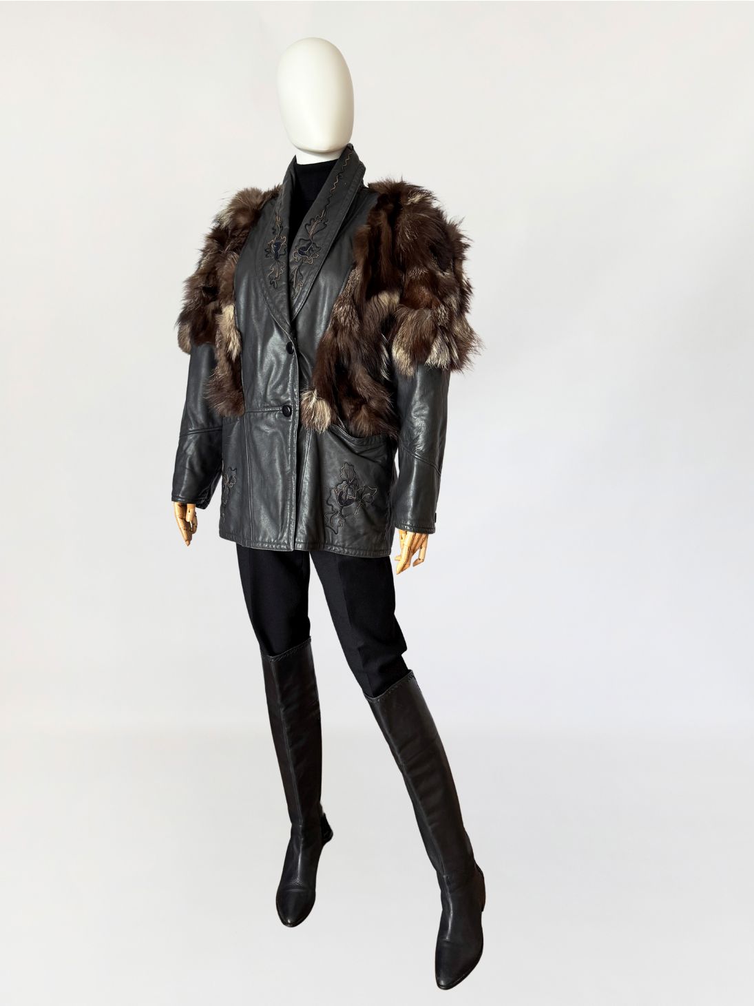 Włoska kurtka vintage z lat 80-tych, wykonana z miękkiej naturalnej skóry w grafitowo-szarym odcieniu, z rozbudowaną partią barków i pleców wykończoną naturalnym futrem o zróżnicowanej długości włosa i wyraźnym melanżu brązów, beżu i kremowych tonów. Model o lekko wydłużonym kroju, zapinany na powlekane guziki. Przód wykończony szerokimi klapami z dekoracyjnym haftem o motywie roślinnym, powtórzonym również w dolnych partiach kurtki. Haft prowadzony kontrastową nicią, czytelny na tle skóry. Futro naturalne naszywane na konstrukcję kurtki obejmuje barki oraz górną część pleców, tworząc zwartą, estetyczną formę. W dolnej części wsuwane kieszenie.