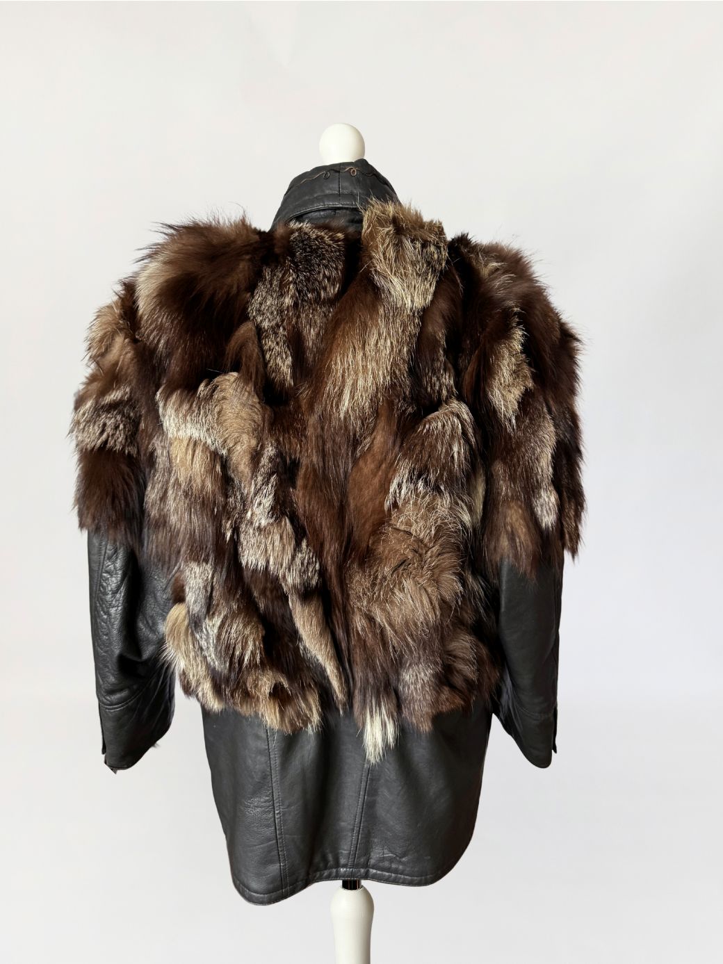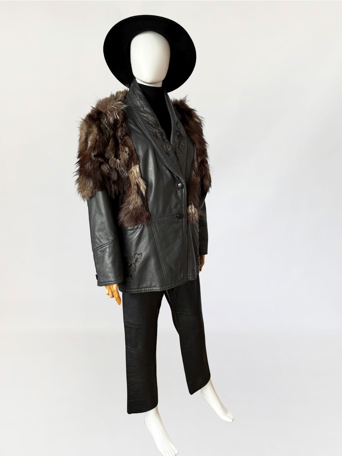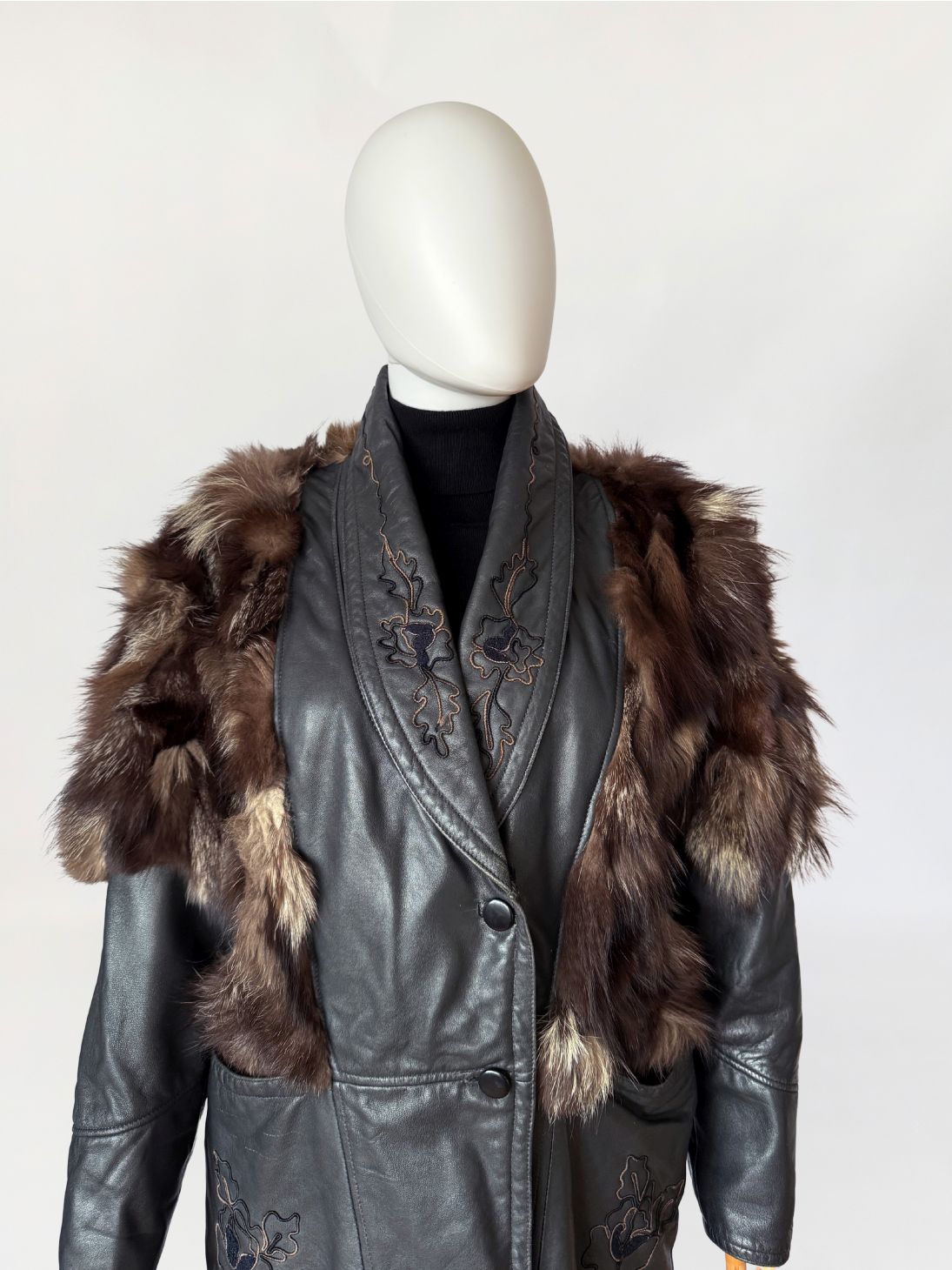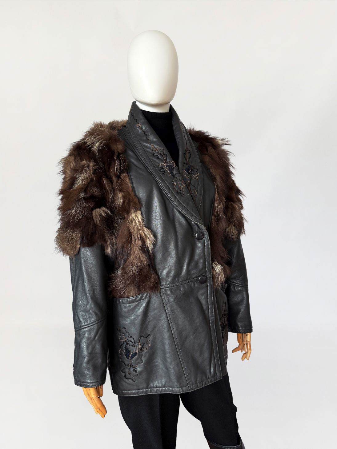 Włoska kurtka vintage z lat 80-tych, wykonana z miękkiej naturalnej skóry w grafitowo-szarym odcieniu, z rozbudowaną partią barków i pleców wykończoną naturalnym futrem o zróżnicowanej długości włosa i wyraźnym melanżu brązów, beżu i kremowych tonów. Model o lekko wydłużonym kroju, zapinany na powlekane guziki. Przód wykończony szerokimi klapami z dekoracyjnym haftem o motywie roślinnym, powtórzonym również w dolnych partiach kurtki. Haft prowadzony kontrastową nicią, czytelny na tle skóry. Futro naturalne naszywane na konstrukcję kurtki obejmuje barki oraz górną część pleców, tworząc zwartą, estetyczną formę. W dolnej części wsuwane kieszenie.