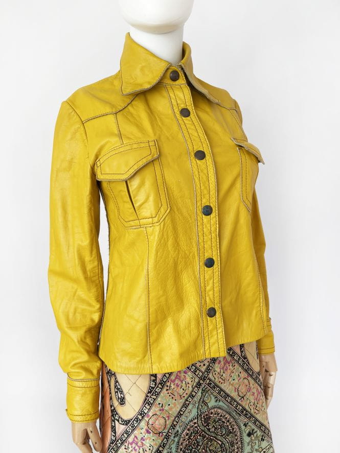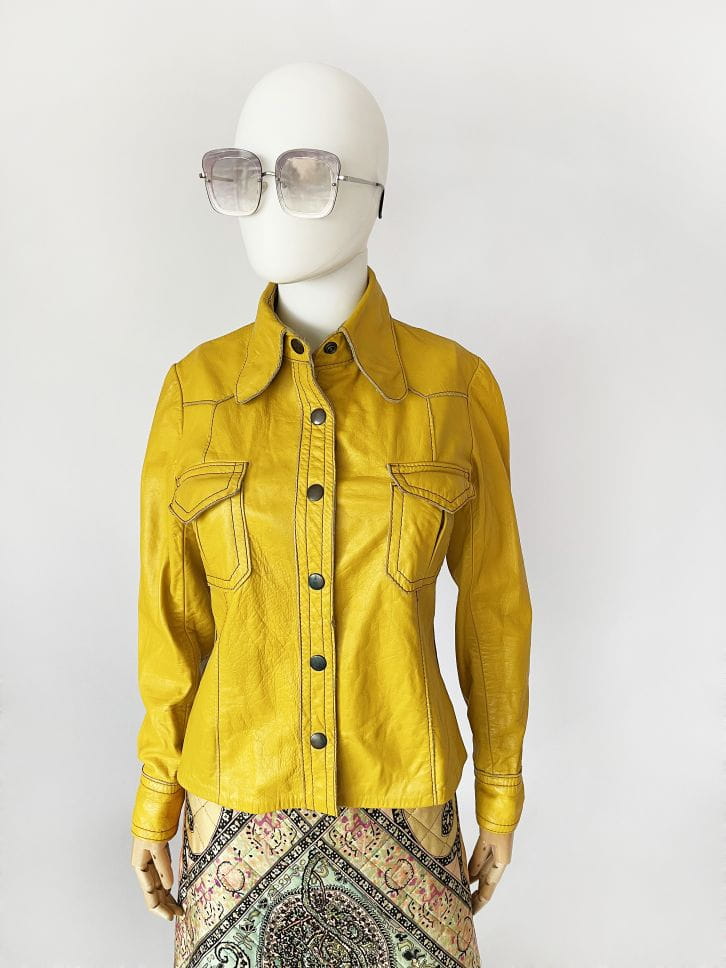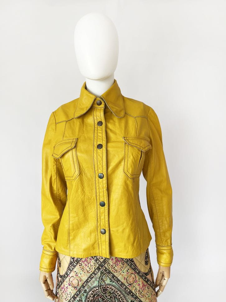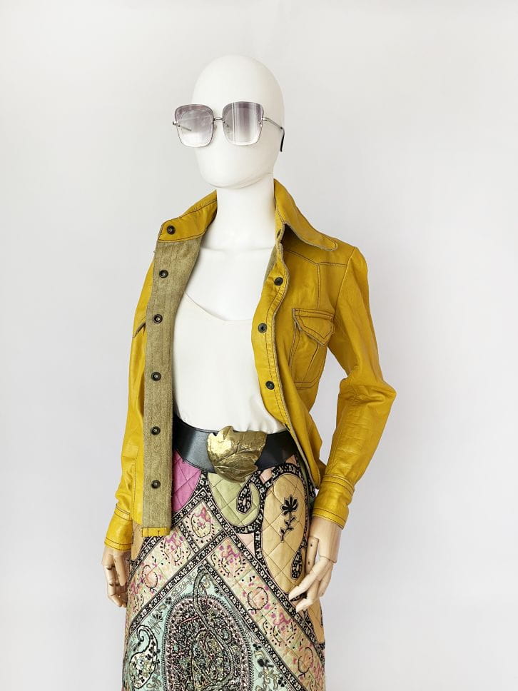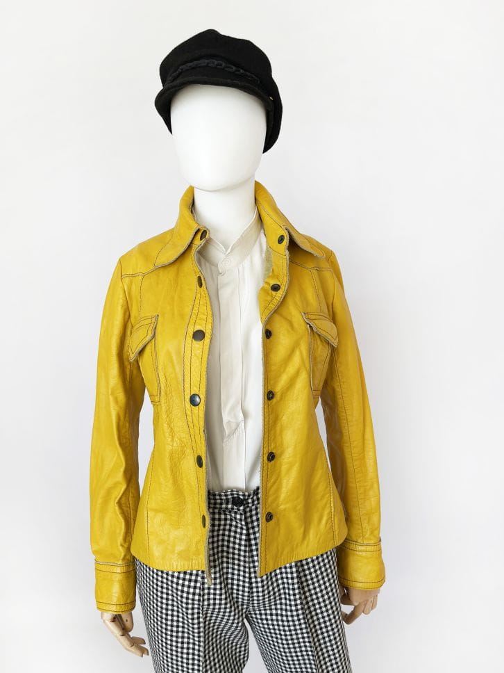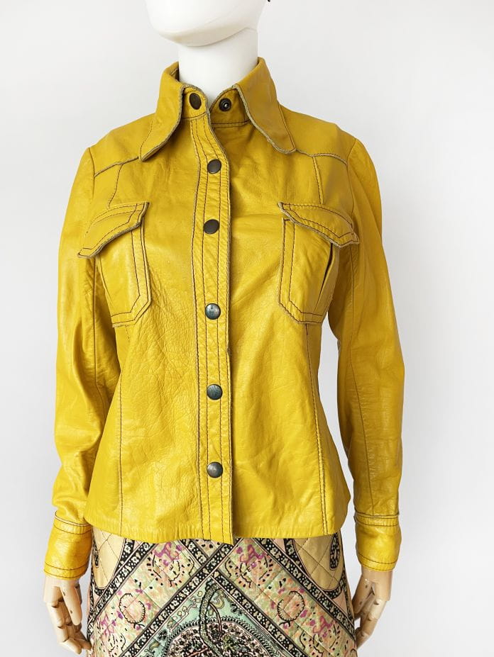 Totalny unikat. Obłędna kurtka vintage z lat 70-tych, wykonana z miękkiej skóry naturalnej w kolorze kurkumy. Kontrastowe szwy w czekoladowym odcieniu. Dopasowany fason z długimi rękawami. Zapinana na metalowe zatrzaski. U góry kołnierz. Na wysokości biustu symetryczne kieszenie z patkami. Kurtka nie ma podszewki. Można nosić ją jako koszulę (np na top), ze względu na jej dopasowany fason. Skóra jest świetnej jakości, solidna a zarazem dość elastyczna przy poruszaniu się. Przy odpowiedniej pielęgnacji przetrwa kolejne dekady.