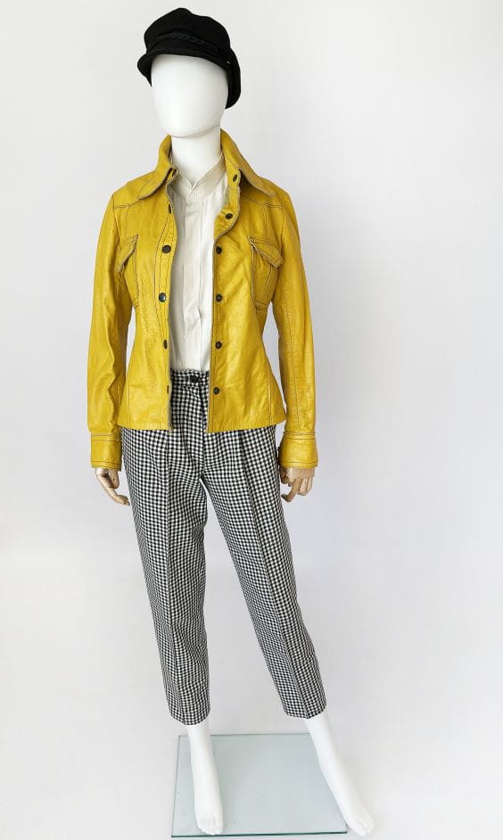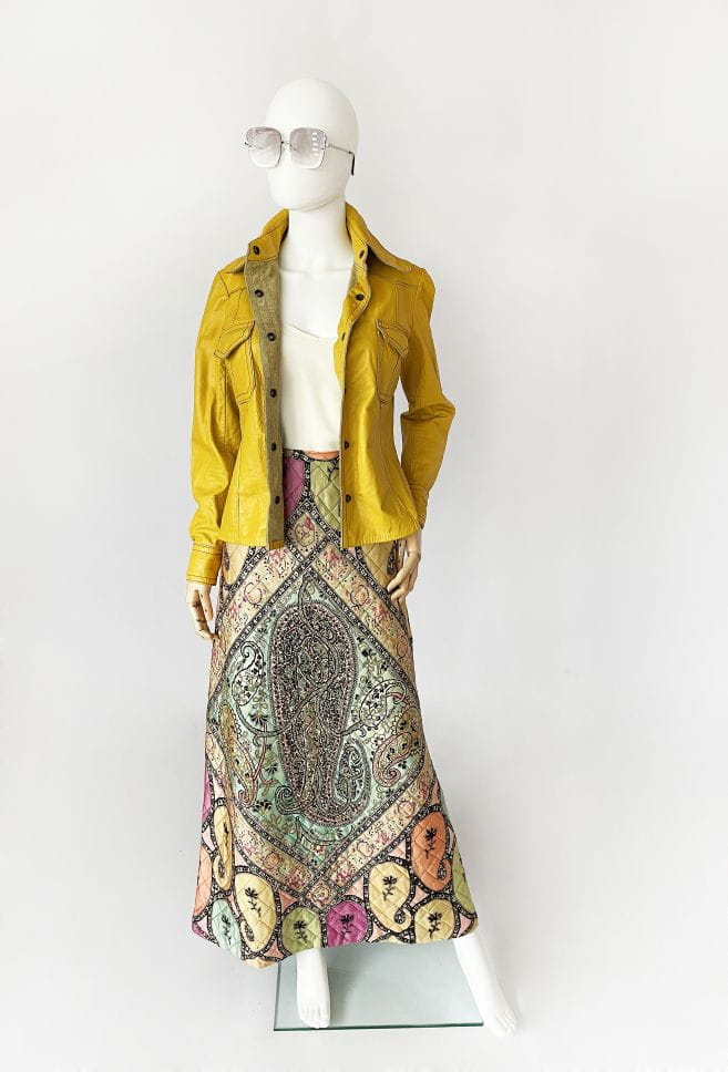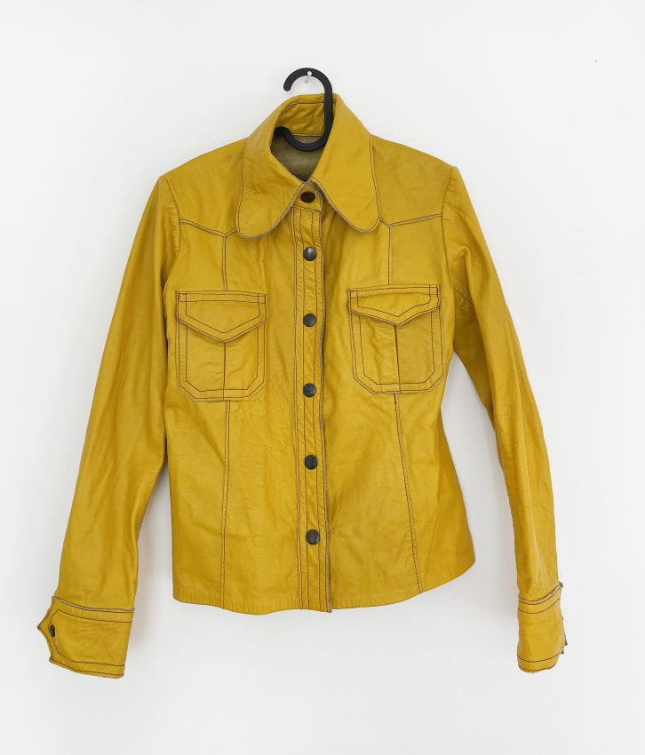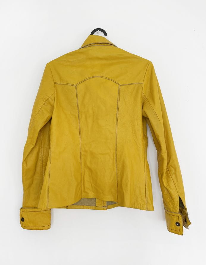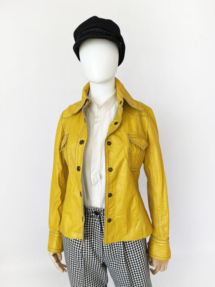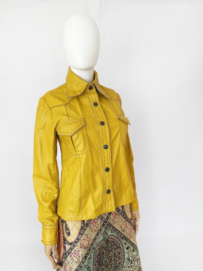 Totalny unikat. Obłędna kurtka vintage z lat 70-tych, wykonana z miękkiej skóry naturalnej w kolorze kurkumy. Kontrastowe szwy w czekoladowym odcieniu. Dopasowany fason z długimi rękawami. Zapinana na metalowe zatrzaski. U góry kołnierz. Na wysokości biustu symetryczne kieszenie z patkami. Kurtka nie ma podszewki. Można nosić ją jako koszulę (np na top), ze względu na jej dopasowany fason. Skóra jest świetnej jakości, solidna a zarazem dość elastyczna przy poruszaniu się. Przy odpowiedniej pielęgnacji przetrwa kolejne dekady.