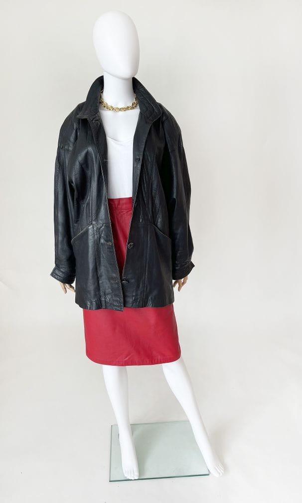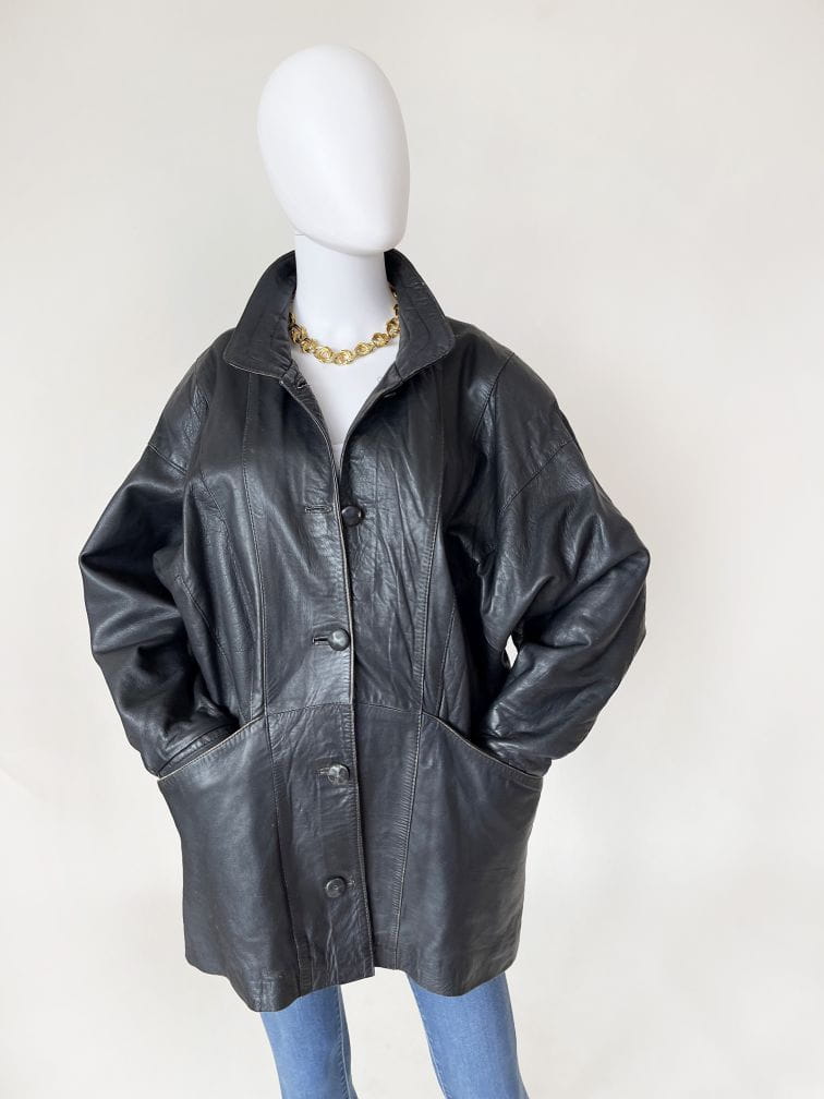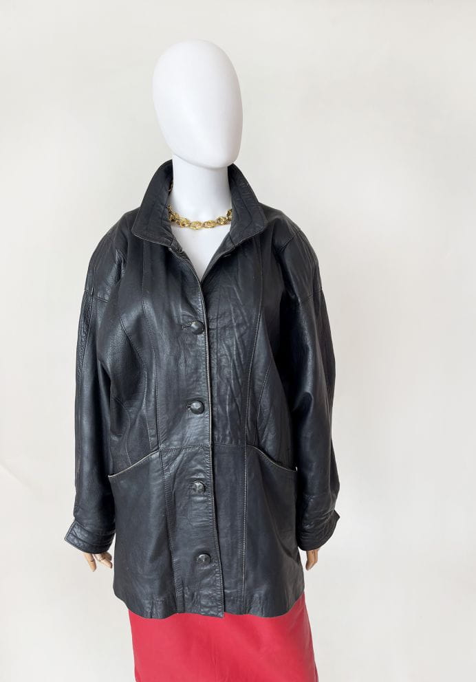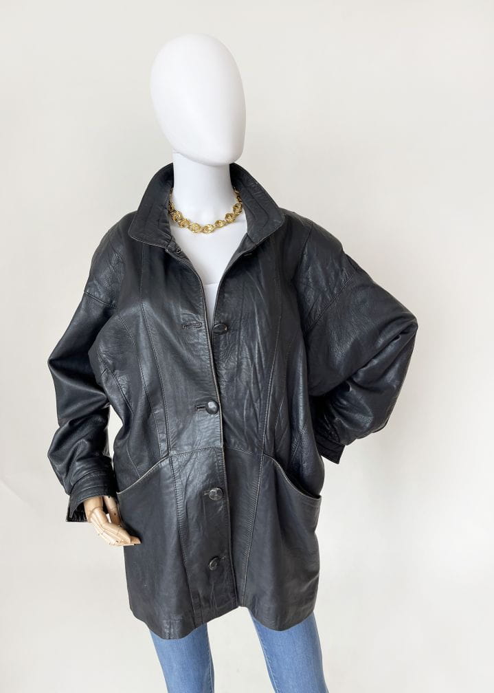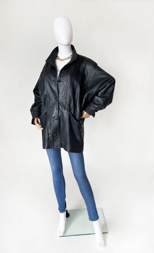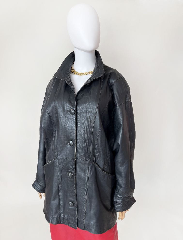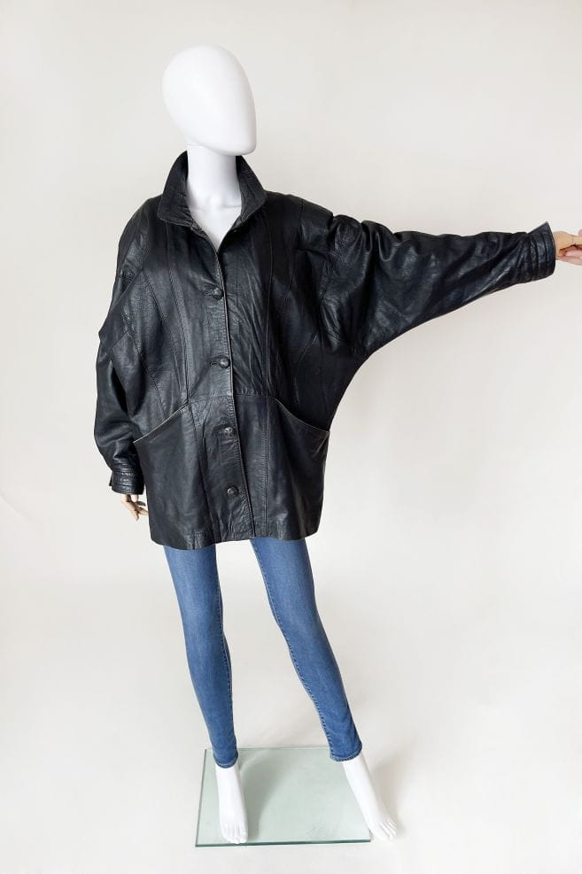 Skórzana kurtka vintage z lat 80-tych. Oversizowy model z obniżoną linią pach. Rękawy mocno szerokie w ramionach, zwężają się ku mankietom. Wsuwane kieszenie po bokach. Zapinana na oblekane guziki.