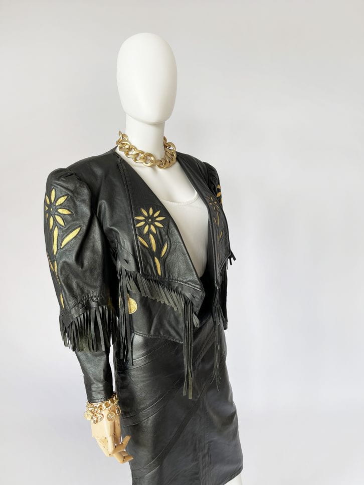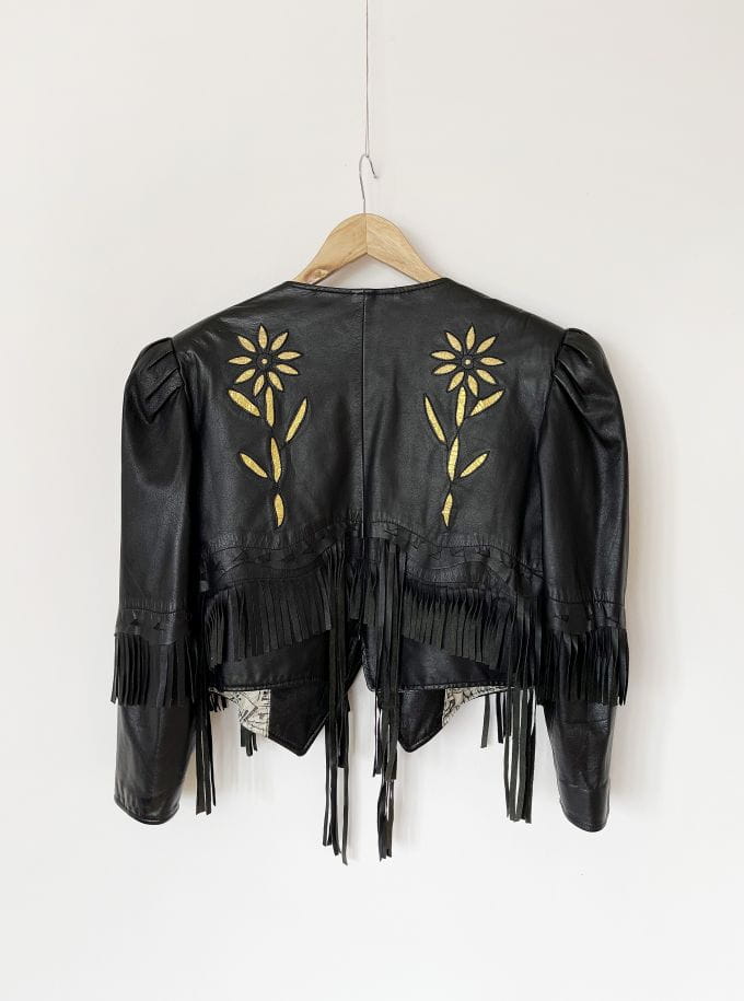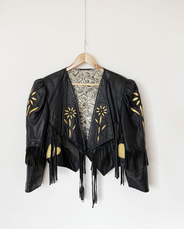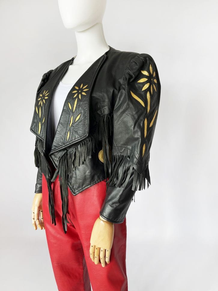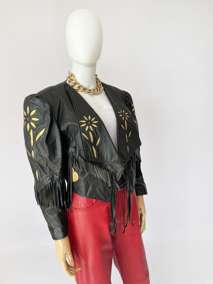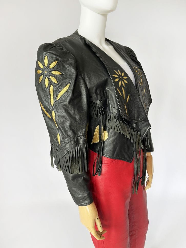 Zjawiskowa kurtka vintage wykonana z naturalnej cielęcej skóry nappa, która kochamy za jej miękkość, a jednocześnie dużą odpornośćpozostając przy na czynniki zewnętrzne. Kurtka to model vintage z lat 80/90, zachowany w doskonałym stanie. Ma krótki otwarty fason i długie rękawy lekko bufiaste w ramionach. Wzdłuż rękawów, na połach, plecach oraz w dolnej partii kurtki dekoracyjne aplikacje ze złotej skórki. Na rękawach i połach w kształcie kwiatów, u dołu w formie serc. Długie skórzane frędzle dodają jej westernowego i lekko zadziornego charakteru.
