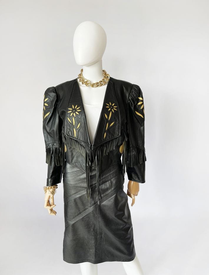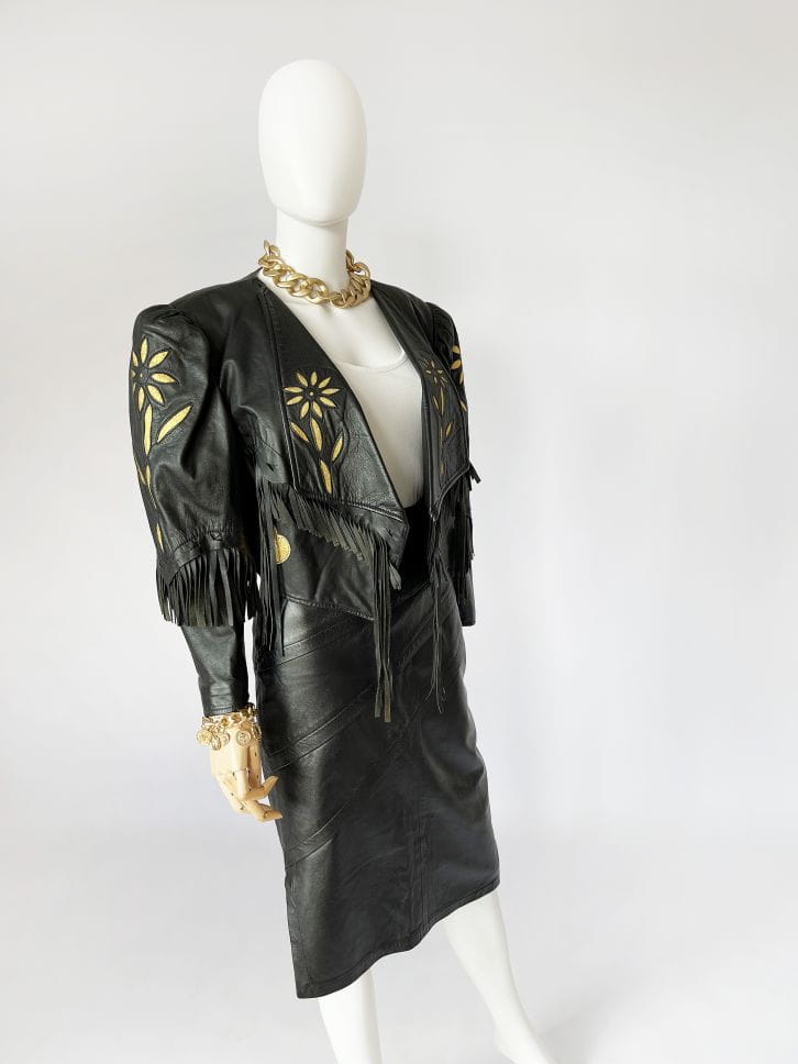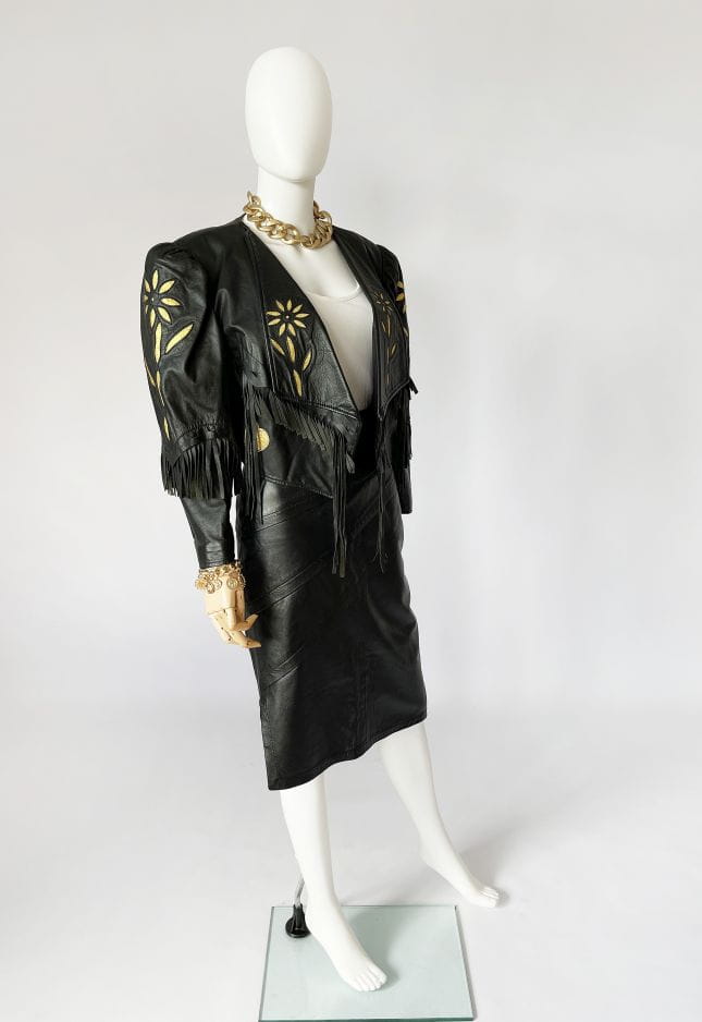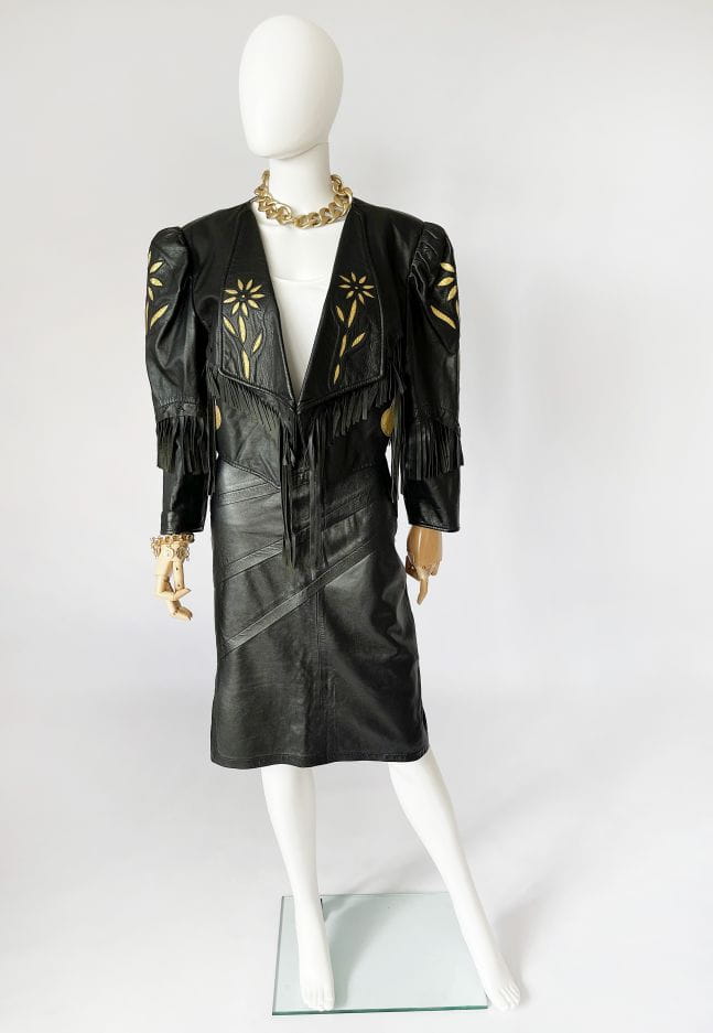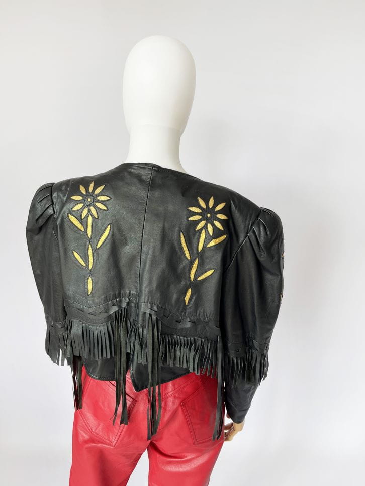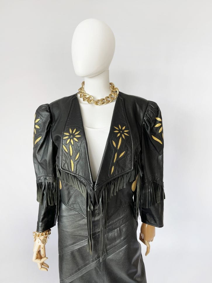 Zjawiskowa kurtka vintage wykonana z naturalnej cielęcej skóry nappa, która kochamy za jej miękkość, a jednocześnie dużą odpornośćpozostając przy na czynniki zewnętrzne. Kurtka to model vintage z lat 80/90, zachowany w doskonałym stanie. Ma krótki otwarty fason i długie rękawy lekko bufiaste w ramionach. Wzdłuż rękawów, na połach, plecach oraz w dolnej partii kurtki dekoracyjne aplikacje ze złotej skórki. Na rękawach i połach w kształcie kwiatów, u dołu w formie serc. Długie skórzane frędzle dodają jej westernowego i lekko zadziornego charakteru.