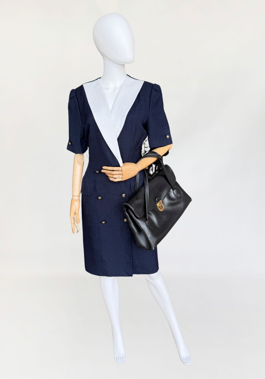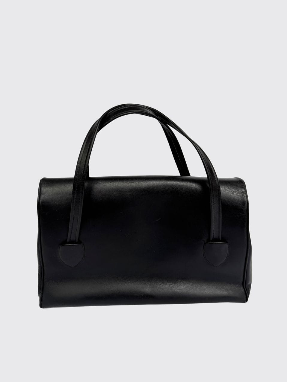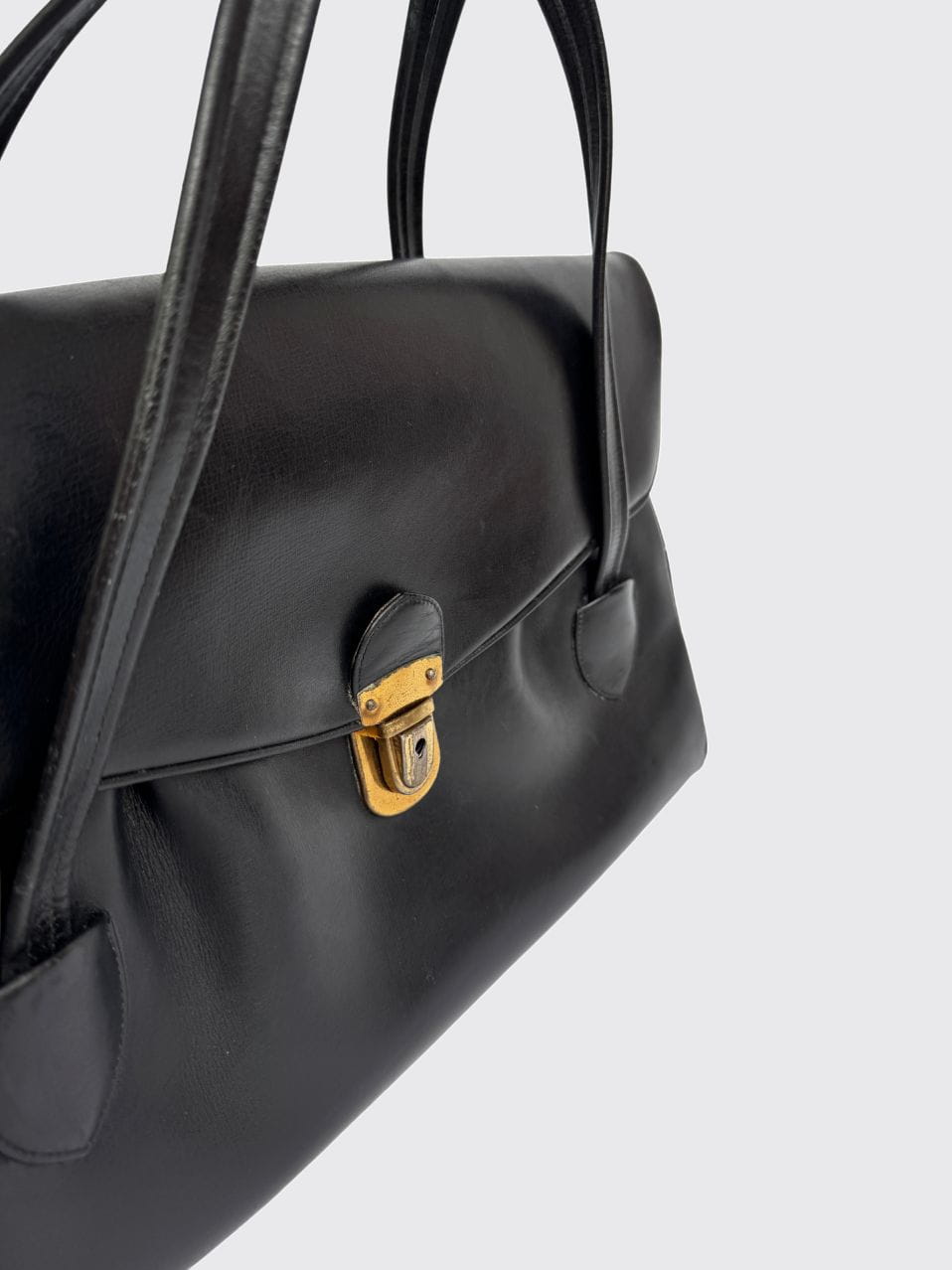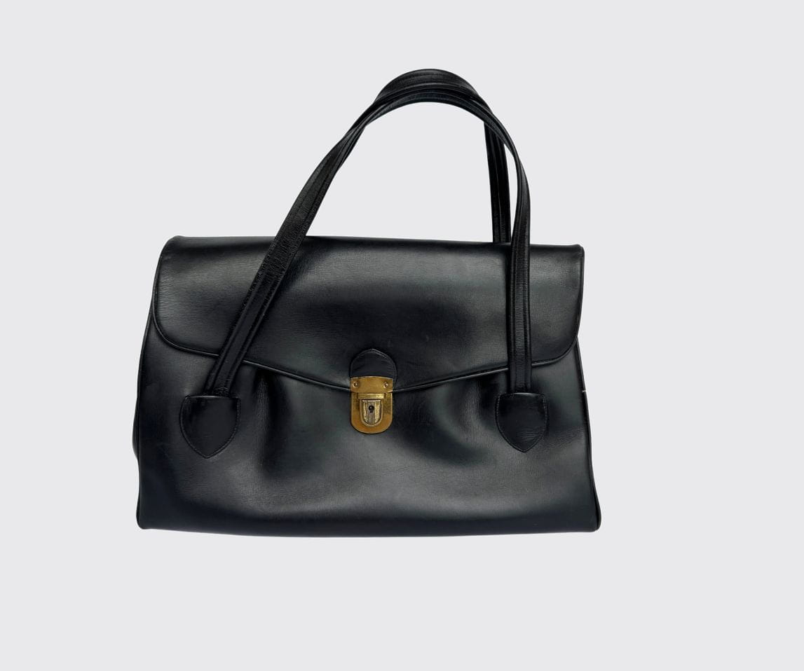 Oryginalna torba true vintage w stylu lat 40-stych, wykonana z czarnej naturalnej skóry. Klasyczny model z wysokimi uchwytami, umożliwiający noszenie zarówno w dłoni, jak i na ramieniu. Konstrukcja dość obszerna, o funkcjonalnej, pojemnej formie. Wewnątrz główna komora oraz dwie mniejsze przegródki, ułatwiające organizację. Całość solidnie wykończona.