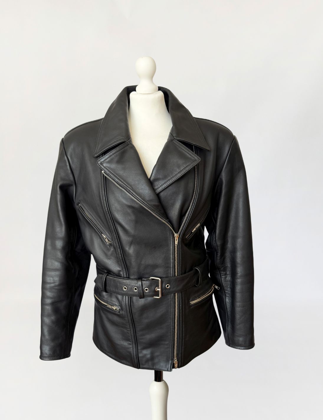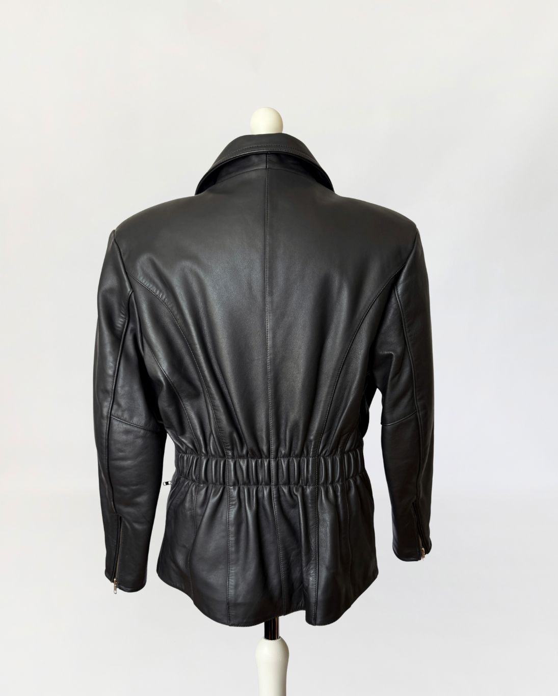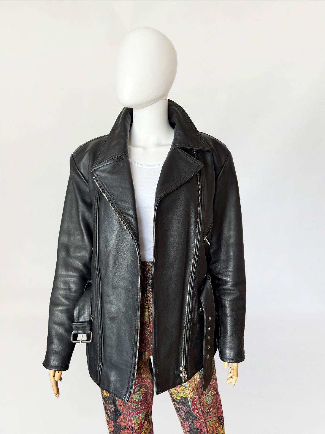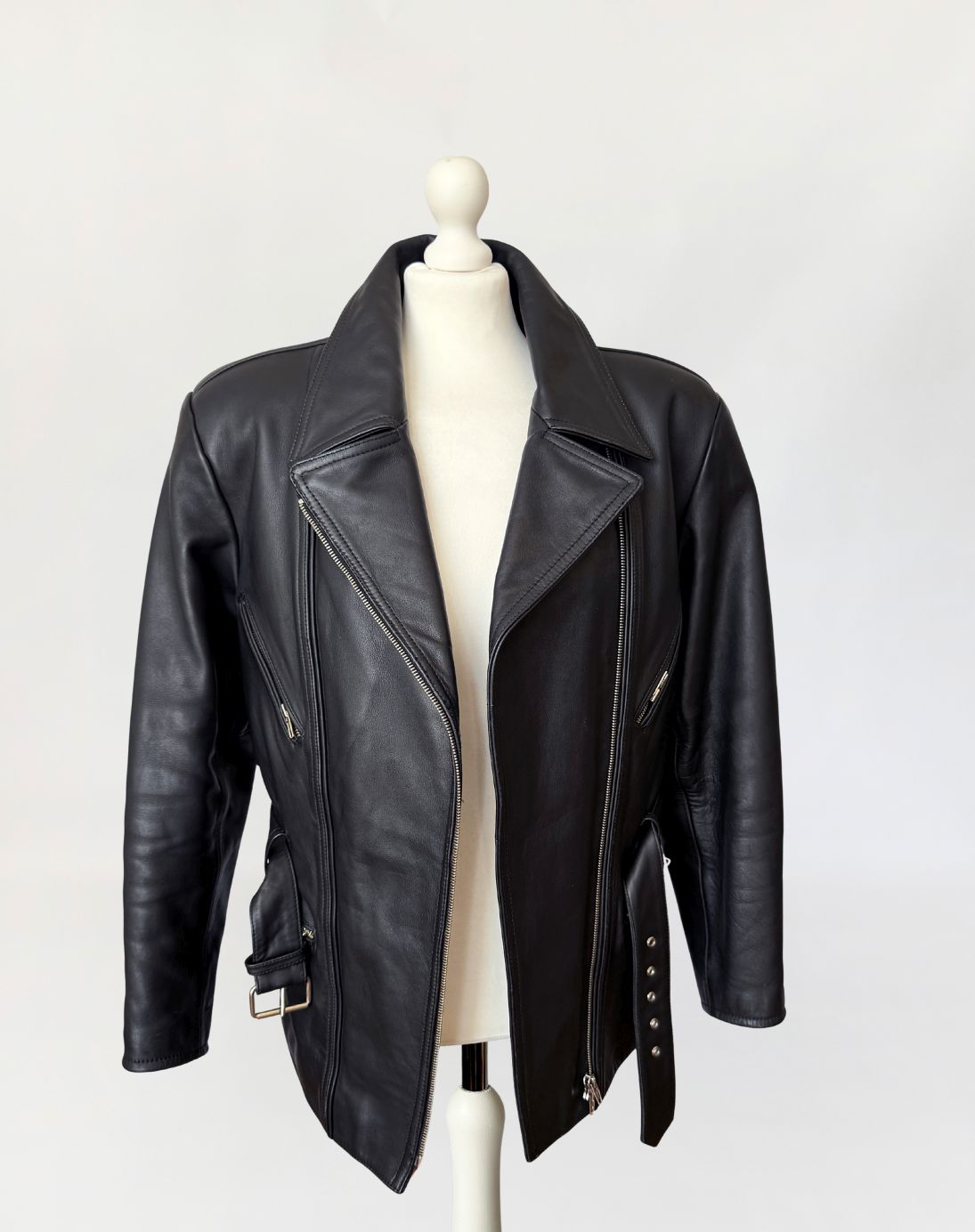 Kurtka vintage z lat 80-tych wykonana z grubej, ciężkiej skóry bydlęcej w czarnym kolorze. Model o wydłużonym fasonie, zapinany asymetrycznie na metalowy zamek. Talia podkreślona wszytym marszczeniem na plecach, oraz paskiem z klamrą, charakterystyczne rozwiązanie dla mody motocyklowej tamtego okresu. Front zdobią cztery kieszenie zapinane na zamki, rozmieszczone pod skosem i poziomo, co nadaje całości rytmiczną, wyrazistą linię. Fason lekko zwężany do dołu, w górnej części duży rewersowy kołnierz i długie rękawy zakończone zamkami, podkreślające jej funkcjonalny charakter. Model czerpie inspiracje z estetyki motocyklowej lat 80-tych – surowy, ciężki, zaprojektowany z myślą o trwałości i mocnej formie.