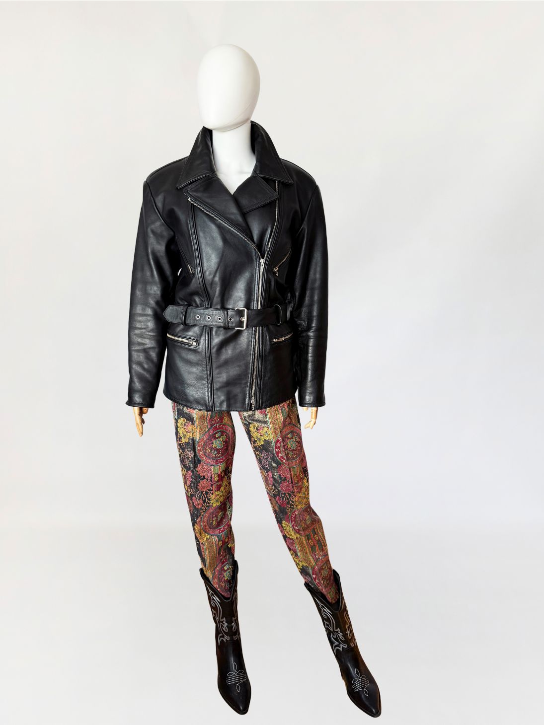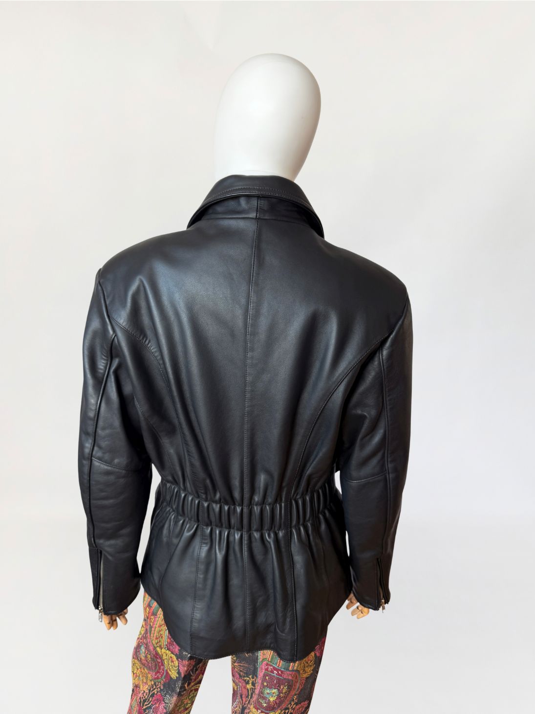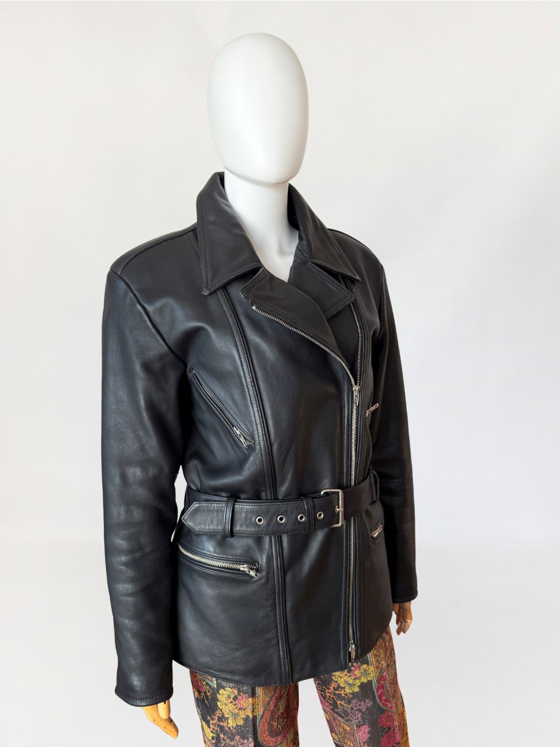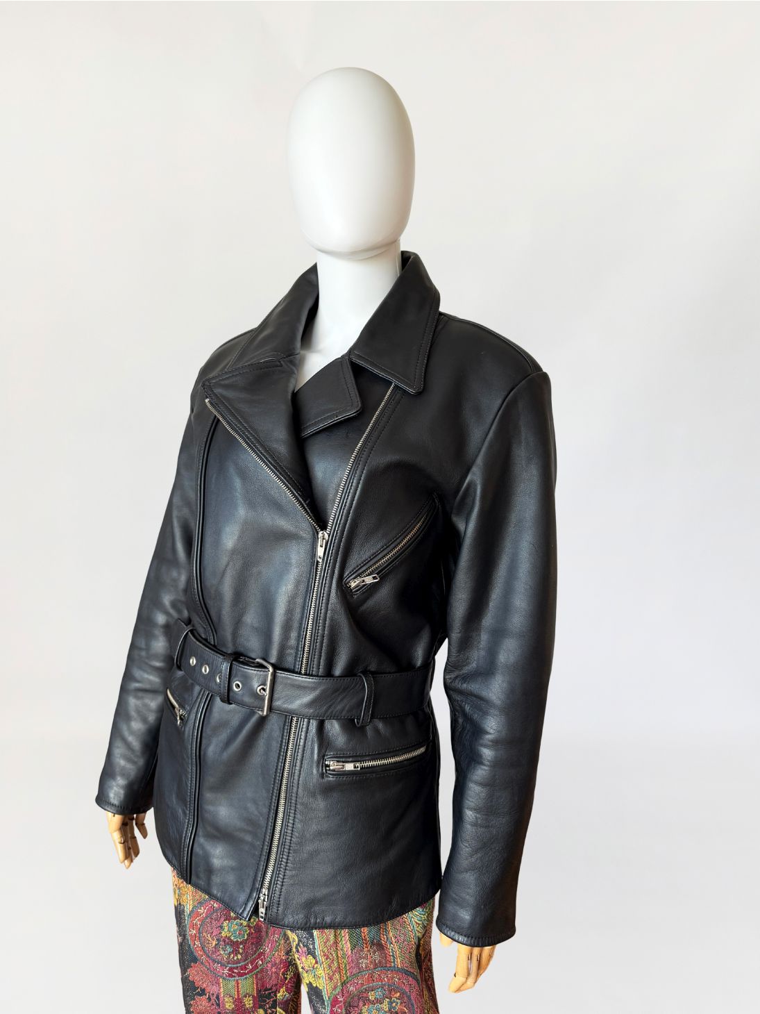 Kurtka vintage z lat 80-tych wykonana z grubej, ciężkiej skóry bydlęcej w czarnym kolorze. Model o wydłużonym fasonie, zapinany asymetrycznie na metalowy zamek. Talia podkreślona wszytym marszczeniem na plecach, oraz paskiem z klamrą, charakterystyczne rozwiązanie dla mody motocyklowej tamtego okresu. Front zdobią cztery kieszenie zapinane na zamki, rozmieszczone pod skosem i poziomo, co nadaje całości rytmiczną, wyrazistą linię. Fason lekko zwężany do dołu, w górnej części duży rewersowy kołnierz i długie rękawy zakończone zamkami, podkreślające jej funkcjonalny charakter. Model czerpie inspiracje z estetyki motocyklowej lat 80-tych – surowy, ciężki, zaprojektowany z myślą o trwałości i mocnej formie.