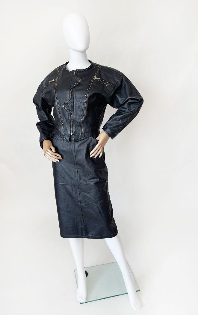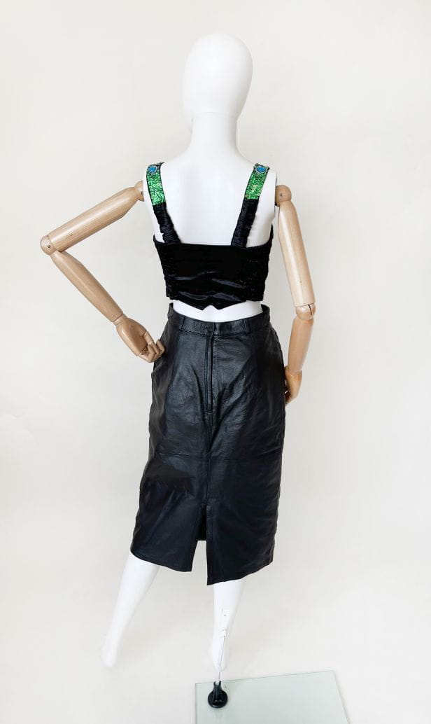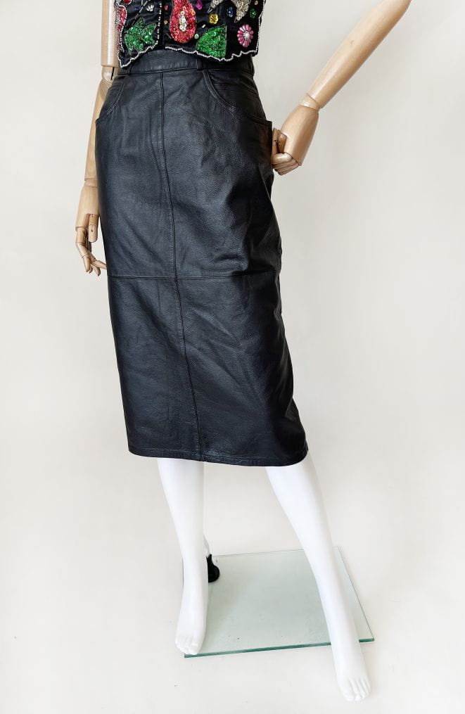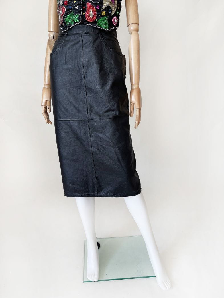 Skórzana spódnica vintage wykonana z naturalnej skóry w kolorze czarnym. Ołówkowy fason z wysokim stanem, długość midi. Z tyłu u dołu rozporek.
