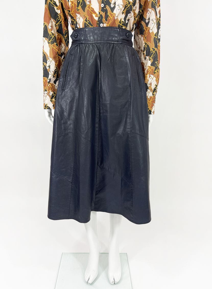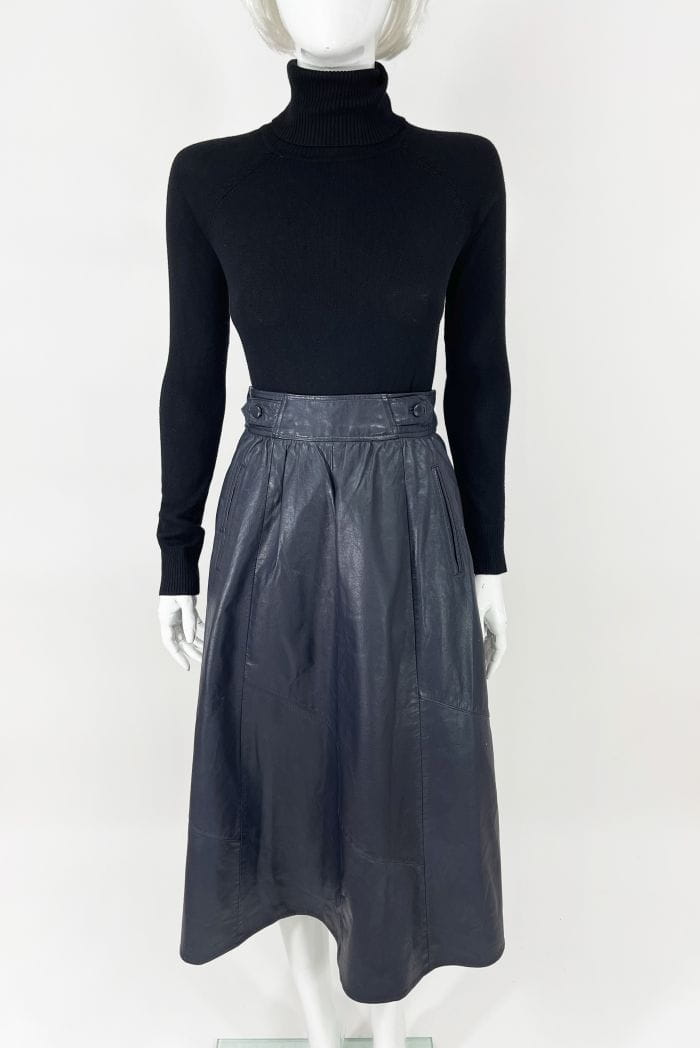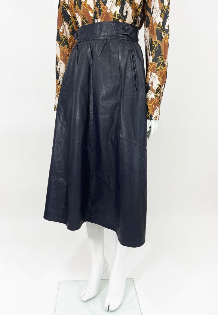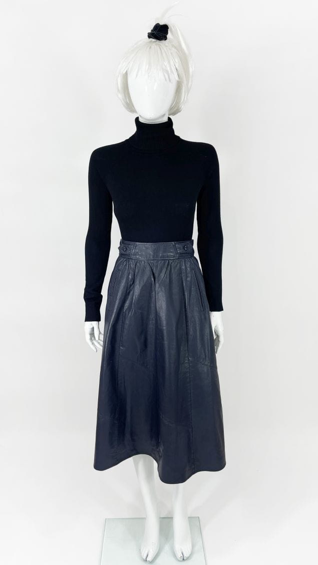 Długa spódnica vintage o rozkloszowanym kroju. Wykonana ze skóry naturalnej w odcieniu granatowej czerni. Wyższy stan, zapinana w talii. Po bokach wsuwane kieszenie. Model z podszewką.
