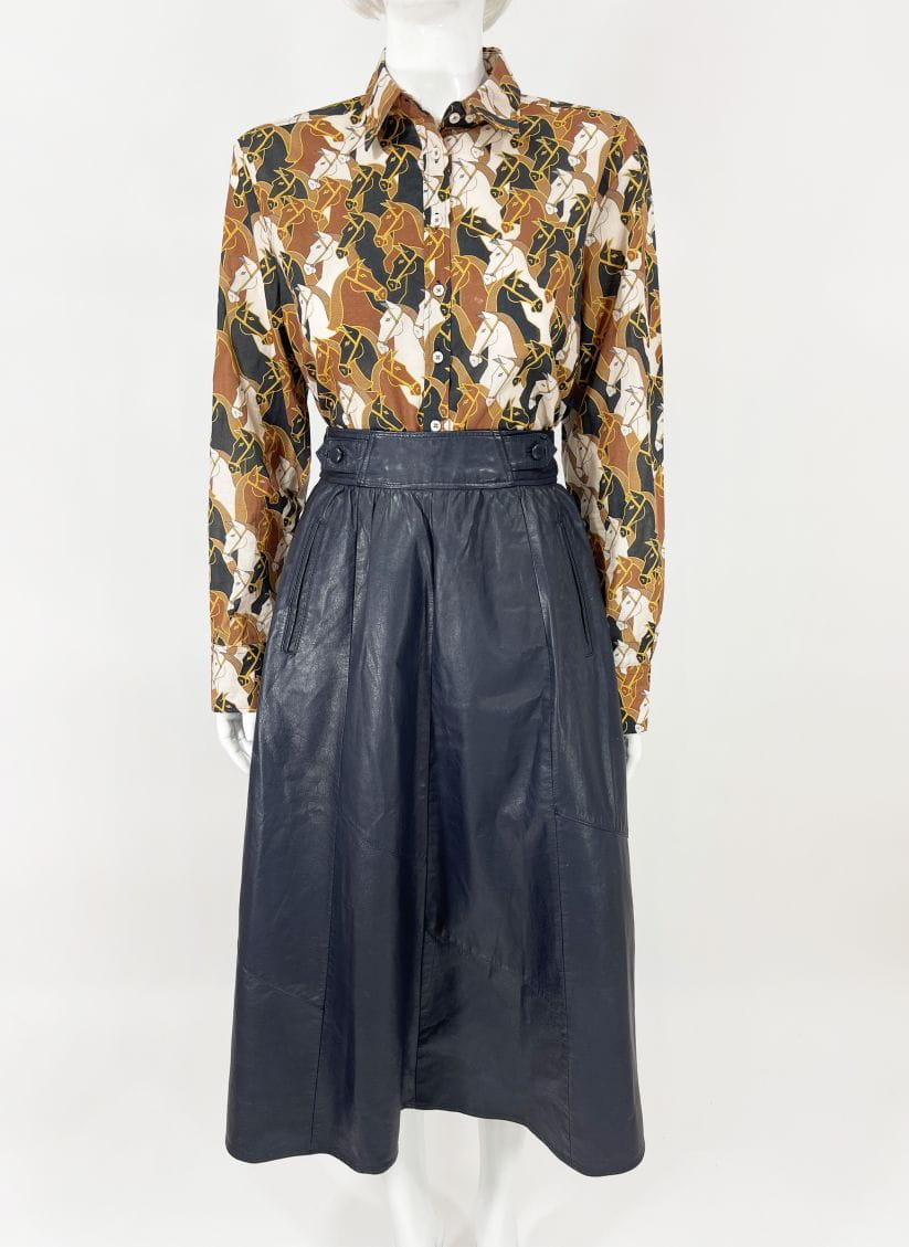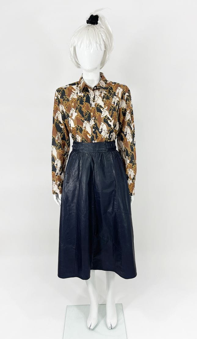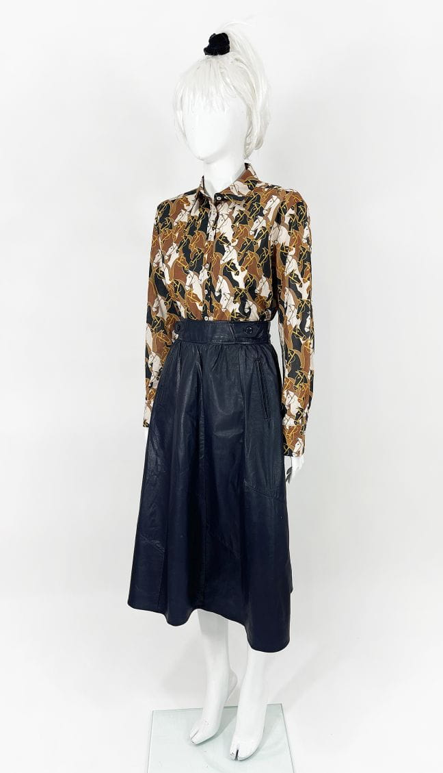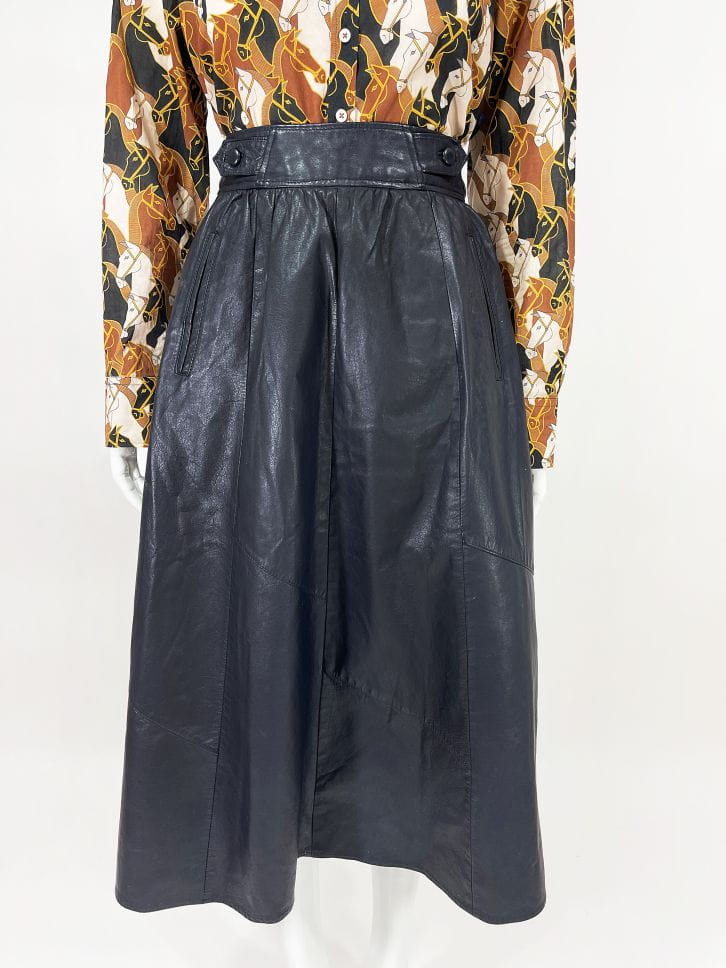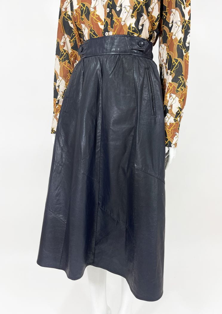 Długa spódnica vintage o rozkloszowanym kroju. Wykonana ze skóry naturalnej w odcieniu granatowej czerni. Wyższy stan, zapinana w talii. Po bokach wsuwane kieszenie. Model z podszewką.