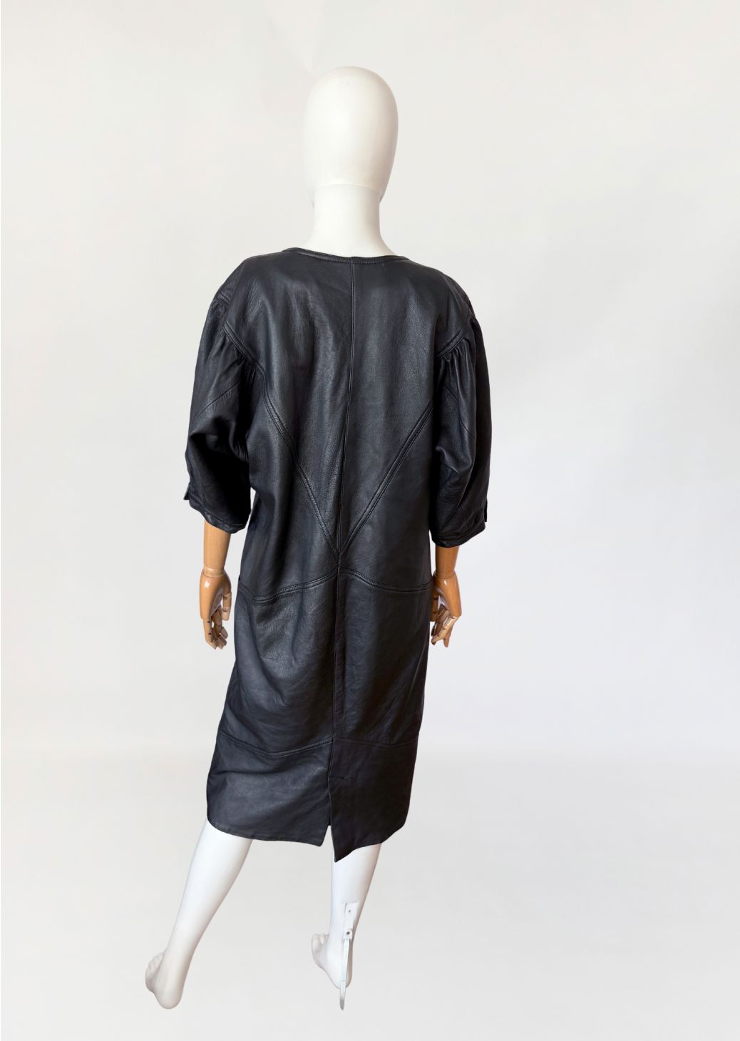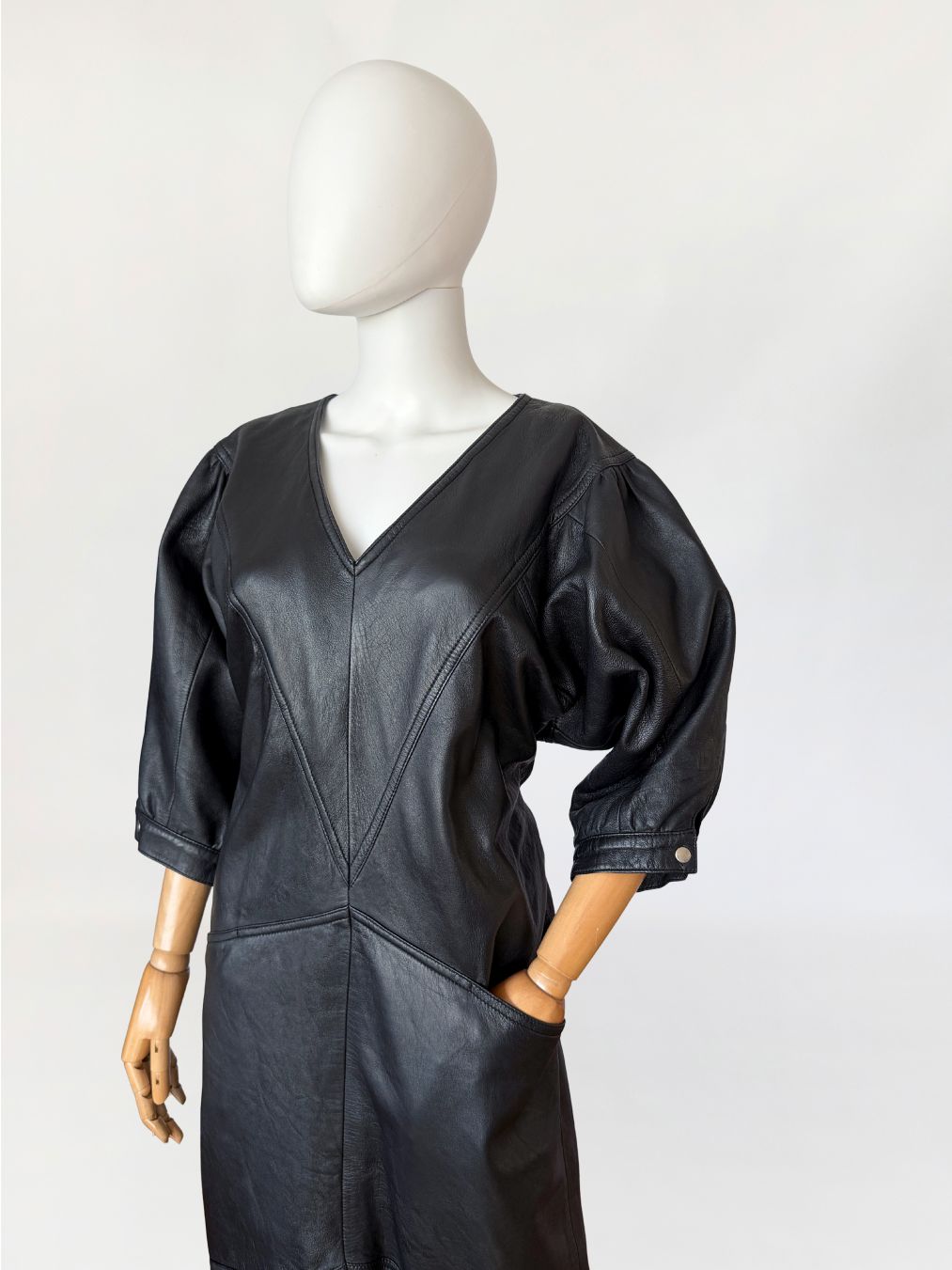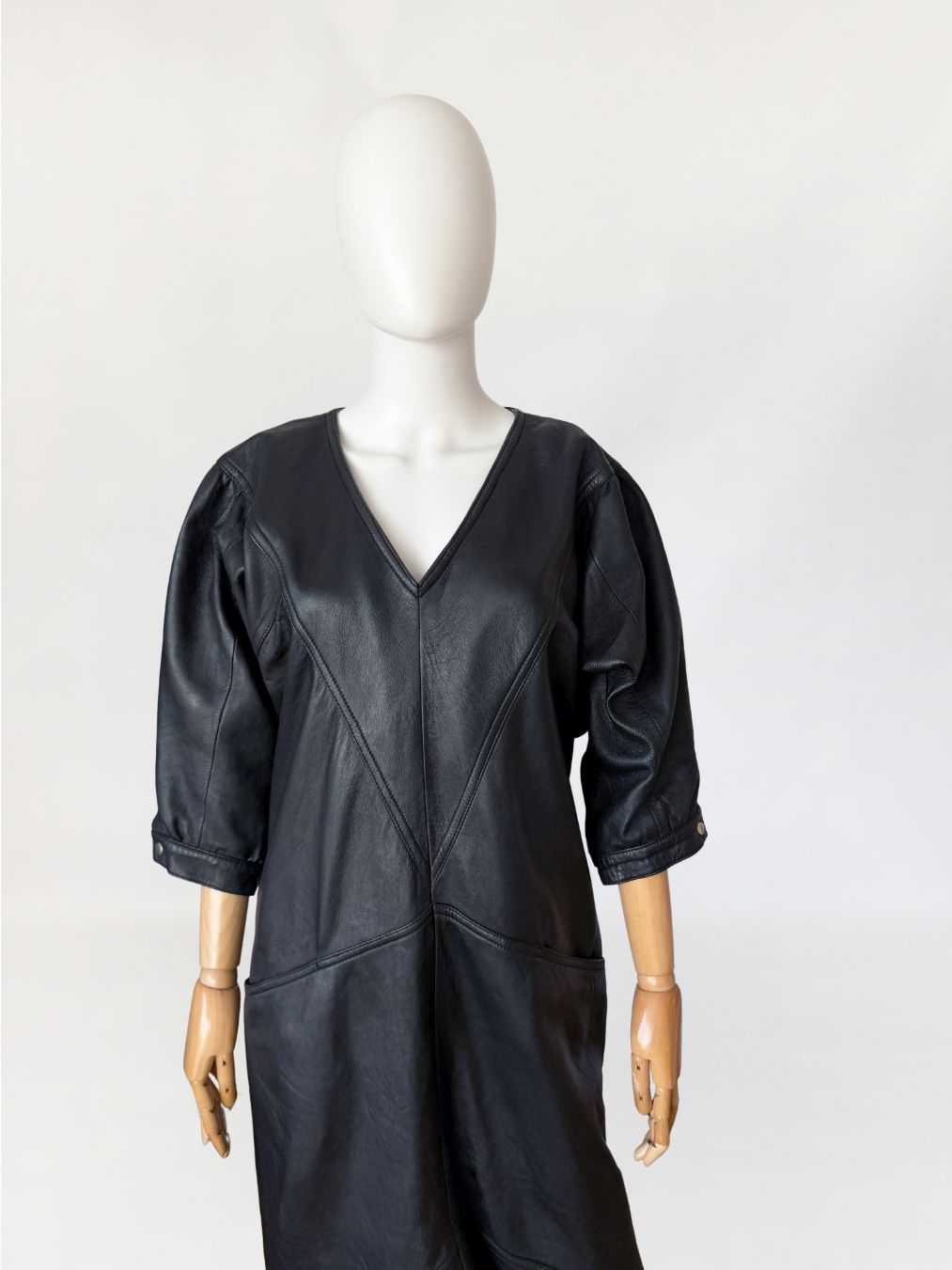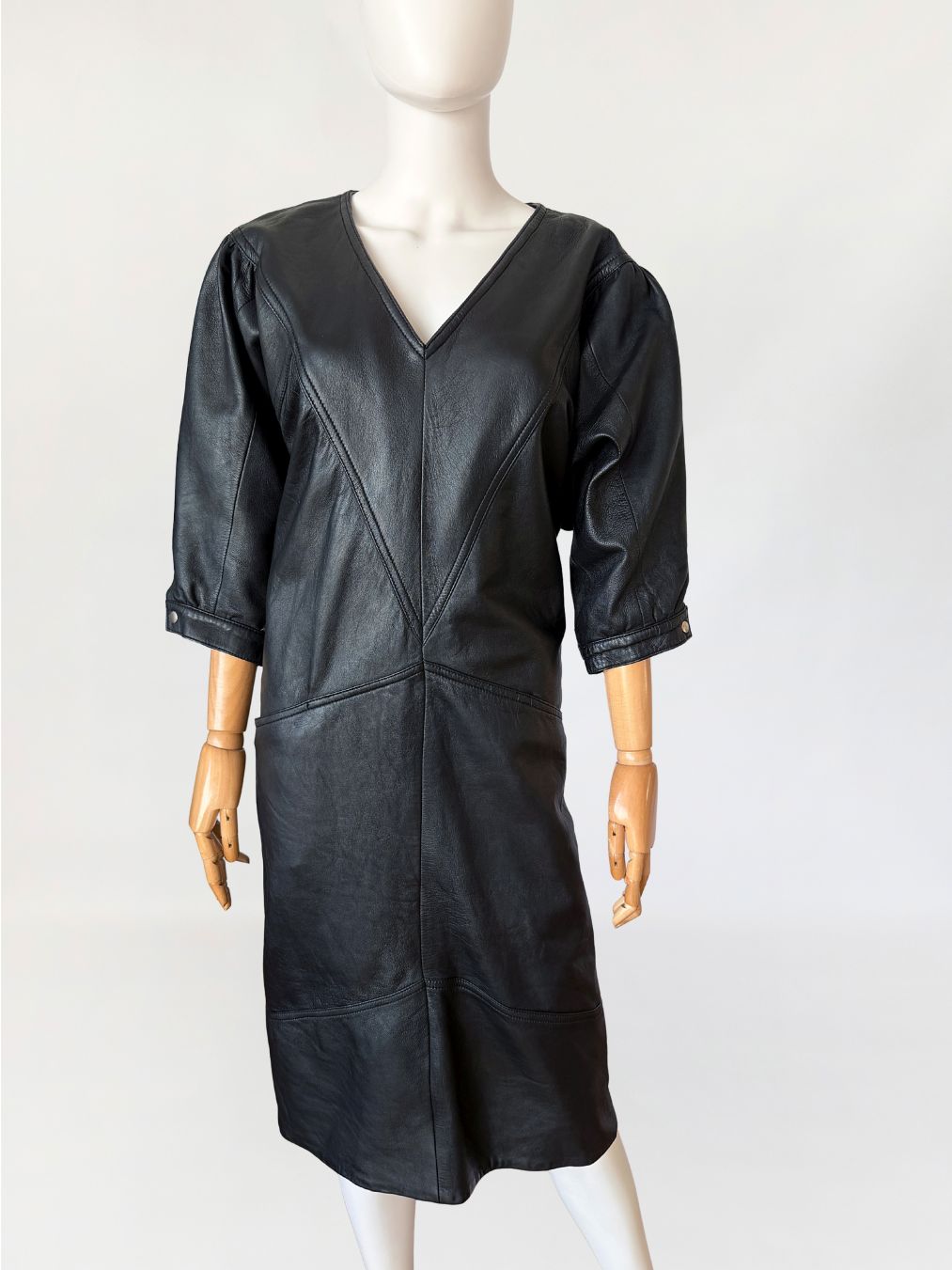 Sukienka vintage z lat 80-tych wykonana z miękkiej naturalnej skóry w czarnym kolorze. Góra nieco luźniejsza, z obniżoną linią pach, fason lekko zwęża się do dołu. Konstrukcja panelowa poprzez symetryczne przeszycia biegnące w układzie pionowym i diagonalnym. Dekolt w kształcie litery V, wykończony wąskim obszyciem. Rękawy o długości do łokcia, balonowe - o zwiększonej objętości w górnej części, zakończone mankietem zapinanym na metalowy nap. W dolnej części przodu naszyte kieszenie wkomponowane w linię cięć konstrukcyjnych. Z tyłu niewielki rozporek.