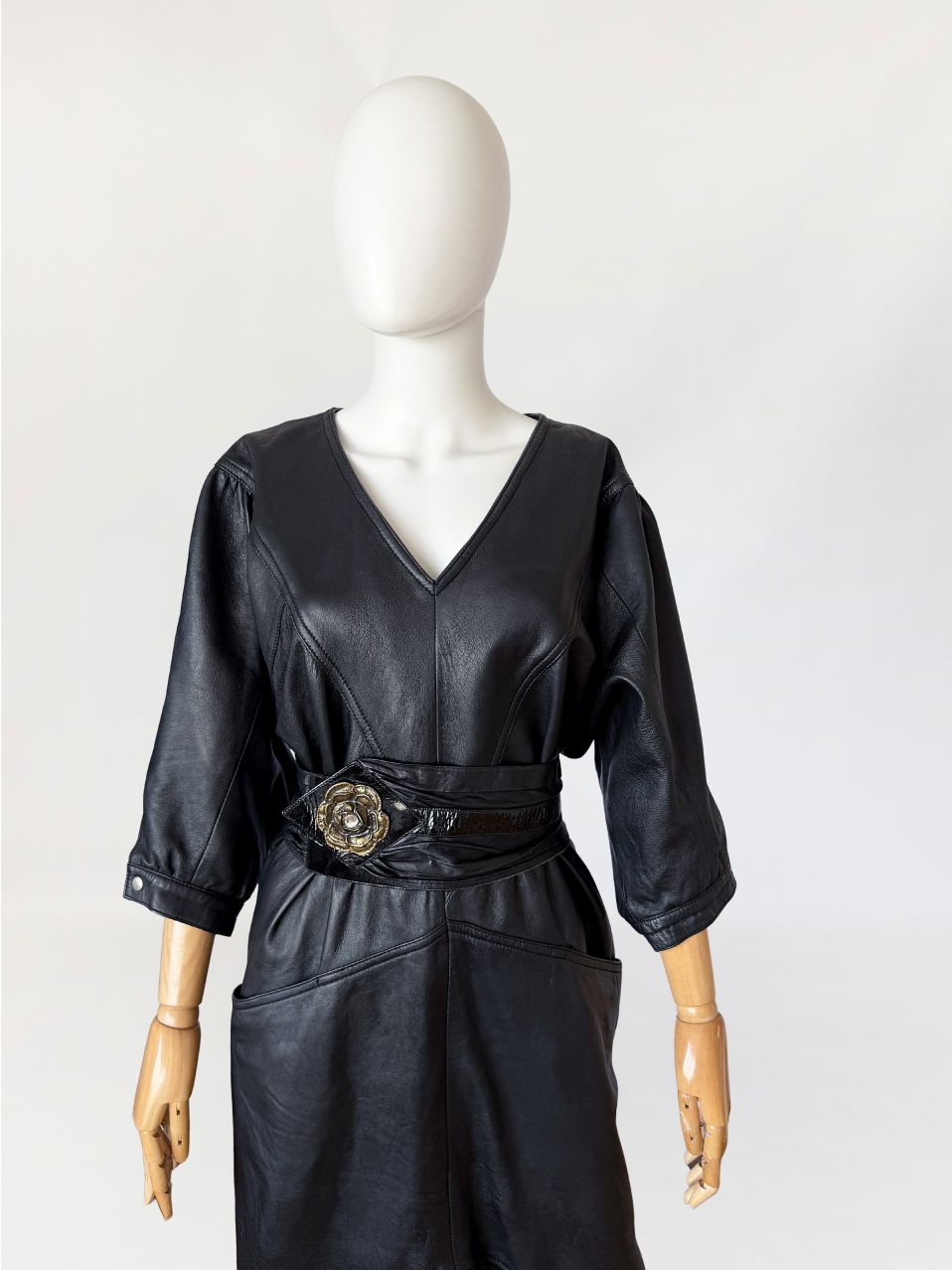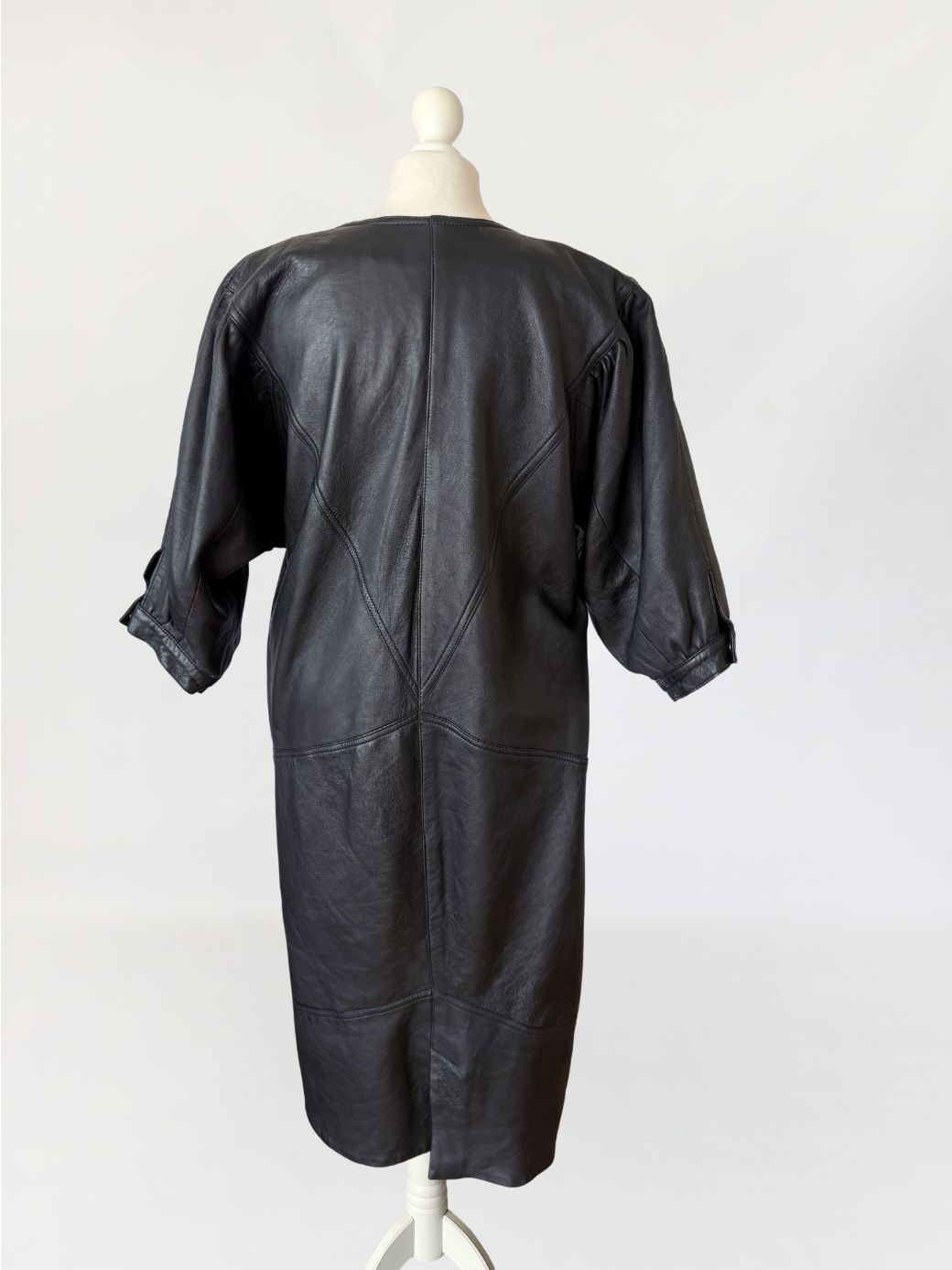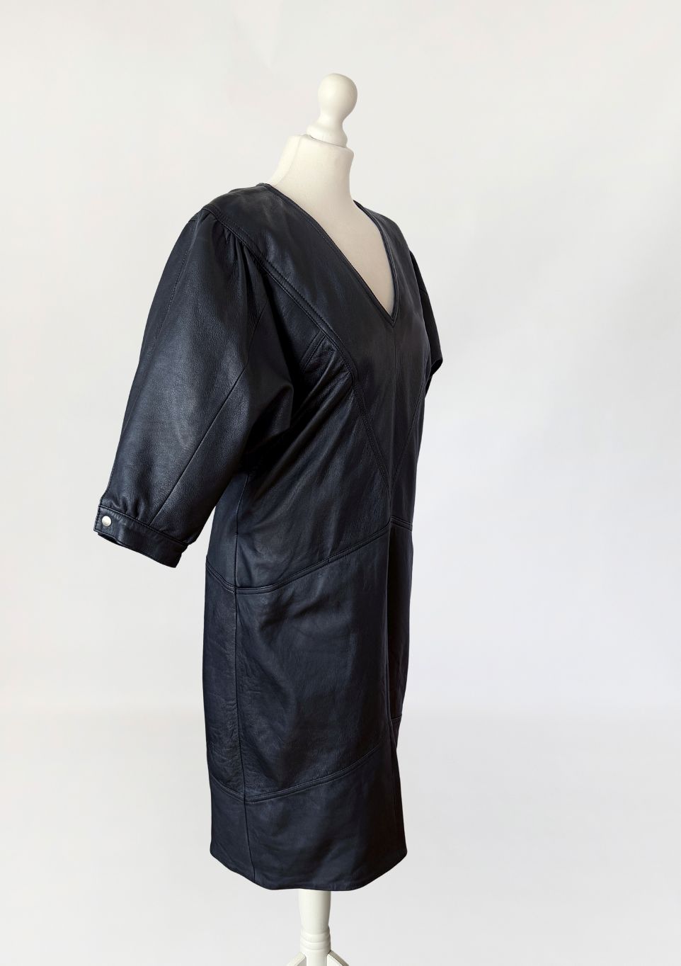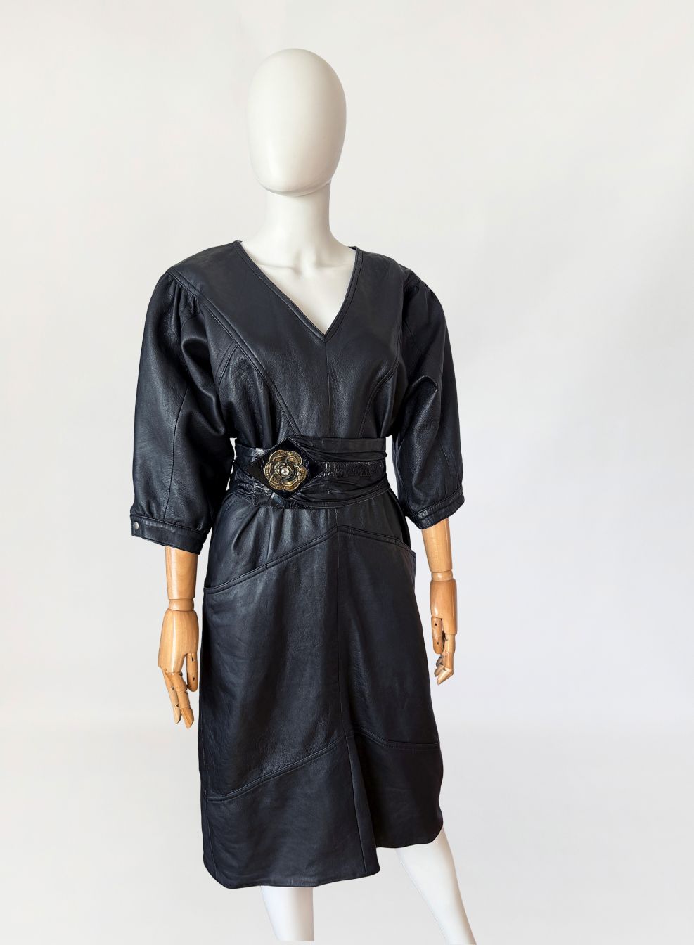Sukienka vintage z lat 80-tych wykonana z miękkiej naturalnej skóry w czarnym kolorze. Góra nieco luźniejsza, z obniżoną linią pach, fason lekko zwęża się do dołu. Konstrukcja panelowa poprzez symetryczne przeszycia biegnące w układzie pionowym i diagonalnym. Dekolt w kształcie litery V, wykończony wąskim obszyciem. Rękawy o długości do łokcia, balonowe - o zwiększonej objętości w górnej części, zakończone mankietem zapinanym na metalowy nap. W dolnej części przodu naszyte kieszenie wkomponowane w linię cięć konstrukcyjnych. Z tyłu niewielki rozporek.