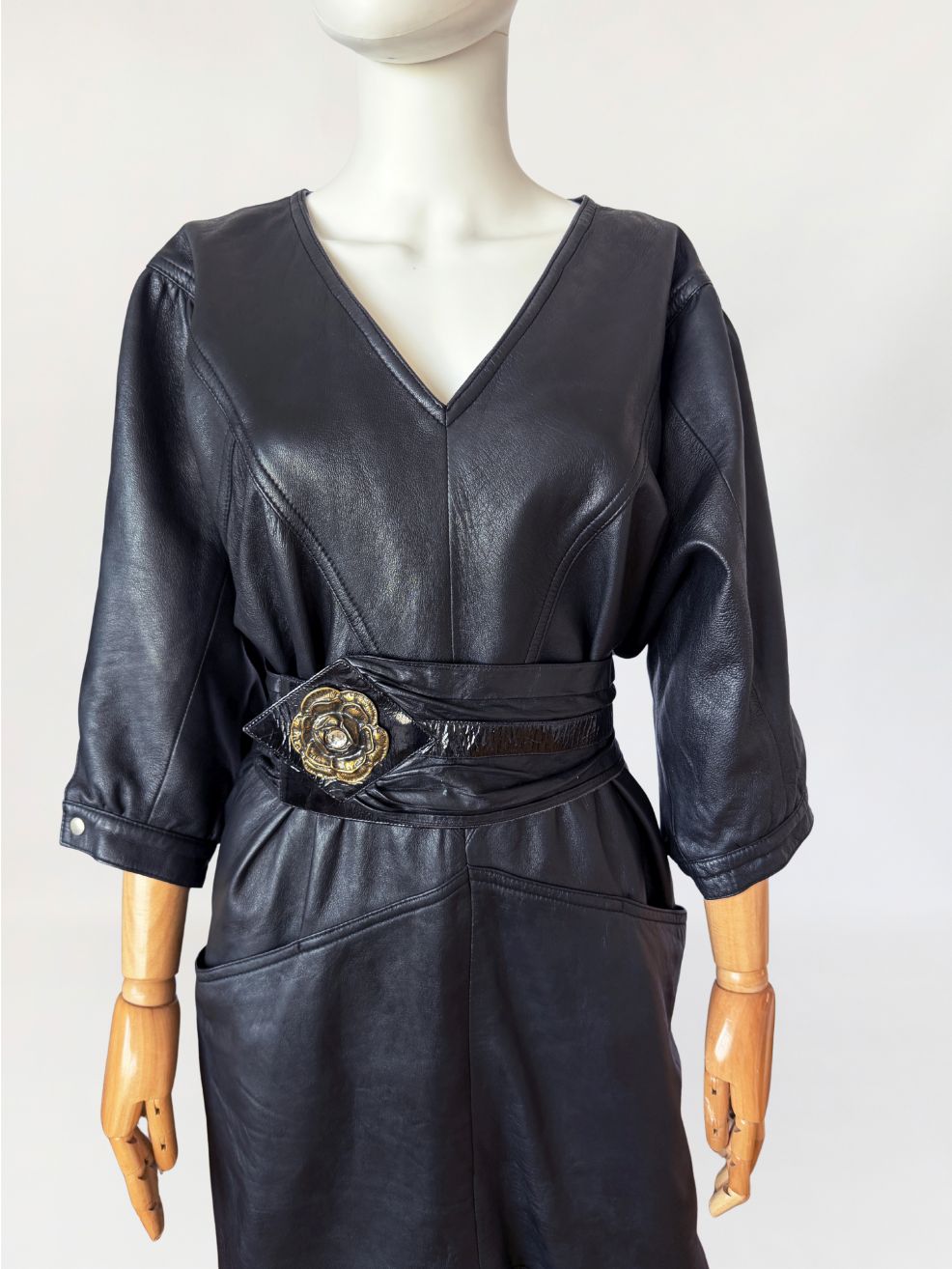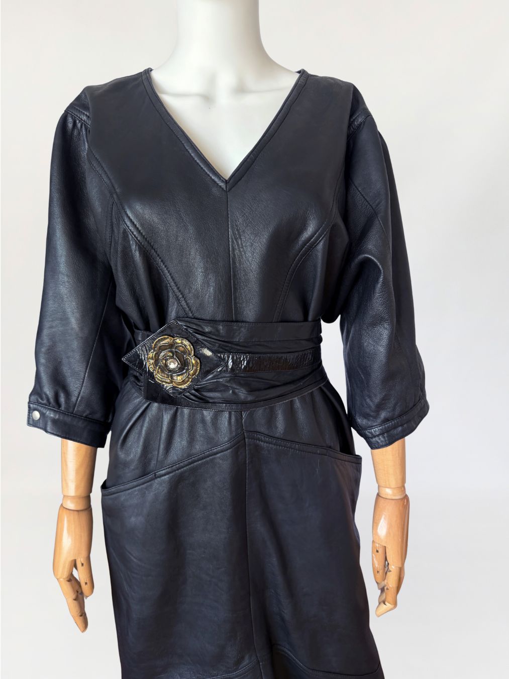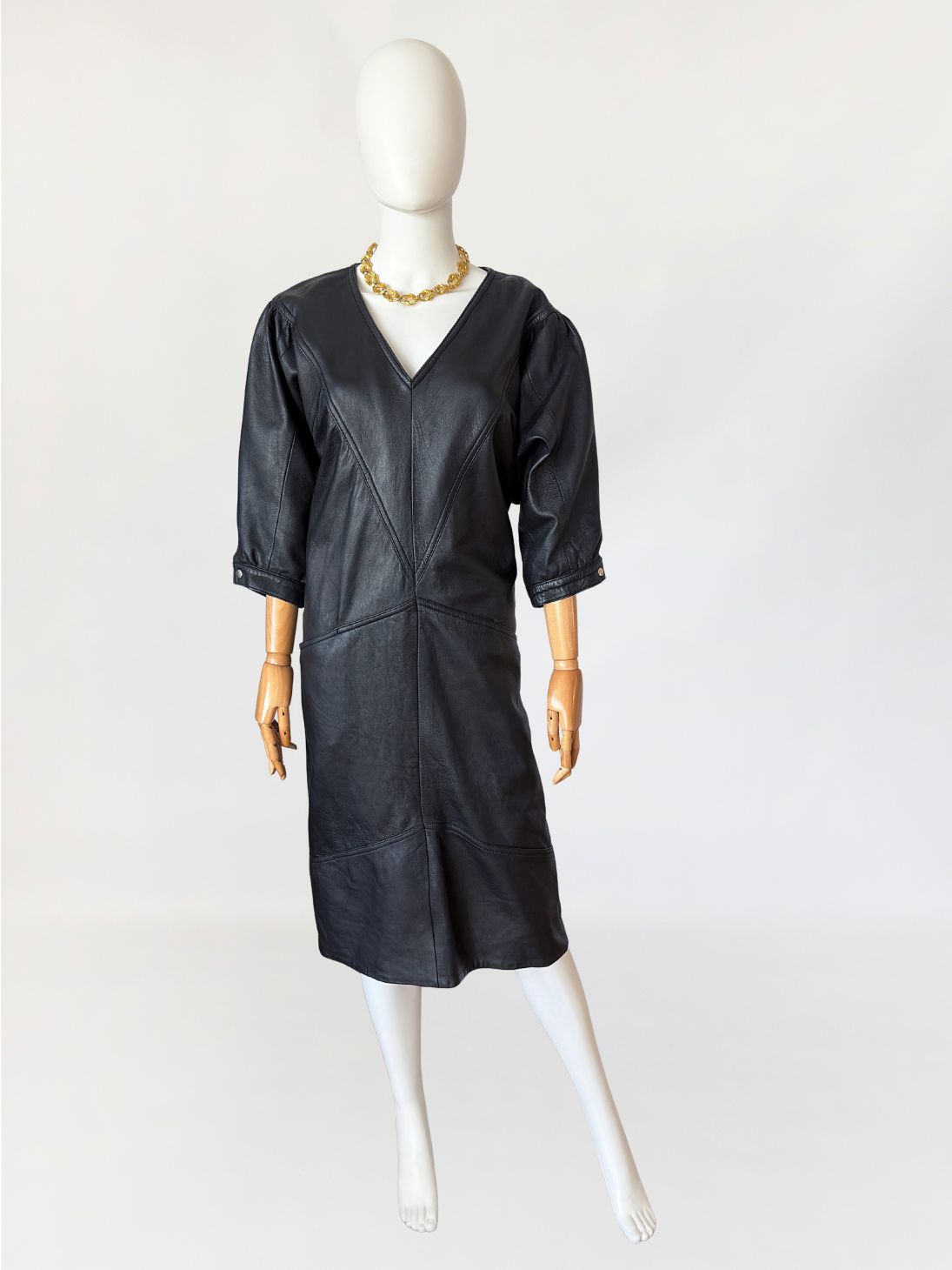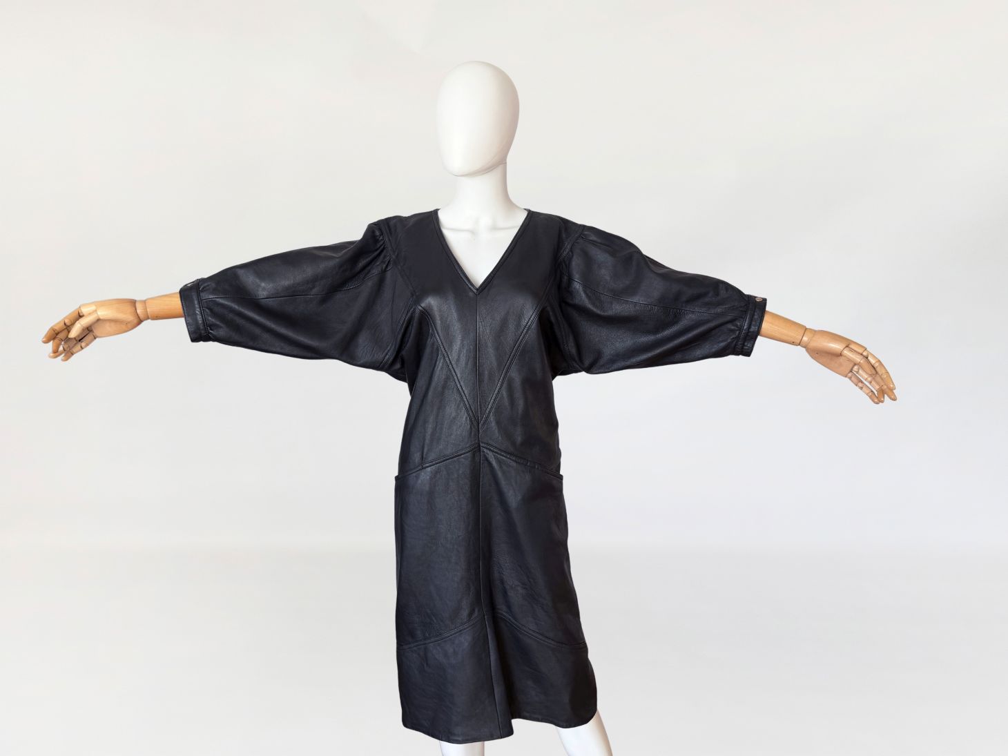 Sukienka vintage z lat 80-tych wykonana z miękkiej naturalnej skóry w czarnym kolorze. Góra nieco luźniejsza, z obniżoną linią pach, fason lekko zwęża się do dołu. Konstrukcja panelowa poprzez symetryczne przeszycia biegnące w układzie pionowym i diagonalnym. Dekolt w kształcie litery V, wykończony wąskim obszyciem. Rękawy o długości do łokcia, balonowe - o zwiększonej objętości w górnej części, zakończone mankietem zapinanym na metalowy nap. W dolnej części przodu naszyte kieszenie wkomponowane w linię cięć konstrukcyjnych. Z tyłu niewielki rozporek.