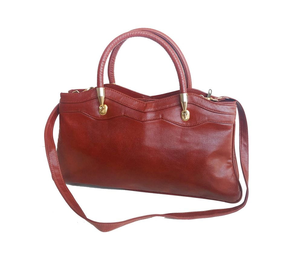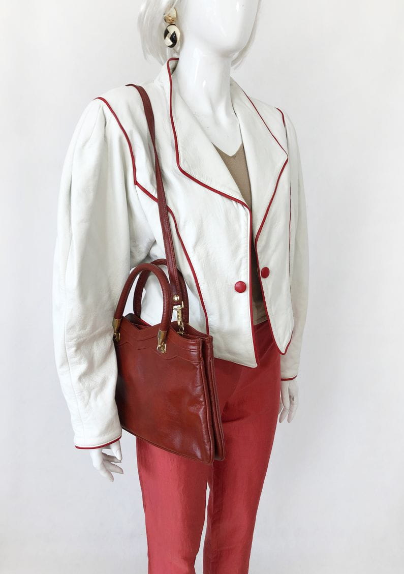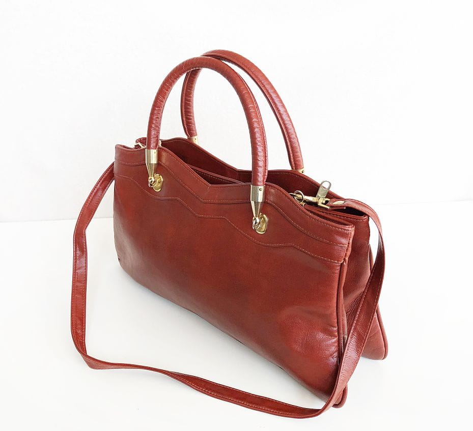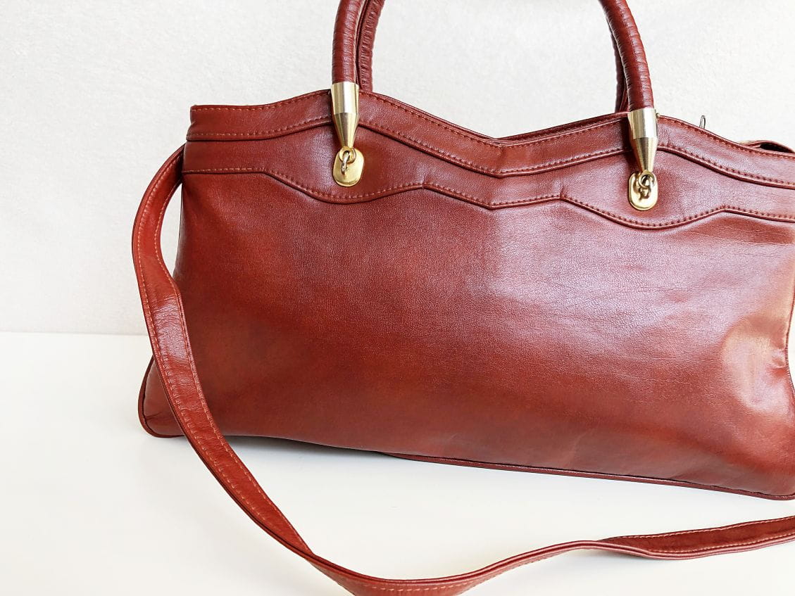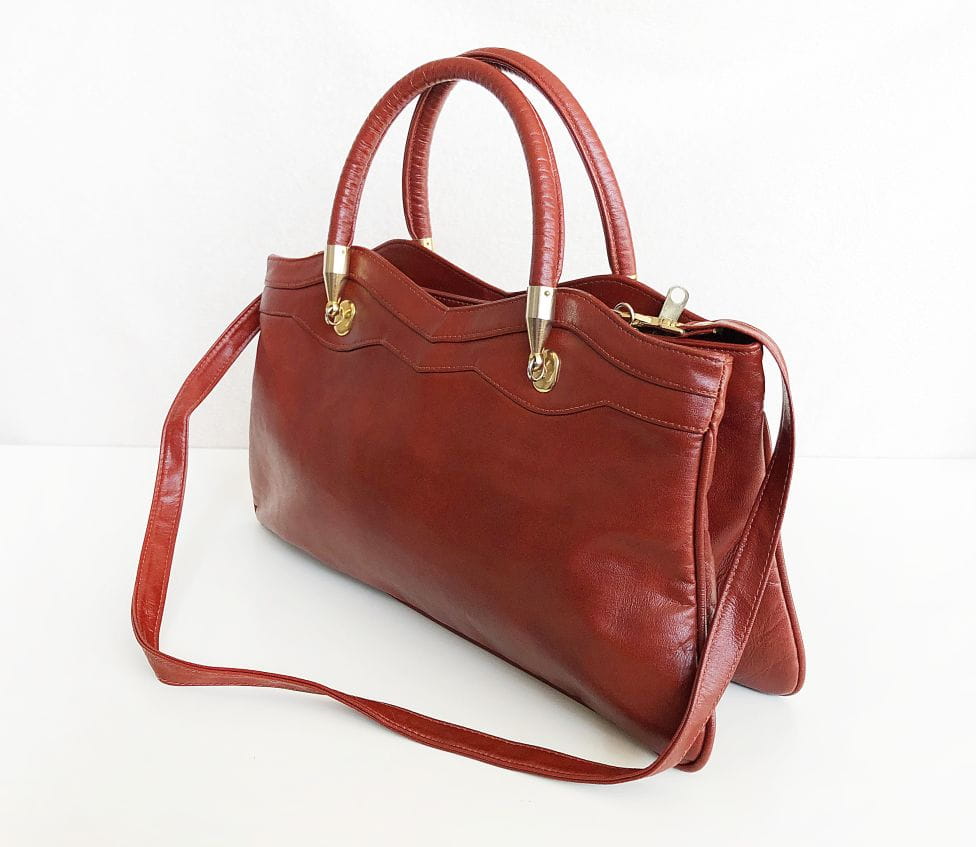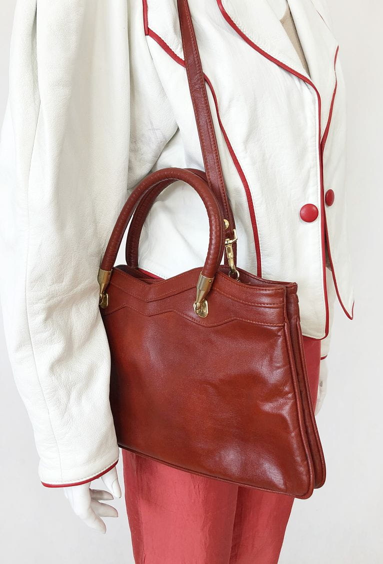 Skórzana torba vintage wykonana ze skóry naturalnej w kolorze bordowym, ze złotymi ukuciami. Posiada rączki i odpinany pasek. Wewnątrz dwie zasuwane komory i mała zasuwana kieszeń.