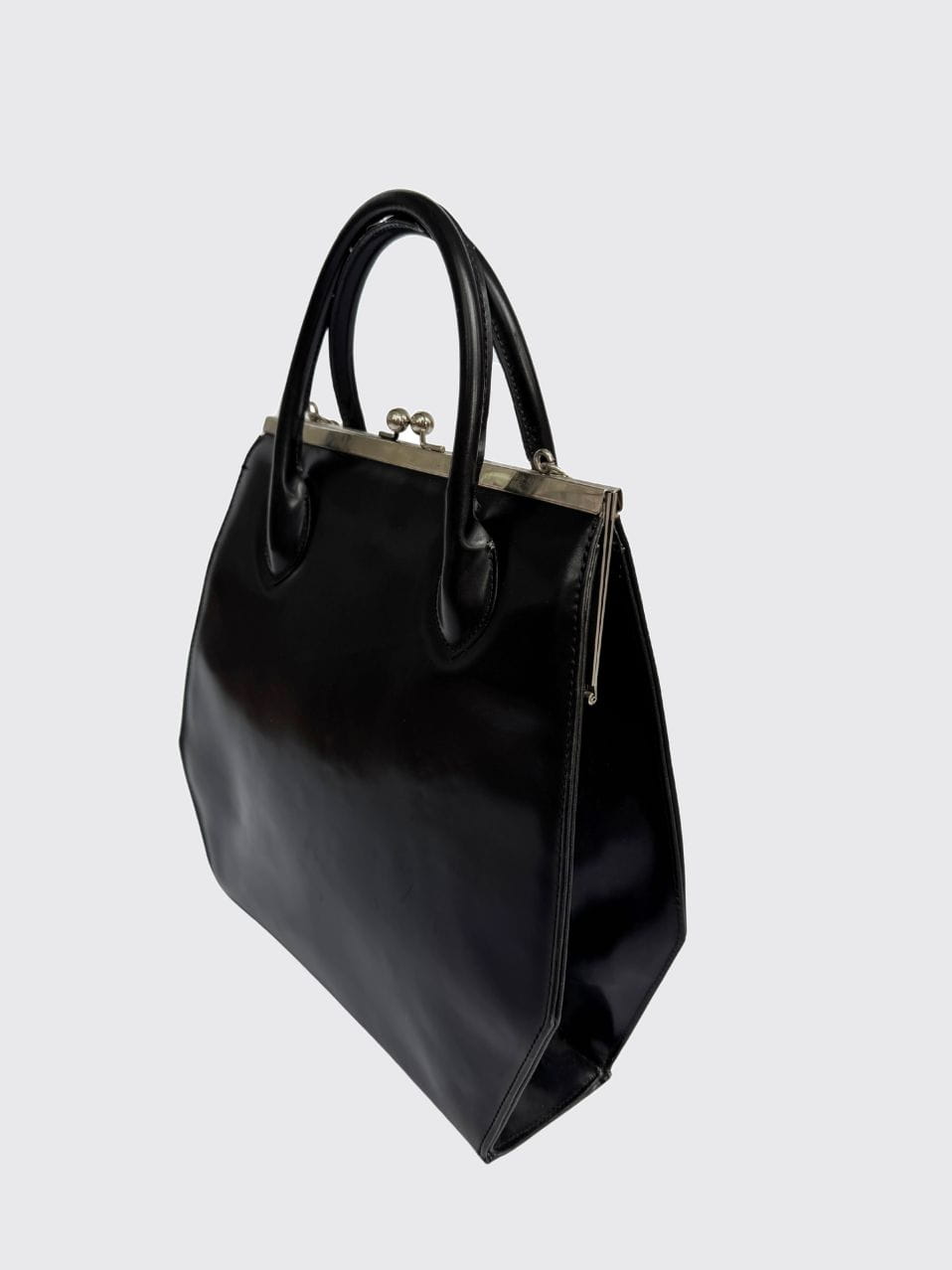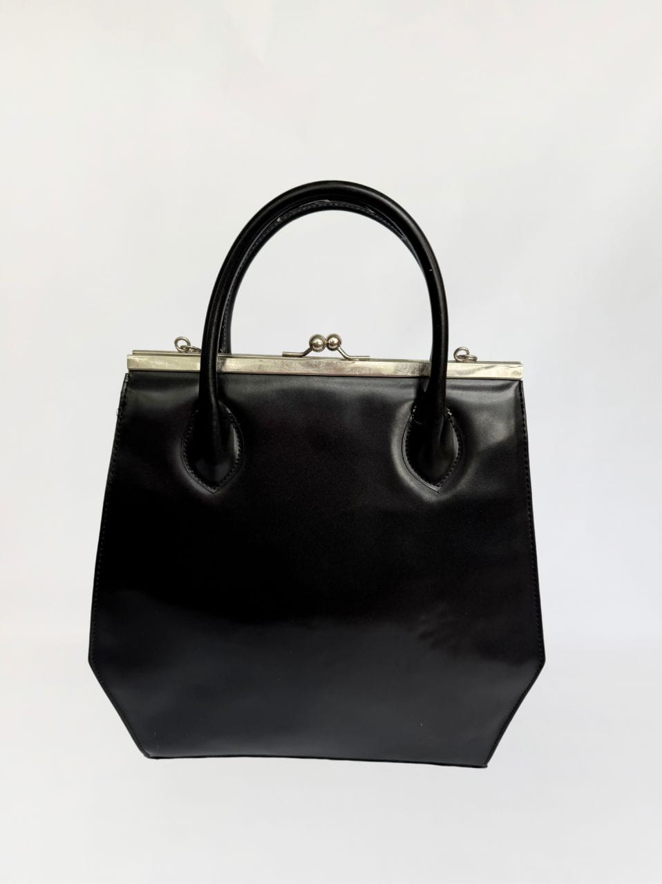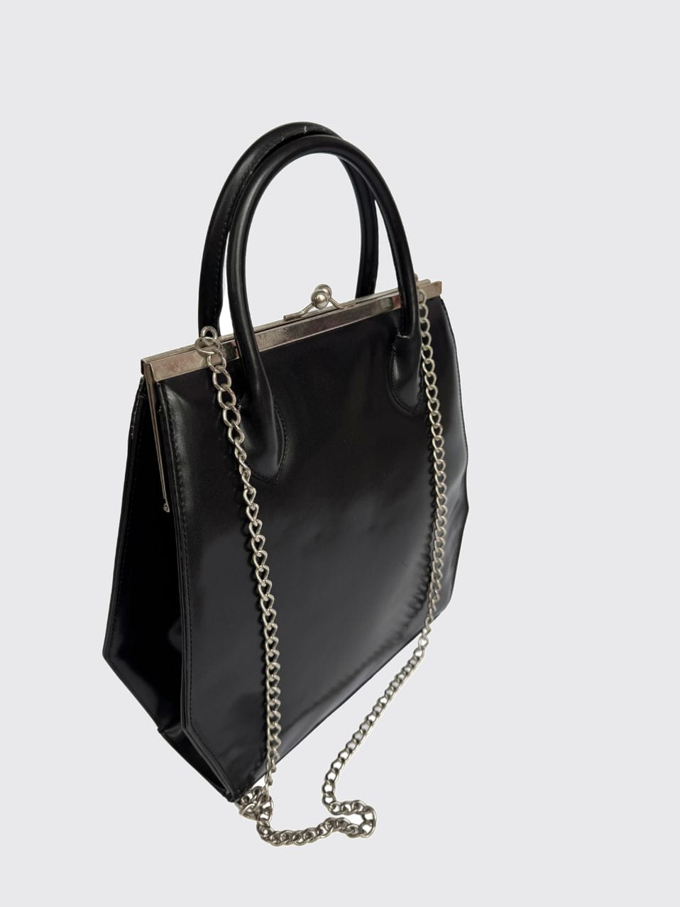 Skórzana czarna torba true vintage. Zapinana na metalowy bigiel. Wewnątrz jedna komora wyściełana płócienną tkaniną. W komplecie metalowy pasek - łańcuszek.