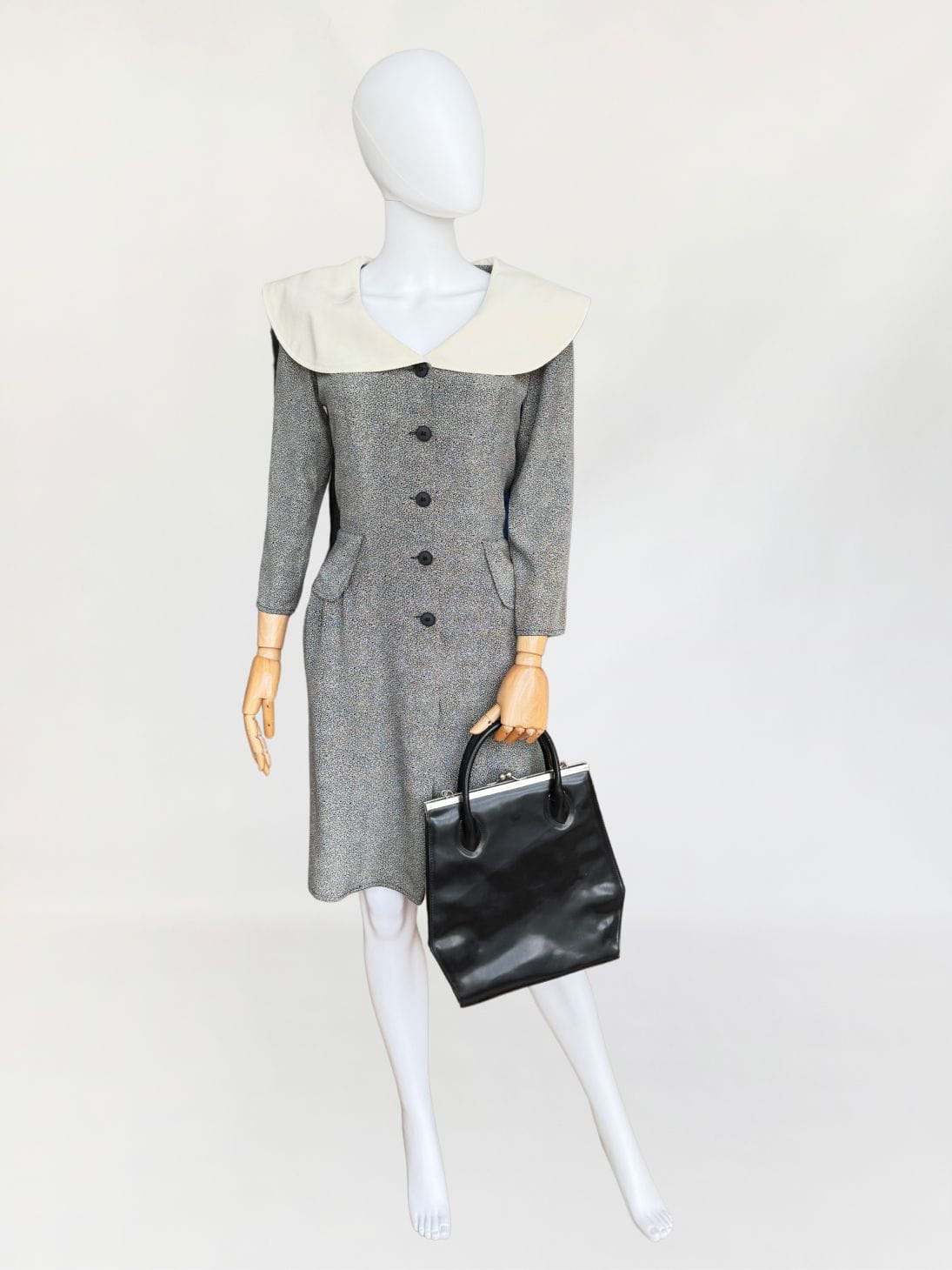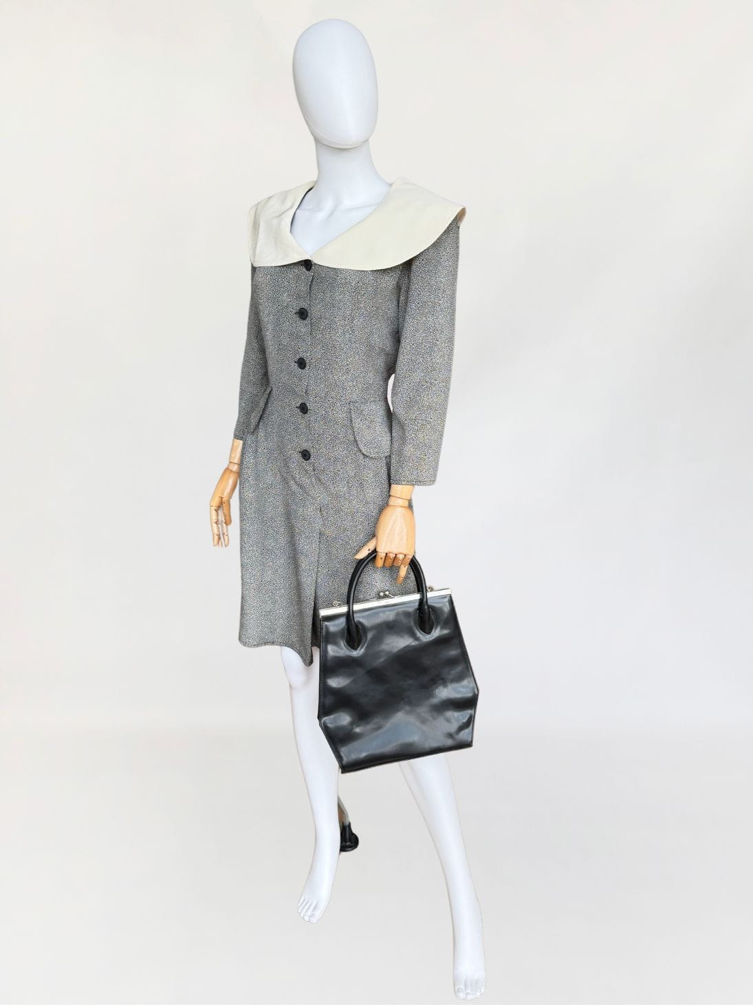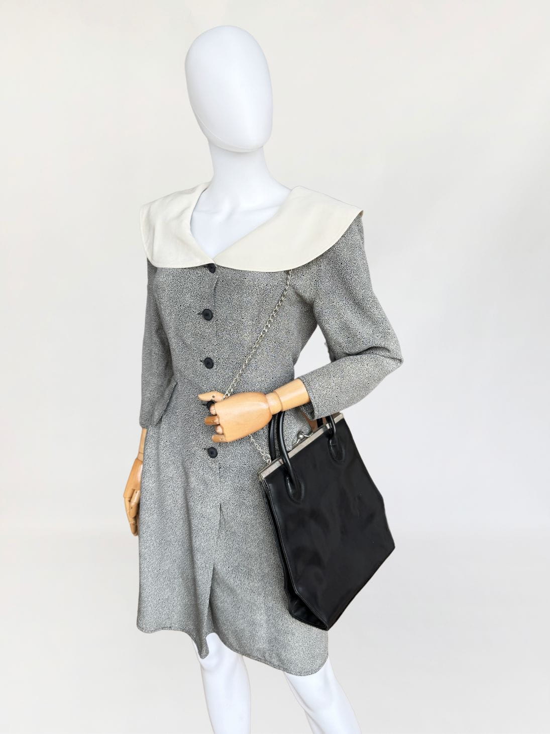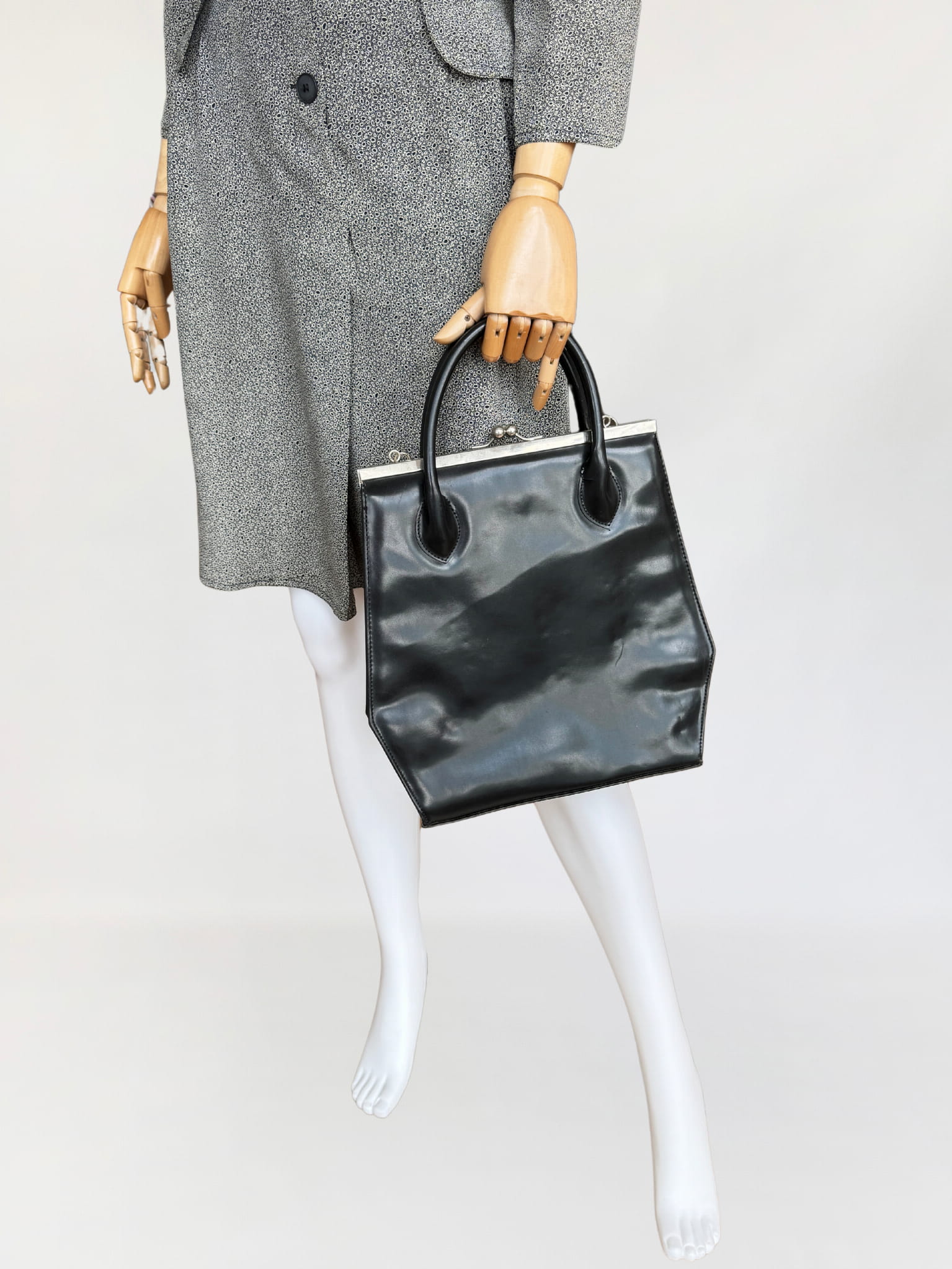 Skórzana czarna torba true vintage. Zapinana na metalowy bigiel. Wewnątrz jedna komora wyściełana płócienną tkaniną. W komplecie metalowy pasek - łańcuszek.