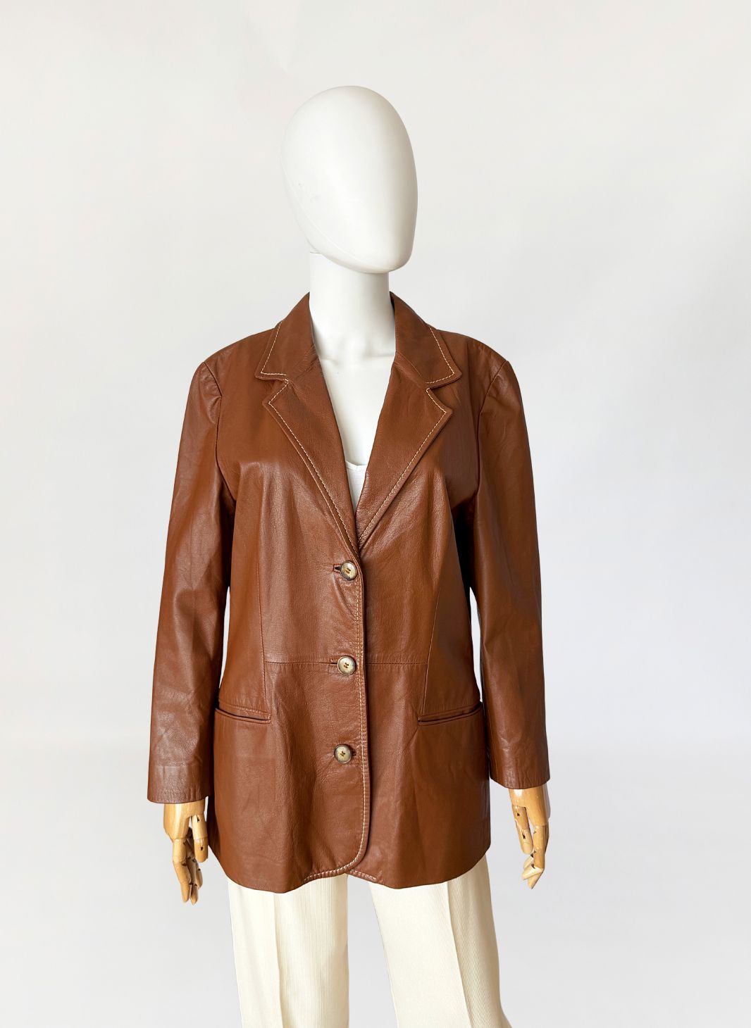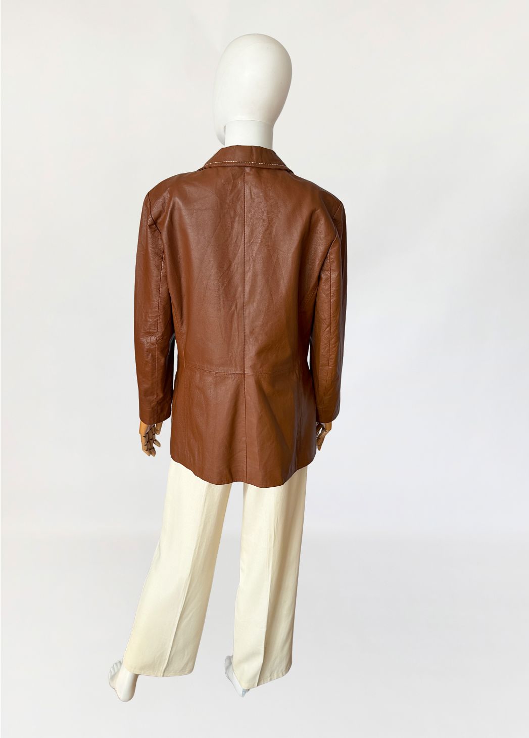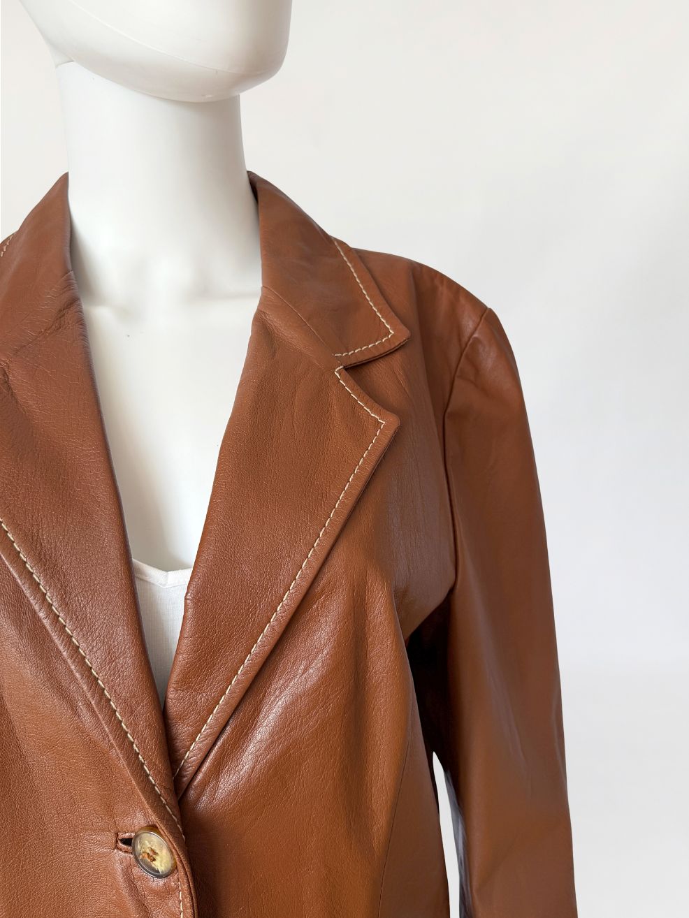 Włoska marynarka vintage wykonana z ultra-miękkiej naturalnej skóry w odcieniu ciepłego brązu. Fason jednorzędowy, lekko dopasowany, z wyraźnie zaznaczoną linią talii modelowaną pionowymi cięciami konstrukcyjnymi. Kołnierz wykładany z klasycznymi klapami, wykończony kontrastowym stebnowaniem. Zapięcie na trzy guziki. Rękawy długie, wszywane klasycznie, o prostej linii. U dołu wszyte kieszenie wpuszczane, wykończone wąskimi listewkami. Tył gładki, z centralnym szwem konstrukcyjnym. Skóra o wyjątkowo miękkiej strukturze, plastyczna, leciutka.