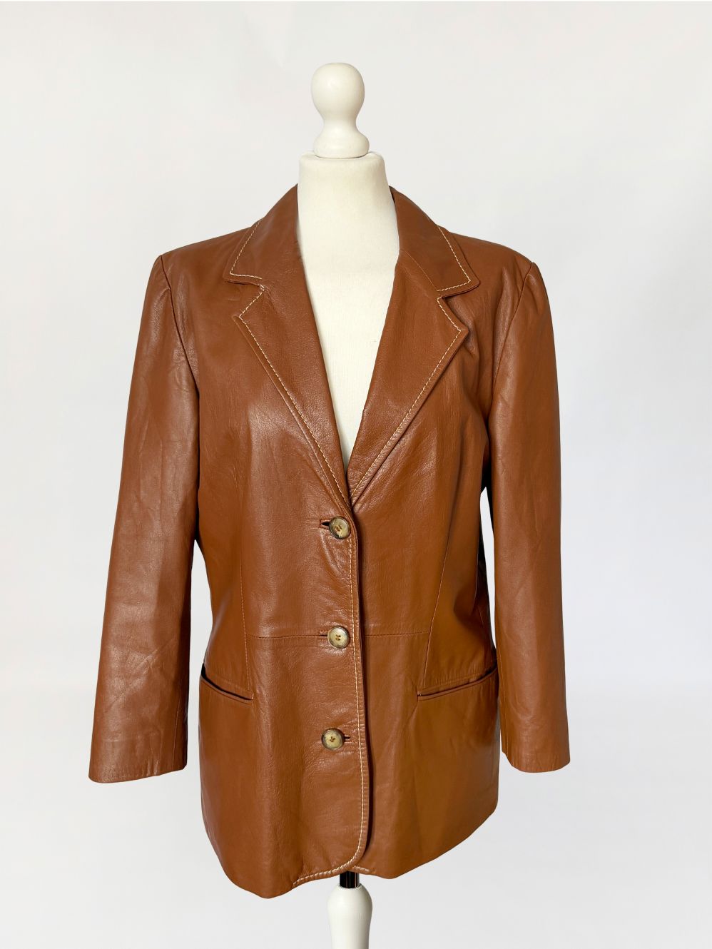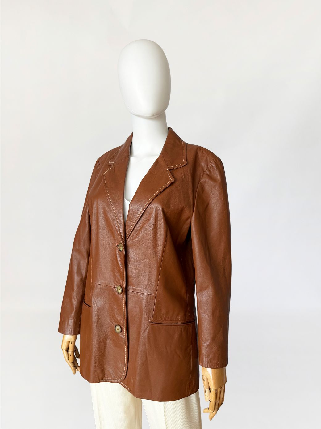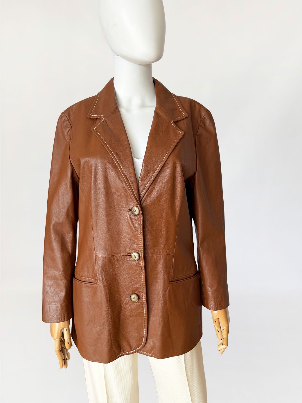 Włoska marynarka vintage wykonana z ultra-miękkiej naturalnej skóry w odcieniu ciepłego brązu. Fason jednorzędowy, lekko dopasowany, z wyraźnie zaznaczoną linią talii modelowaną pionowymi cięciami konstrukcyjnymi. Kołnierz wykładany z klasycznymi klapami, wykończony kontrastowym stebnowaniem. Zapięcie na trzy guziki. Rękawy długie, wszywane klasycznie, o prostej linii. U dołu wszyte kieszenie wpuszczane, wykończone wąskimi listewkami. Tył gładki, z centralnym szwem konstrukcyjnym. Skóra o wyjątkowo miękkiej strukturze, plastyczna, leciutka.