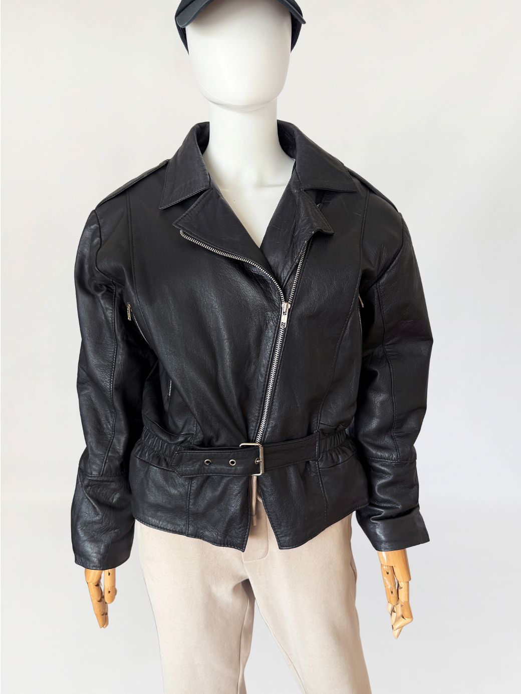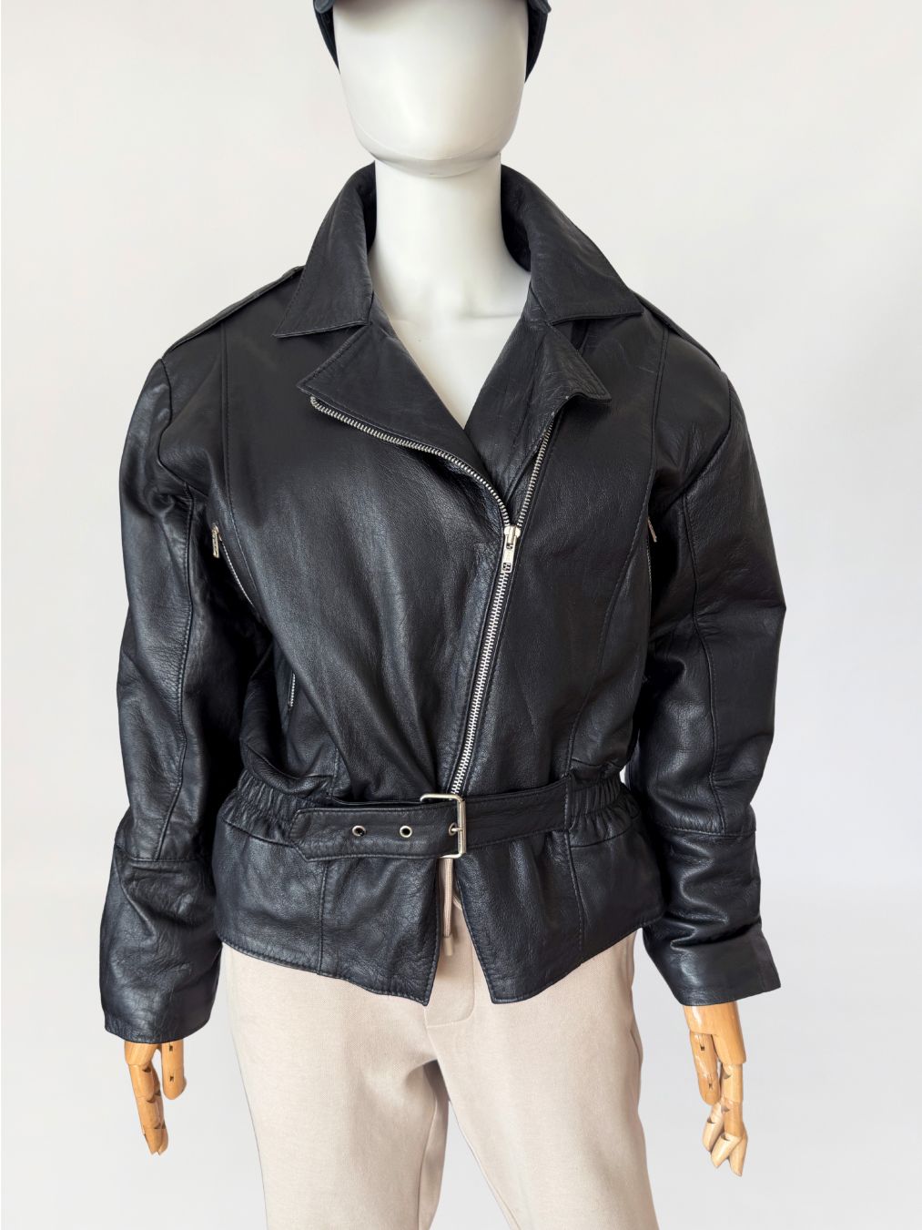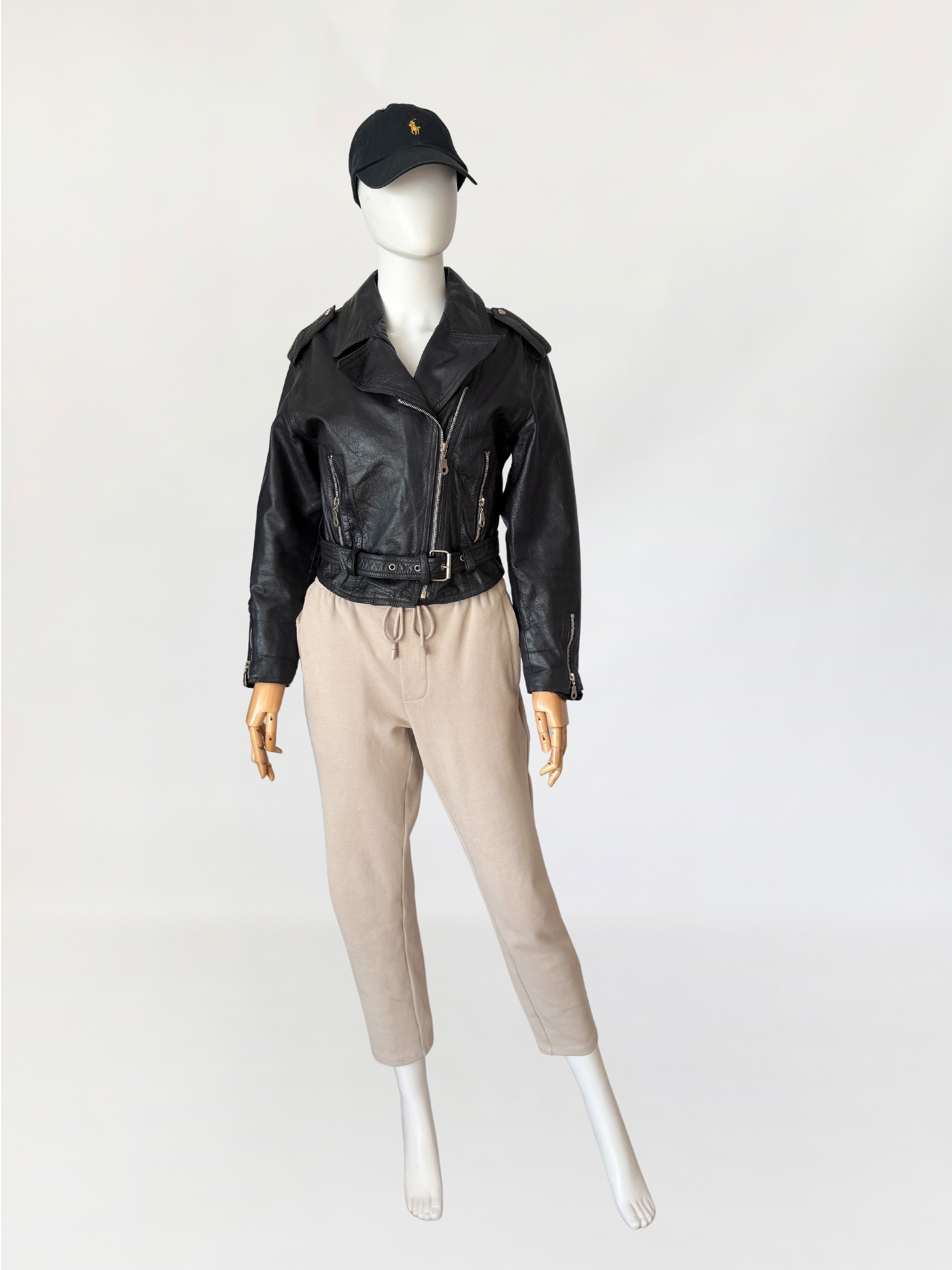 Włoska kurtka vintage z lat 80-tych wykonana z miękkiej naturalnej skóry licowej. Luźniejsza góra z obniżoną linią pach i długimi rękawami. Linia ramion lekko watowana. Kołnierz klasyczny z szerokimi klapami. Zapięcie asymetryczne na metalowy zamek. Na wysokości klatki piersiowej pionowe kieszenie zamykane na zamki. Dół wykończony paskiem z regulacją i metalową klamrą, po bokach wszyte elastyczne wstawki marszczące. Model lekko wyściełany.