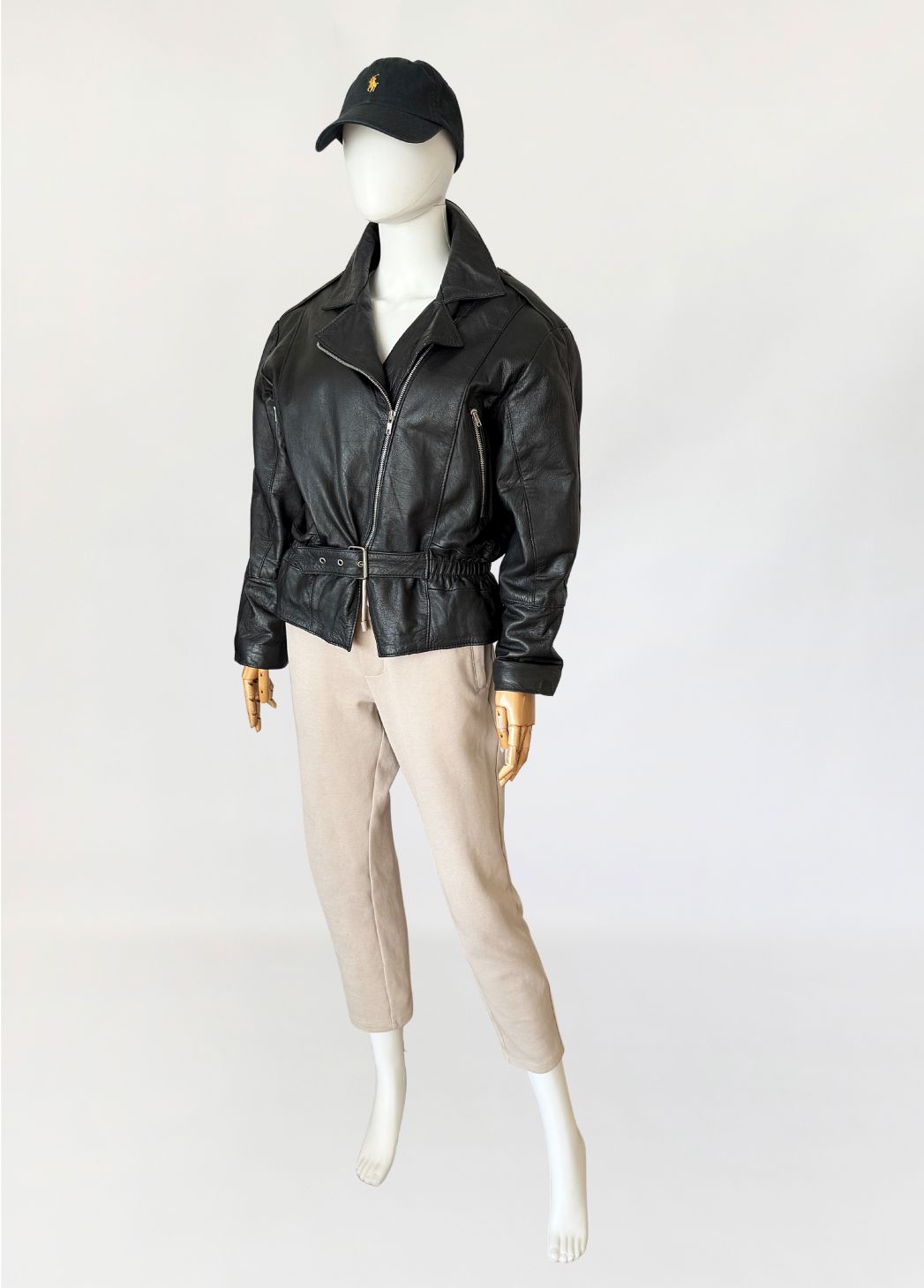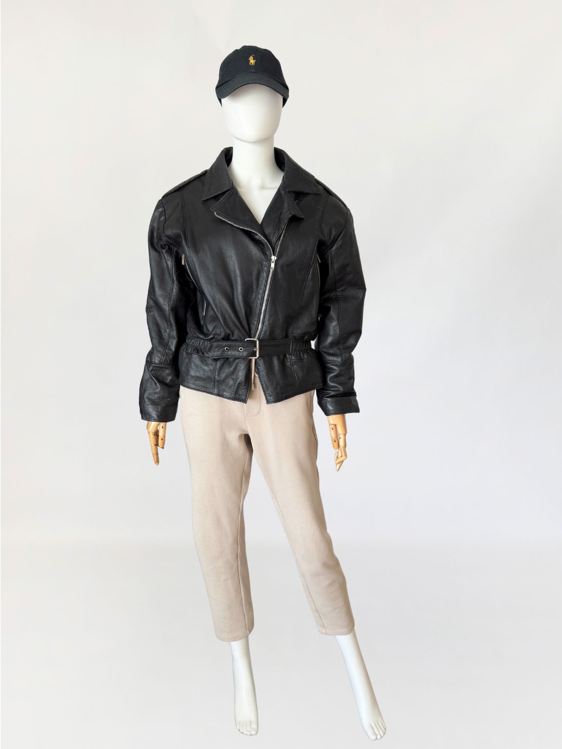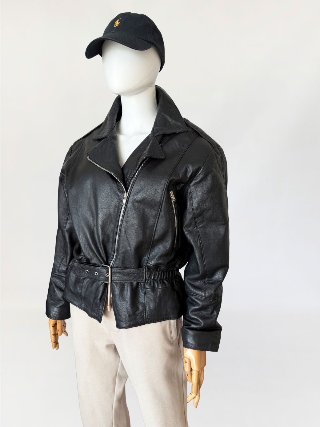 Włoska kurtka vintage z lat 80-tych wykonana z miękkiej naturalnej skóry licowej. Luźniejsza góra z obniżoną linią pach i długimi rękawami. Linia ramion lekko watowana. Kołnierz klasyczny z szerokimi klapami. Zapięcie asymetryczne na metalowy zamek. Na wysokości klatki piersiowej pionowe kieszenie zamykane na zamki. Dół wykończony paskiem z regulacją i metalową klamrą, po bokach wszyte elastyczne wstawki marszczące. Model lekko wyściełany.