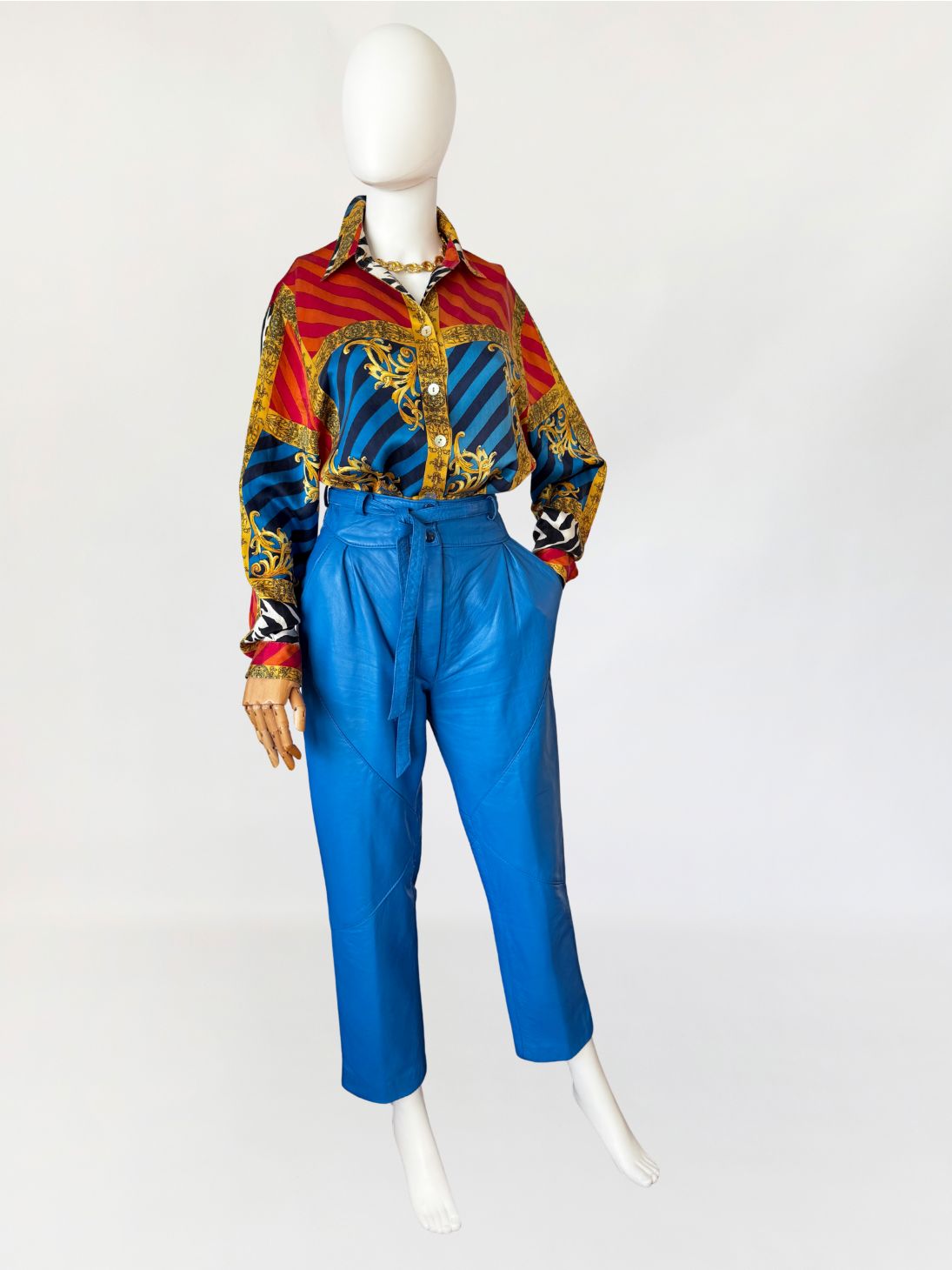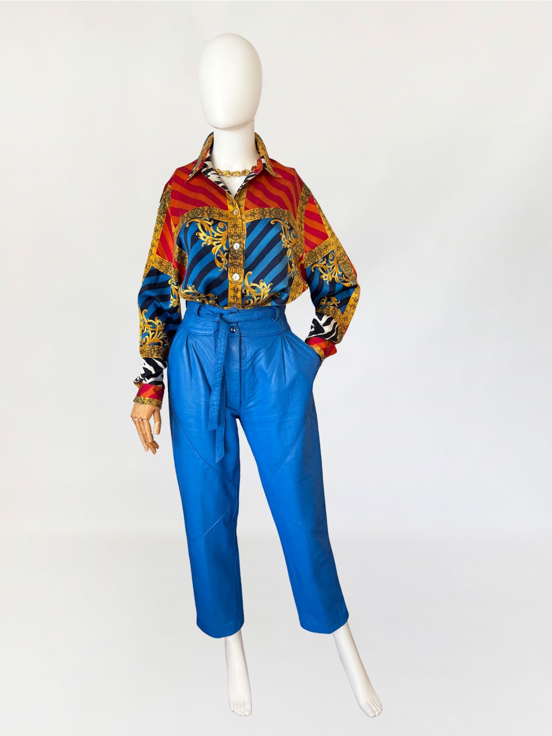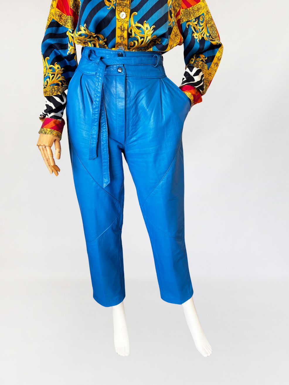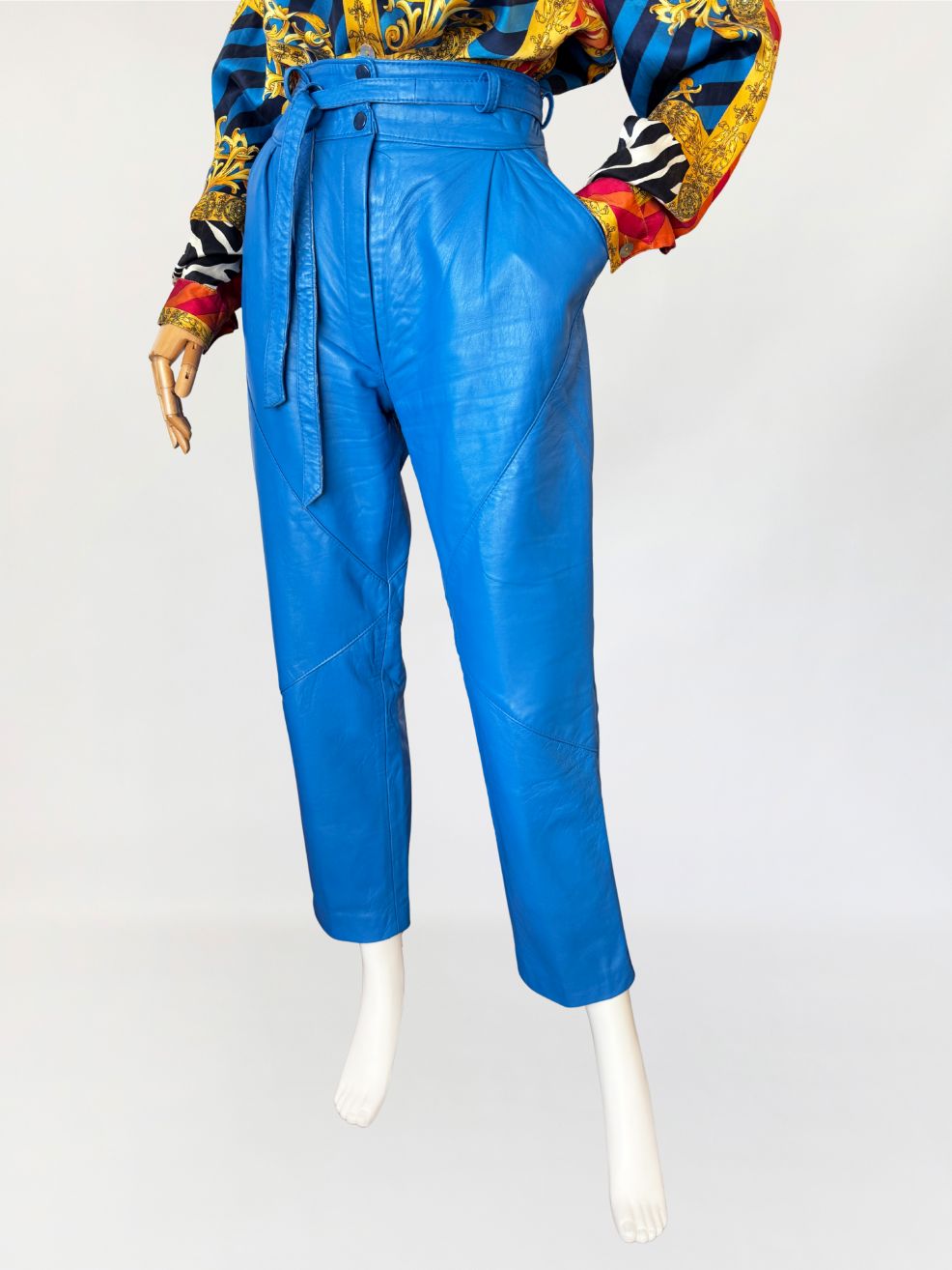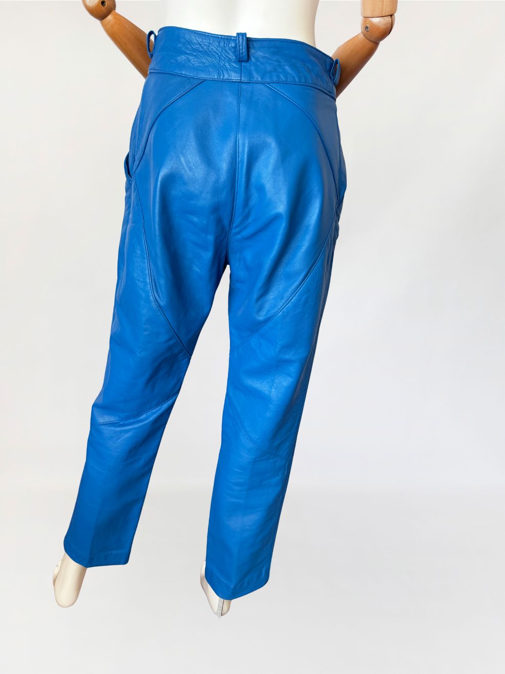 Spodnie vintage o kroju cygaretek, wykonane z naturalnej skóry jagnięcej w intensywnym odcieniu kobaltowym. Fason z wysokim stanem, z długą, prostą, lekko zwężaną nogawką. Wysoki stan, talia z wiązanym paskiem z tej samej skóry, przewlekanym przez szufki. Zapięcie na kryty zamek oraz napy metalowe. W przedniej części modelowane zaszewki konstrukcyjne. Tył z pionowym szwem pośrodku oraz panelami kształtującymi linię bioder.