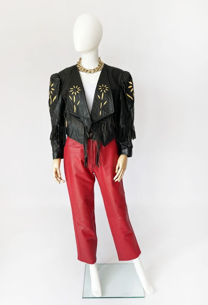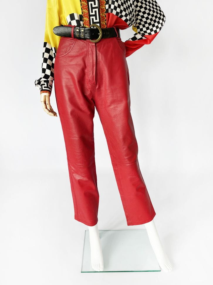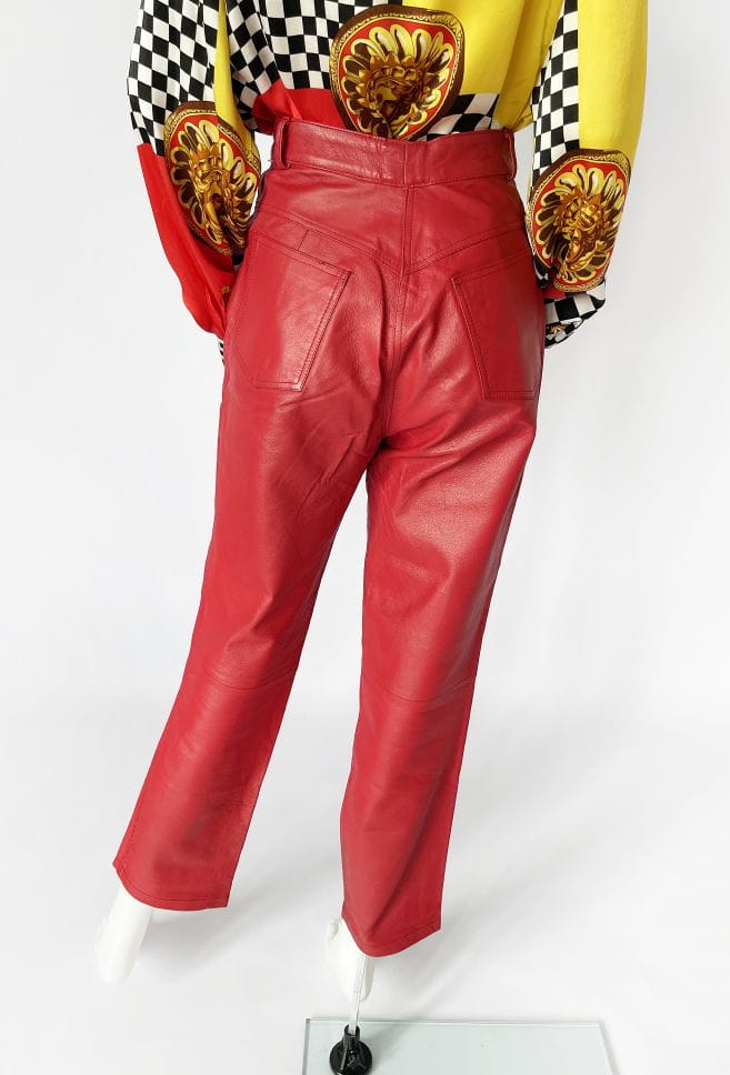 Właśnie za takie modele kochamy vintage! Obłędne spodnie vintage wykonane z naturalnej skóry w kolorze czerwonym. Model z wyższym stanem i długimi nogawkami, które bardzo delikatnie zwężają się ku dołowi. Standardowy rozkład kieszeni.