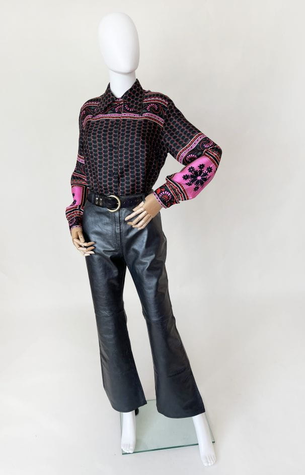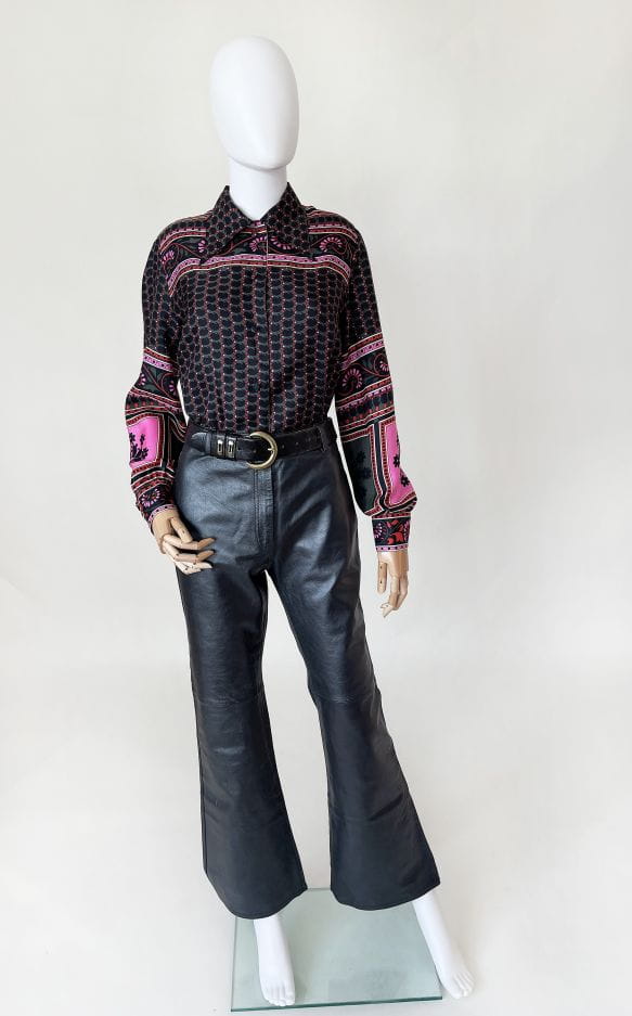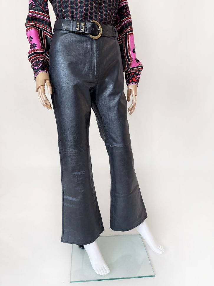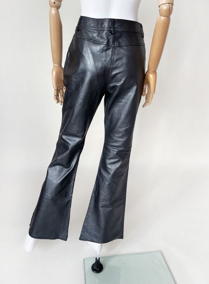Deadstock vintage. Dzwony wykonany z naturalnej skóry w kolorze czarnym. Długie nogawki poszerzane u dołu. Góra bez kieszeni. Średnia wysokość stanu. Posiadają komplet papierowych metek i zapasowe guziki.