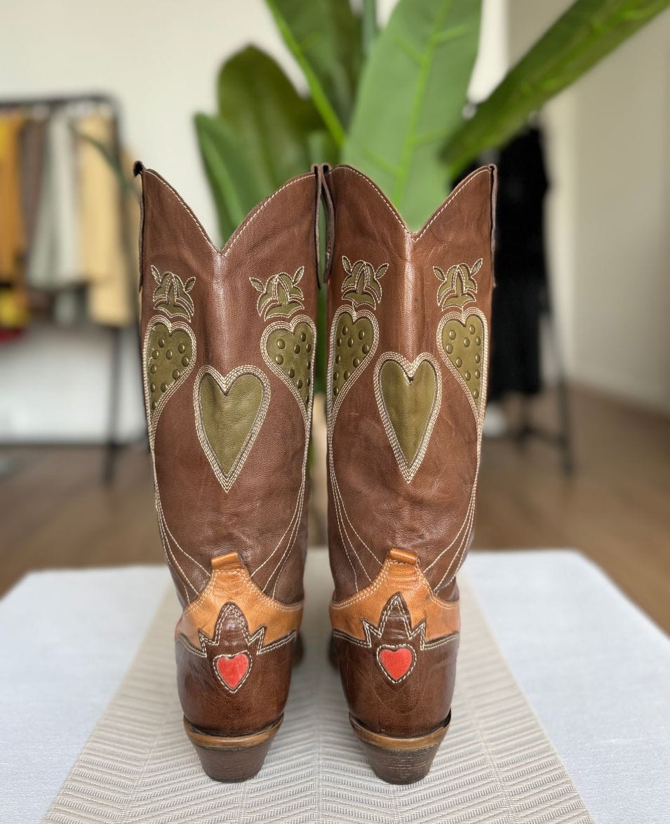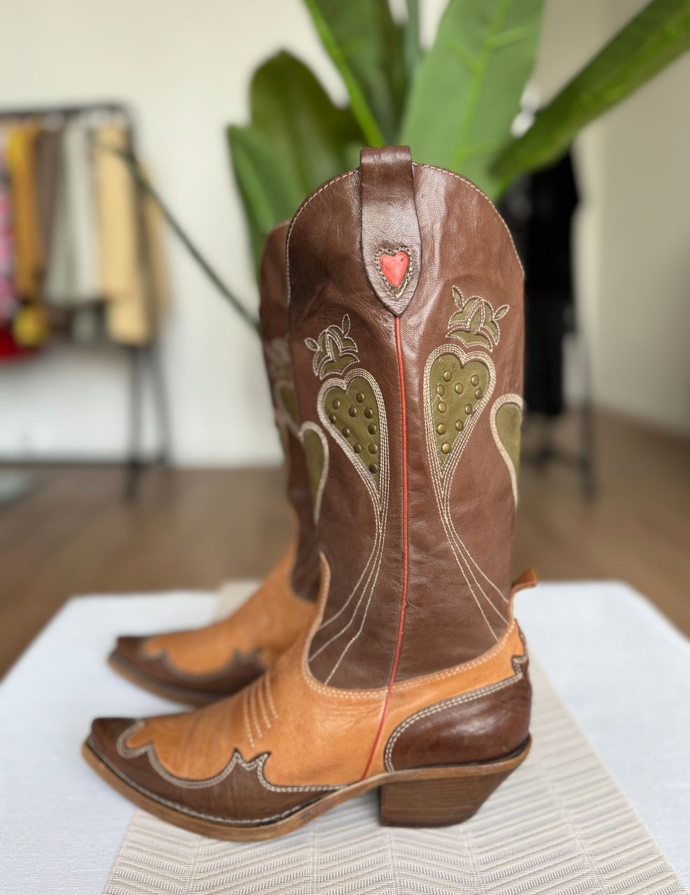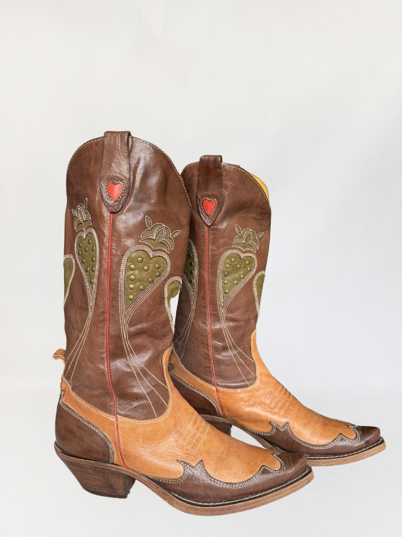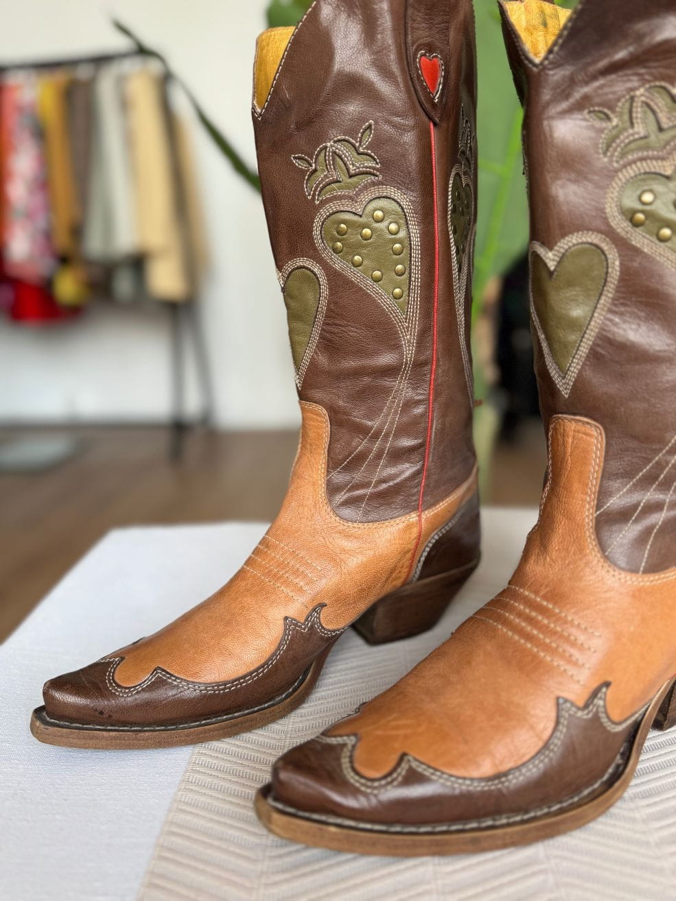 Unikatowe kowbojki vintage w westernowych klimatach wykonane z miękkiej naturalnej skóry. Cholewka zdobiona wielobarwnymi, wyszywanymi wzorami dodającymi im kowbojskiego klimatu. Precyzyjnie wykonane, z dbałością o detal.