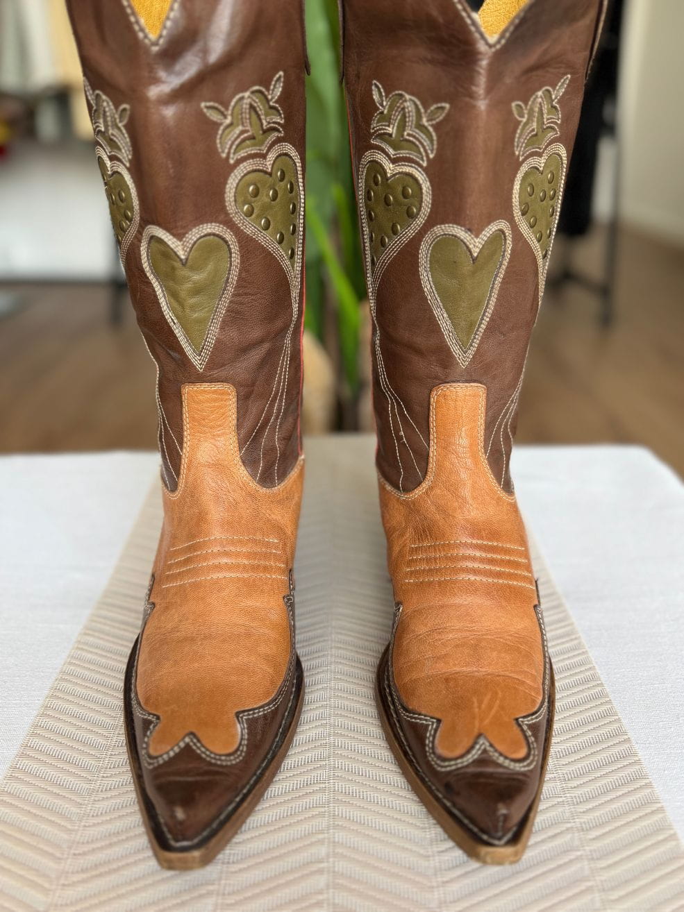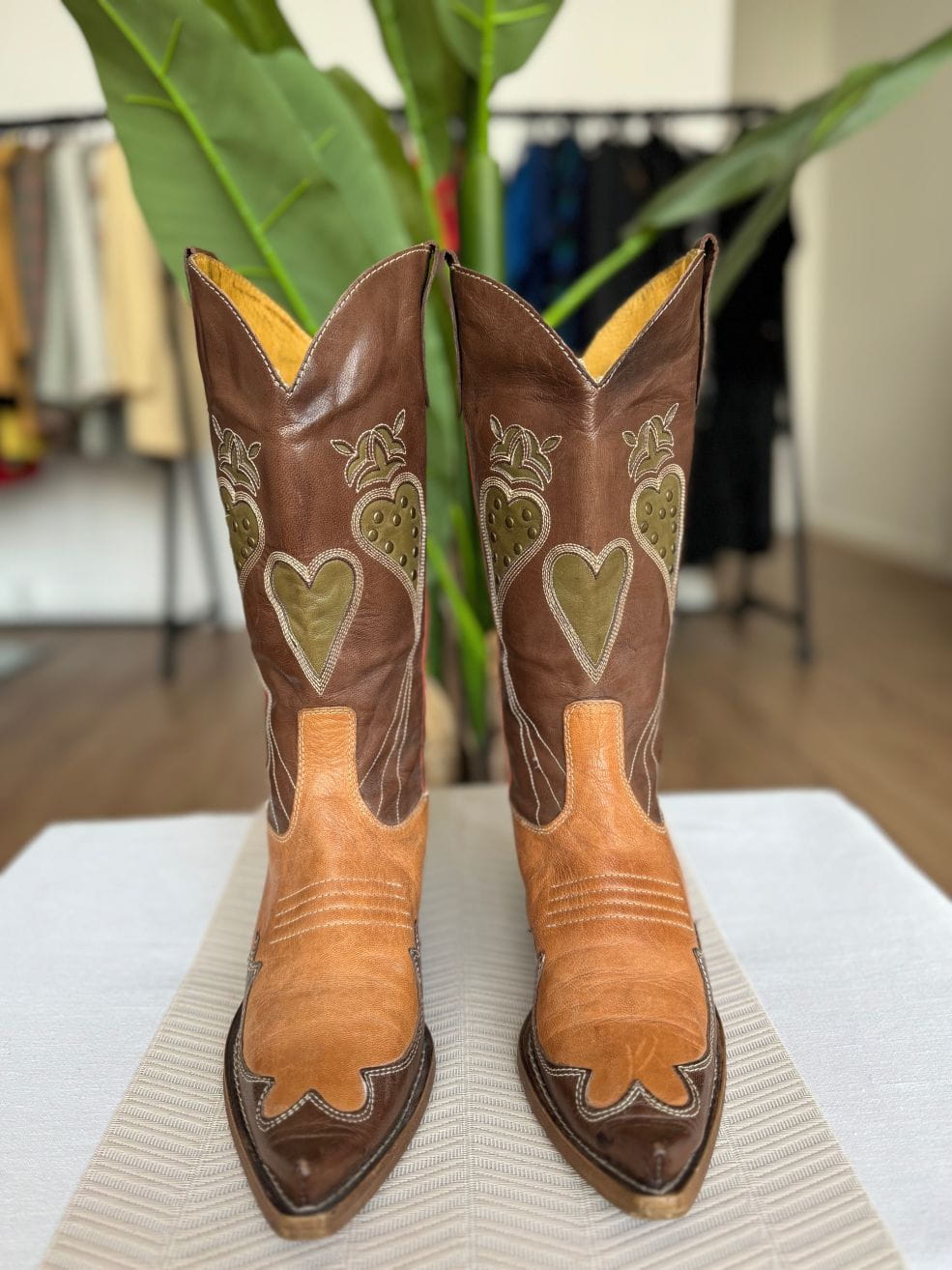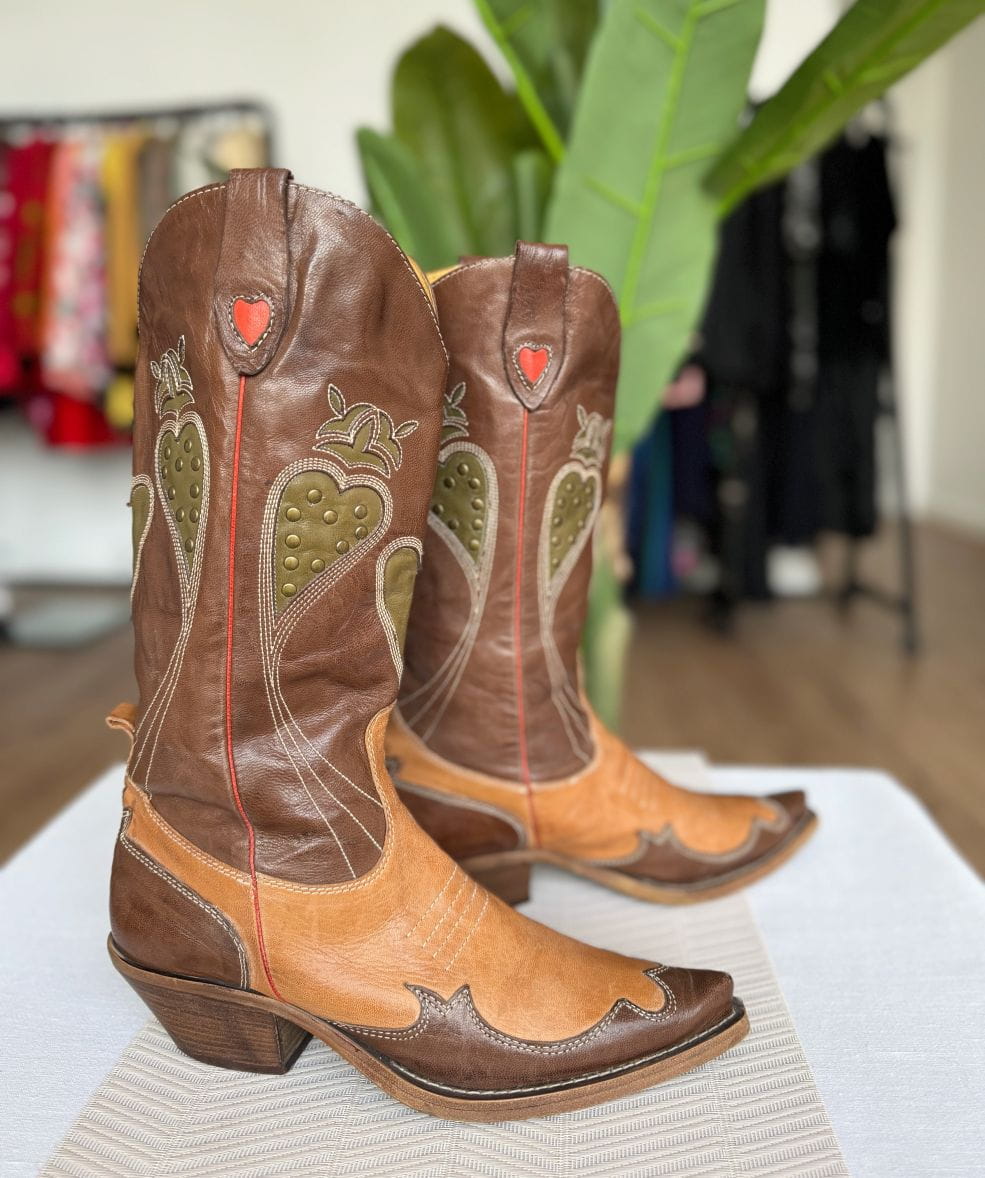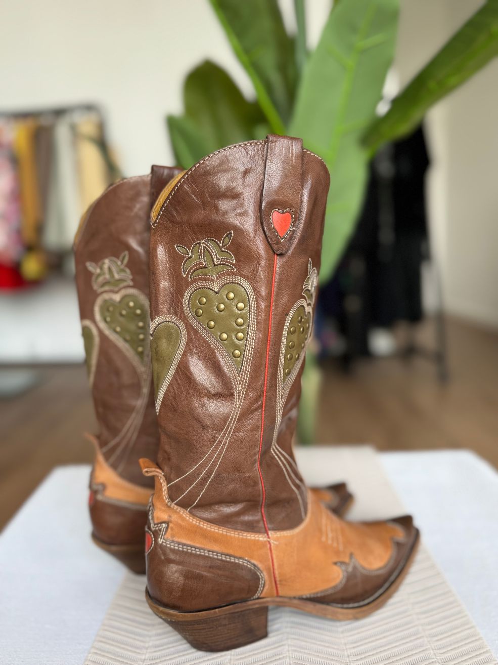 Unikatowe kowbojki vintage w westernowych klimatach wykonane z miękkiej naturalnej skóry. Cholewka zdobiona wielobarwnymi, wyszywanymi wzorami dodającymi im kowbojskiego klimatu. Precyzyjnie wykonane, z dbałością o detal.