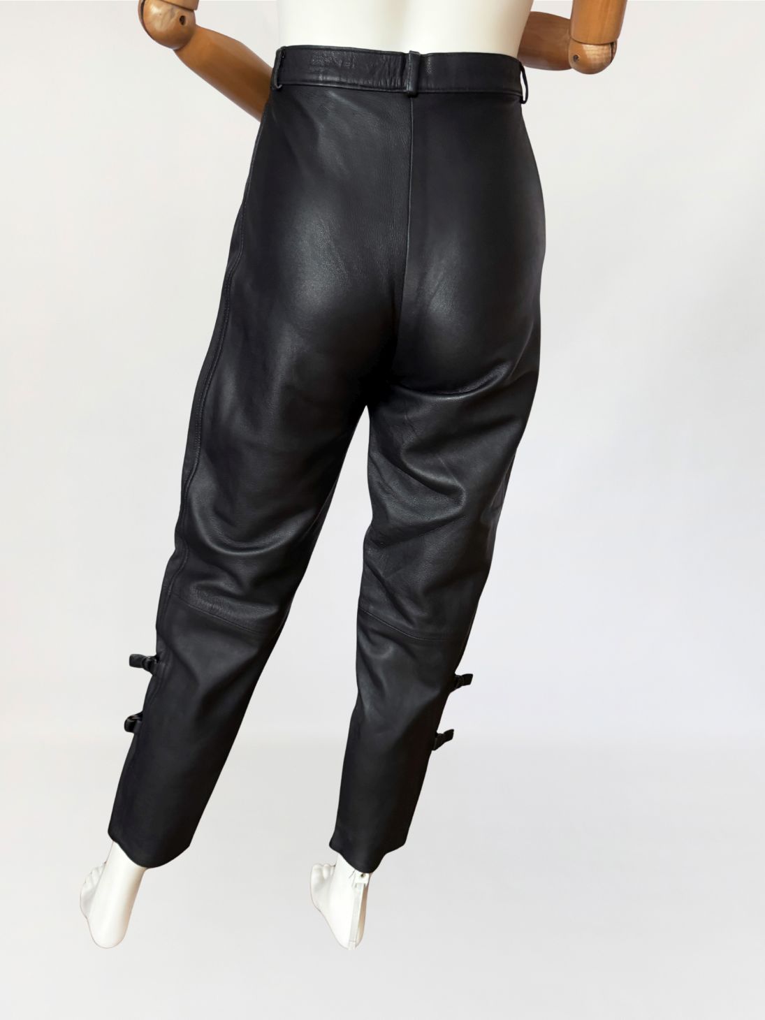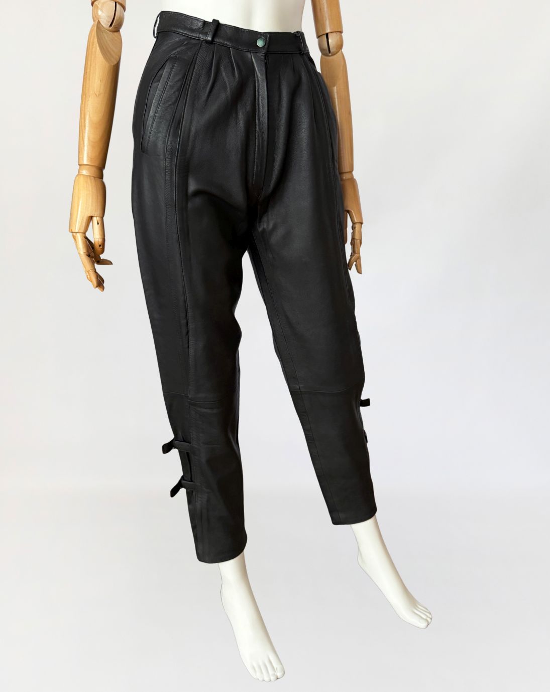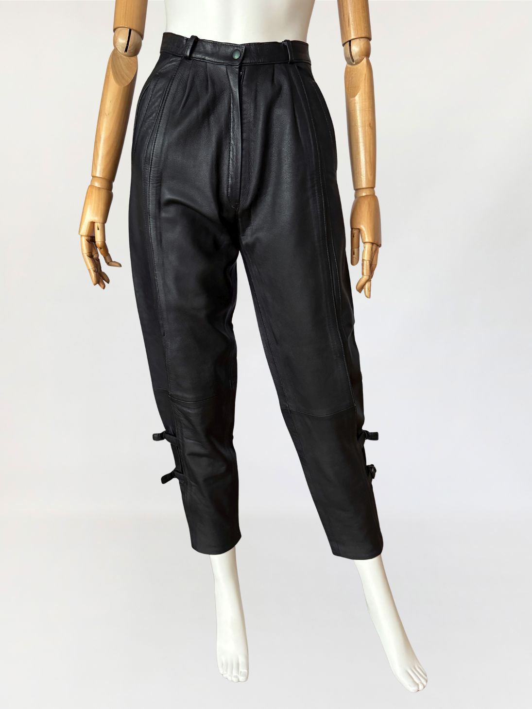 Spodnie vintage z lat 80-tych wykonana z miękkiej jagnięcej naturalnej skóry. Model z wysokim stanem i zaszewkami w pasie. Długie, zwężane do dołu nogawki z pionową zaszewką poprowadzoną przez całą długość. W dolnej części nogawek zastosowano regulowane paski z drobnymi klamrami, umożliwiające dopasowanie obwodu. W górnej części wsuwane kieszenie.