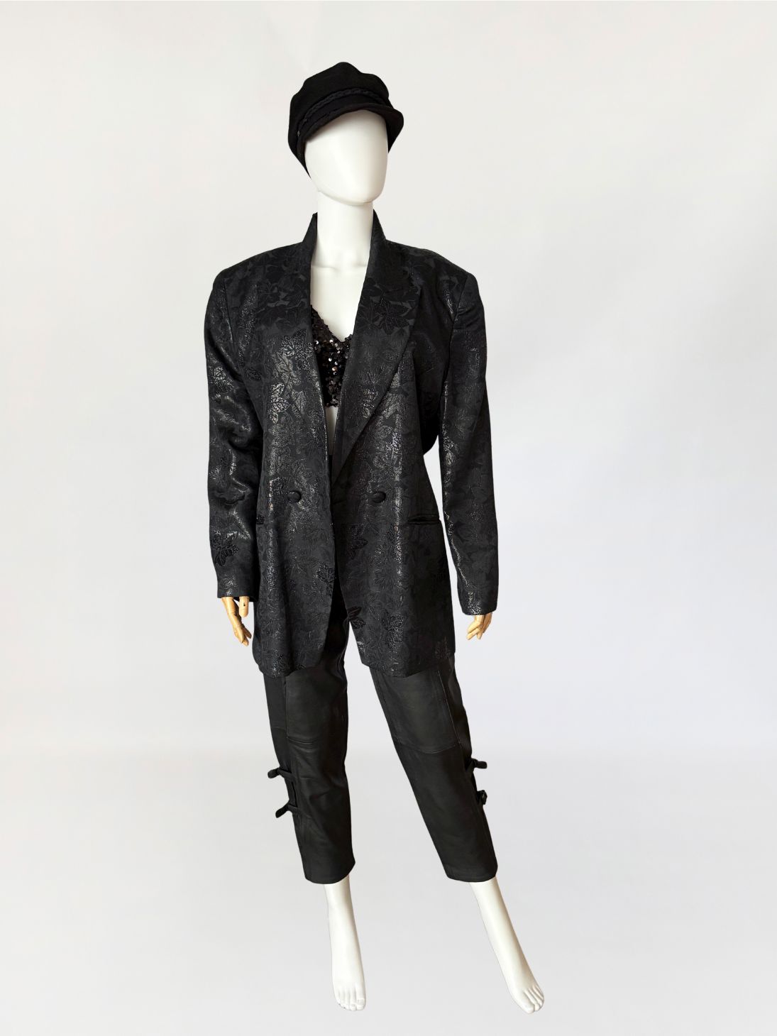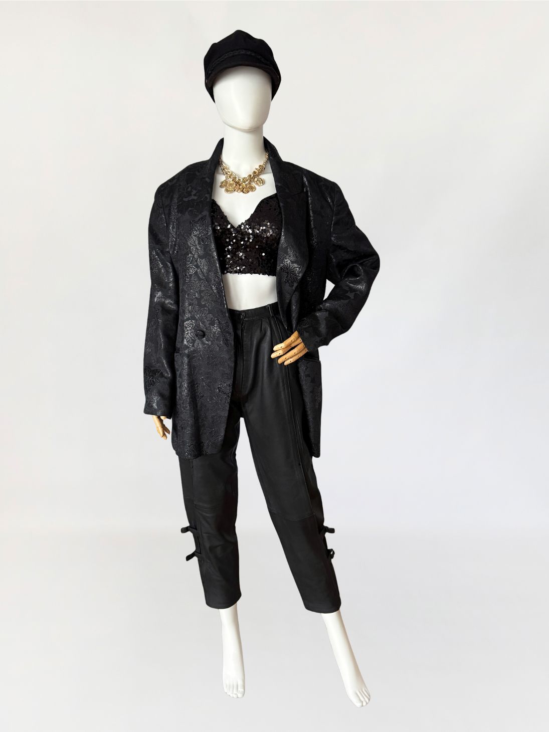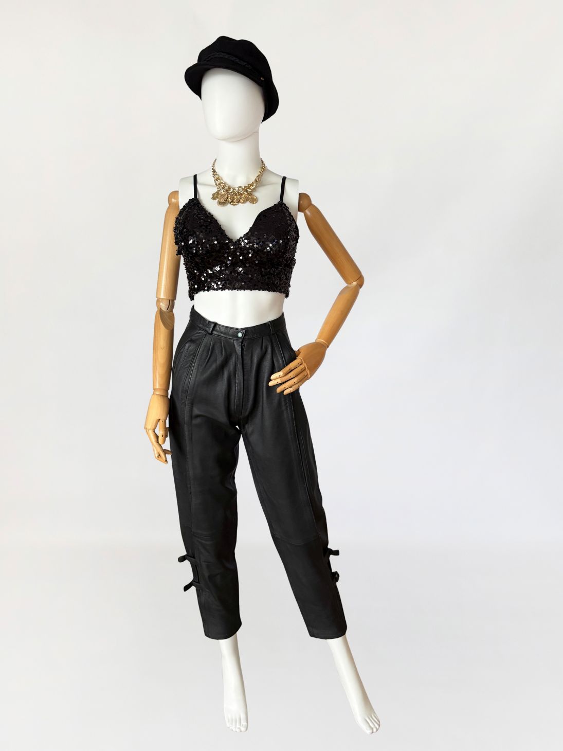 Spodnie vintage z lat 80-tych wykonana z miękkiej jagnięcej naturalnej skóry. Model z wysokim stanem i zaszewkami w pasie. Długie, zwężane do dołu nogawki z pionową zaszewką poprowadzoną przez całą długość. W dolnej części nogawek zastosowano regulowane paski z drobnymi klamrami, umożliwiające dopasowanie obwodu. W górnej części wsuwane kieszenie.