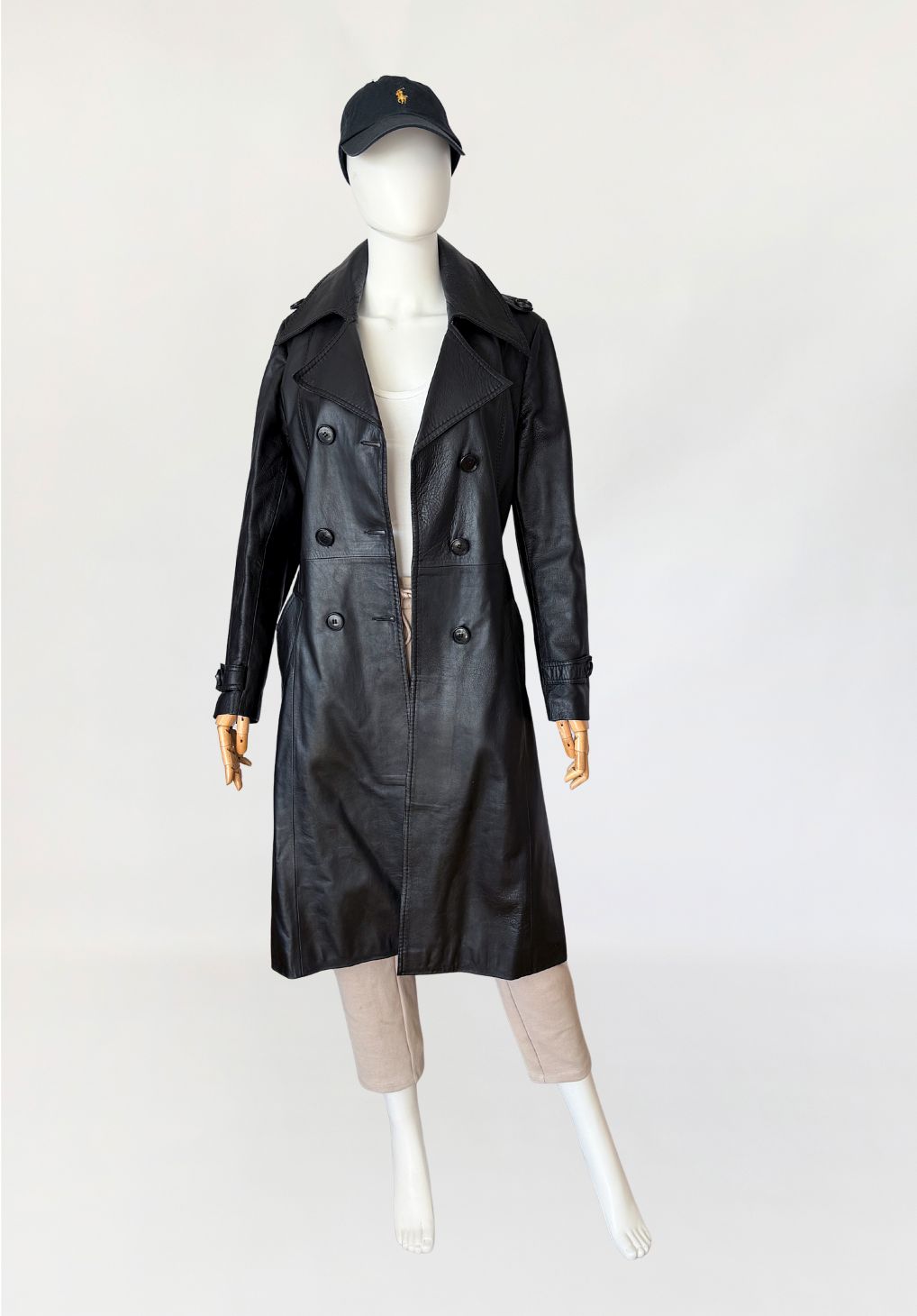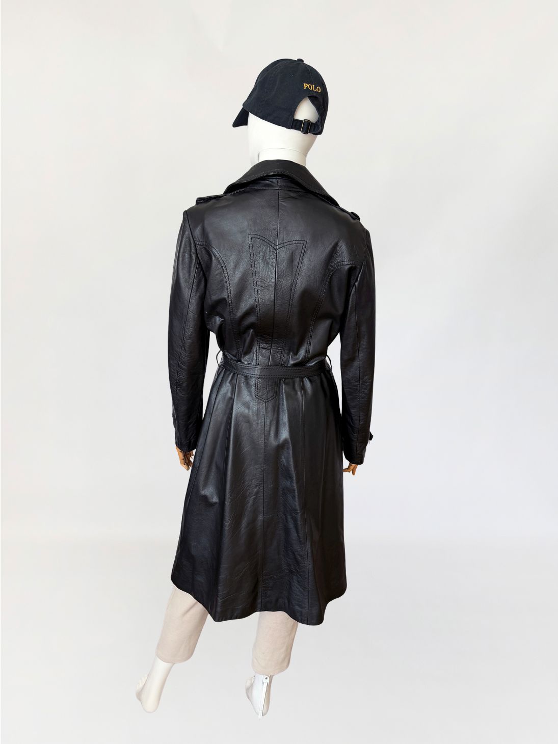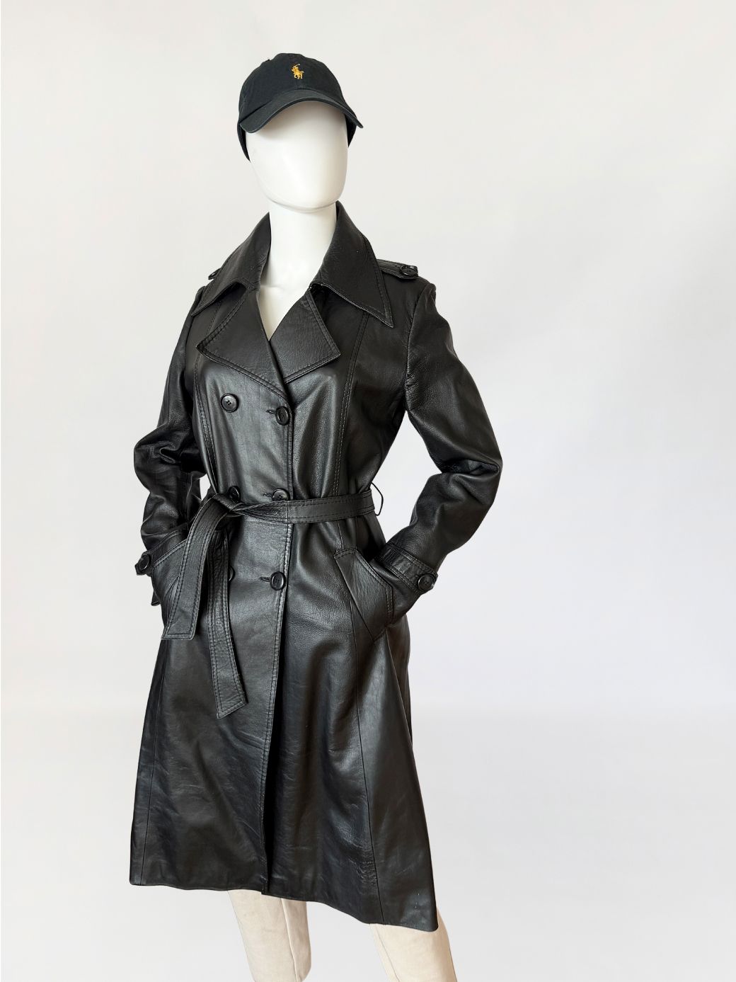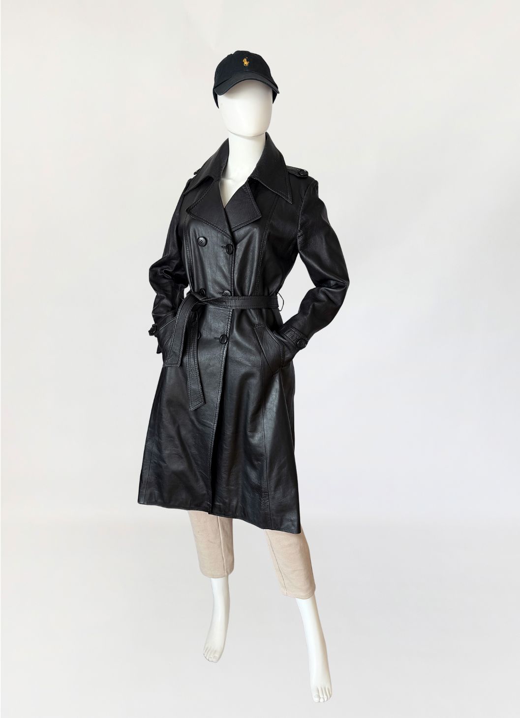Skórzany dwurzędowy trencz vintage z pagonami na ramionach