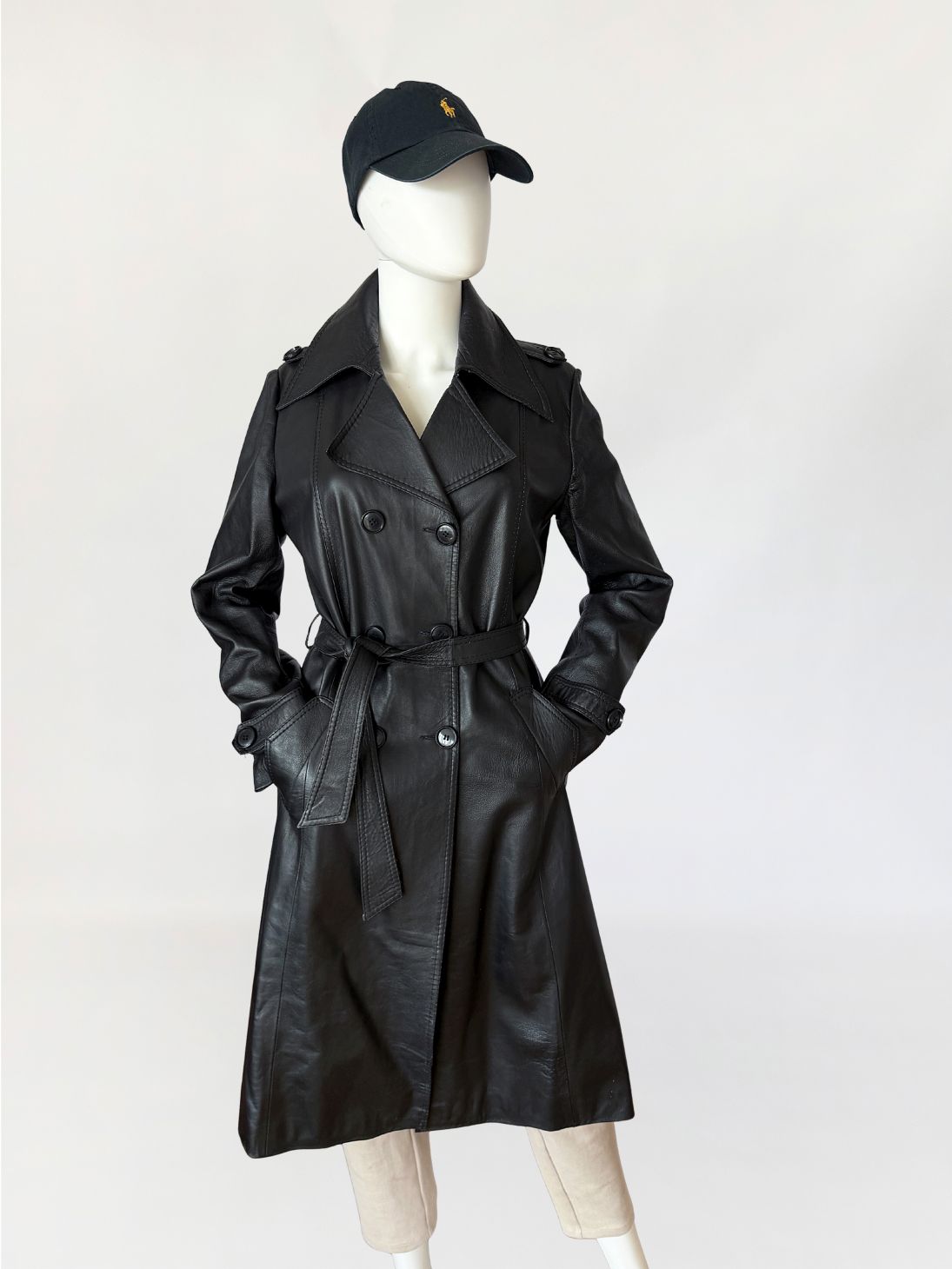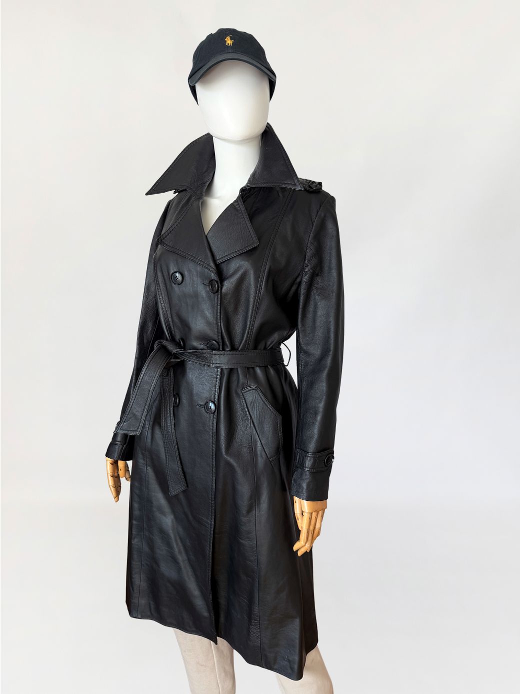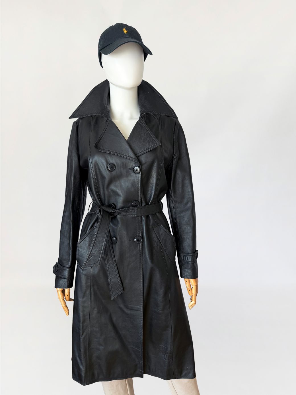 Skórzany dwurzędowy trencz vintage z pagonami na ramionach