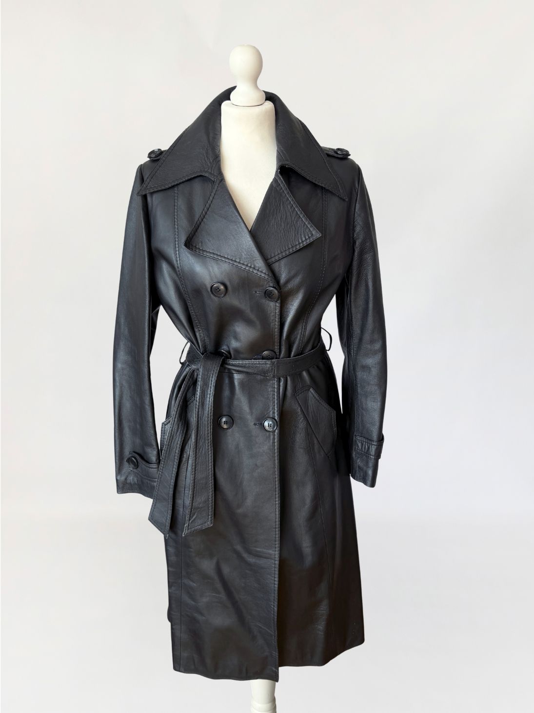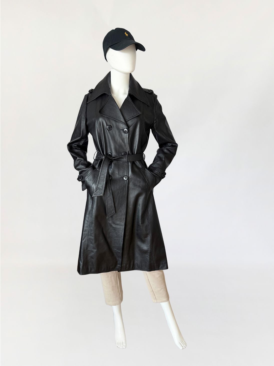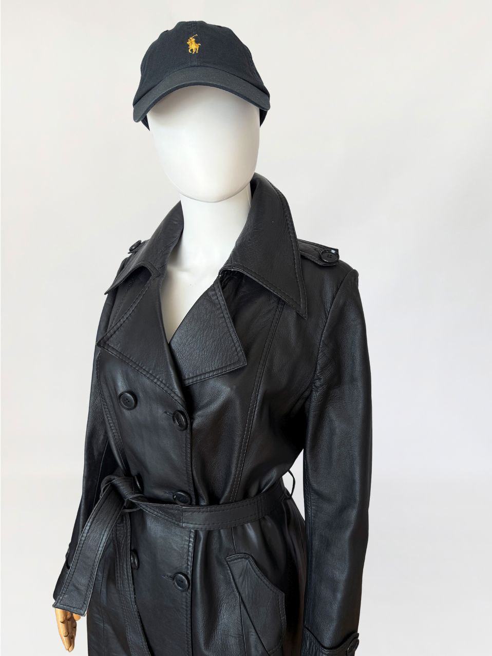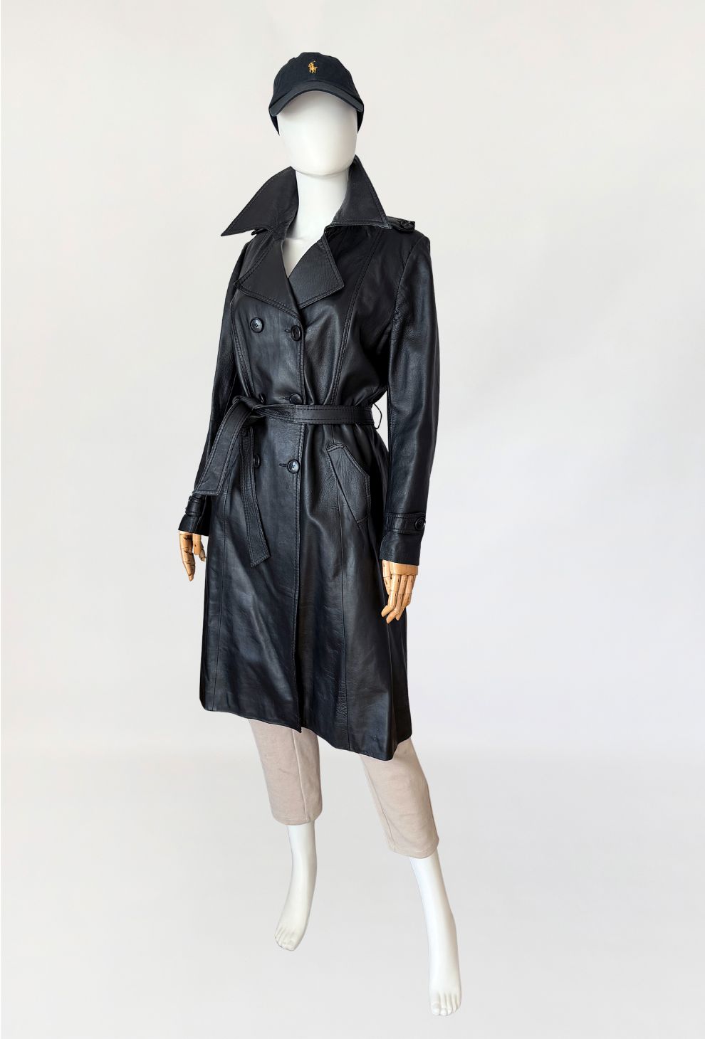 Skórzany dwurzędowy trencz vintage z pagonami na ramionach