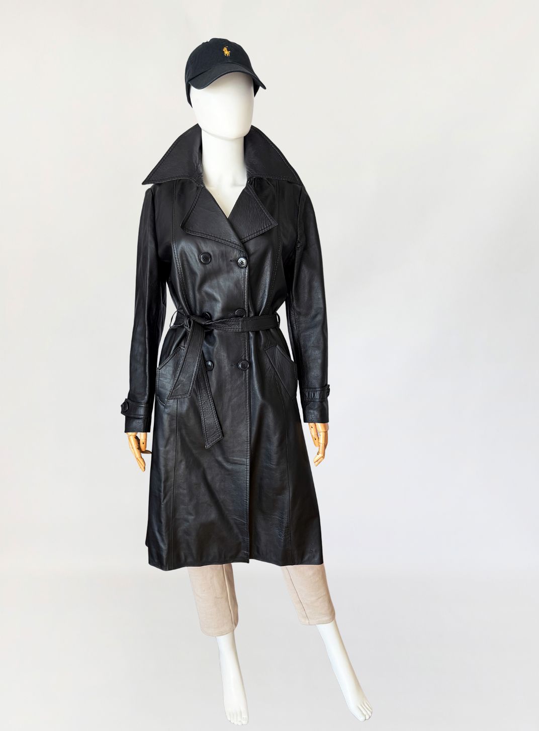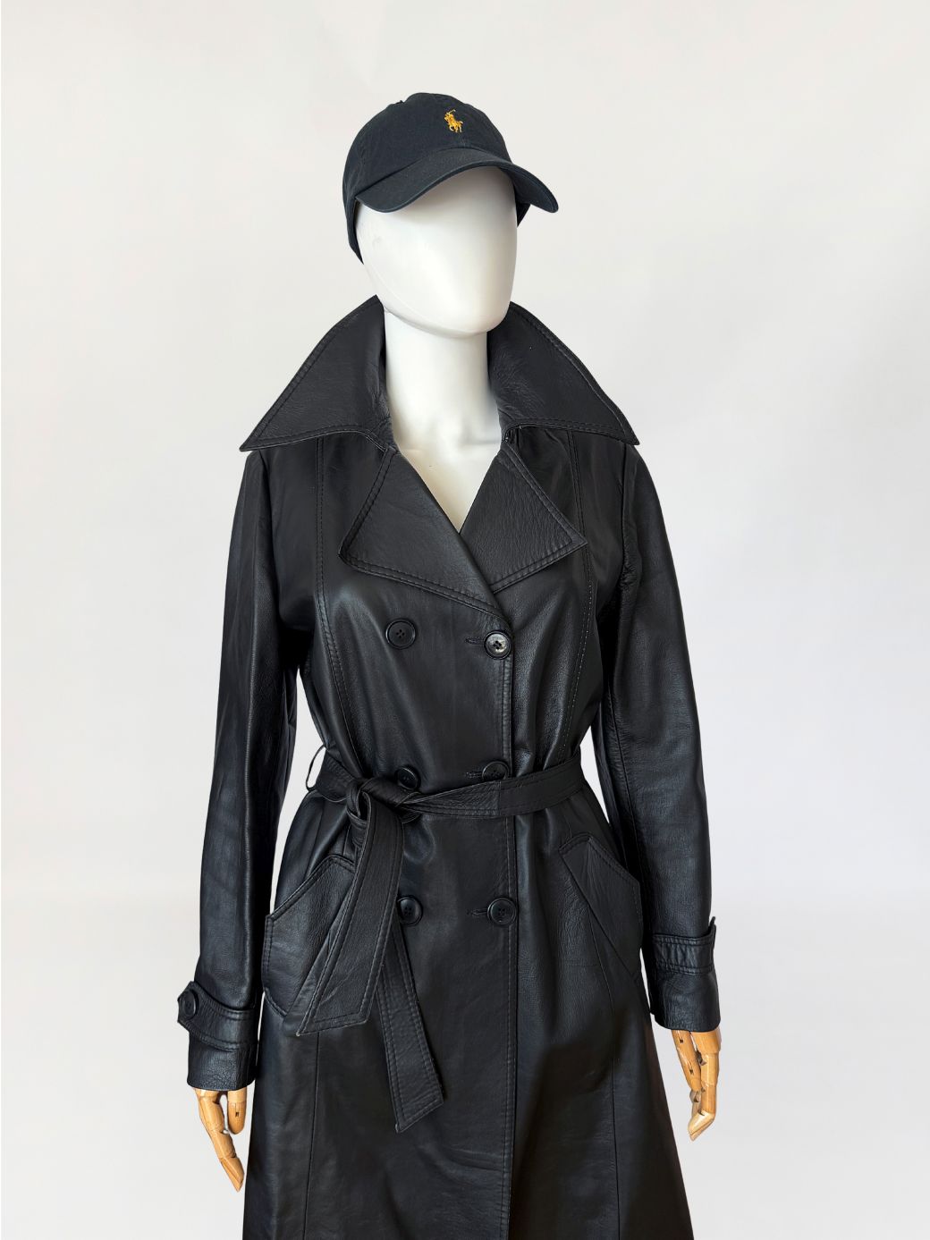 Płaszcz vintage wykonany w całości z miękkiej naturalnej skóry. Ponadczasowy model, który nigdzie nie wyjdzie z mody. Rzecz na lata, doskonałej jakości skóra, która przy odpowiedniej pielęgnacji przetrwa kolejne dekady. Dwurzędowy fason z wiązaniem w talii. W górnej części duży szeroki kołnierz rewersowy z wyraźnie zaznaczonymi klapami. Na ramionach pagony zapinane na guziki.Długie rękawy zakończone mankietami z paskiem i guzikiem. Na wysokości bioder dwie kieszenie wpuszczane o ukośnym przebiegu.Tył z pionowymi przeszyciami modelującymi oraz dodatkowym elementem konstrukcyjnym w środkowej części pleców.
