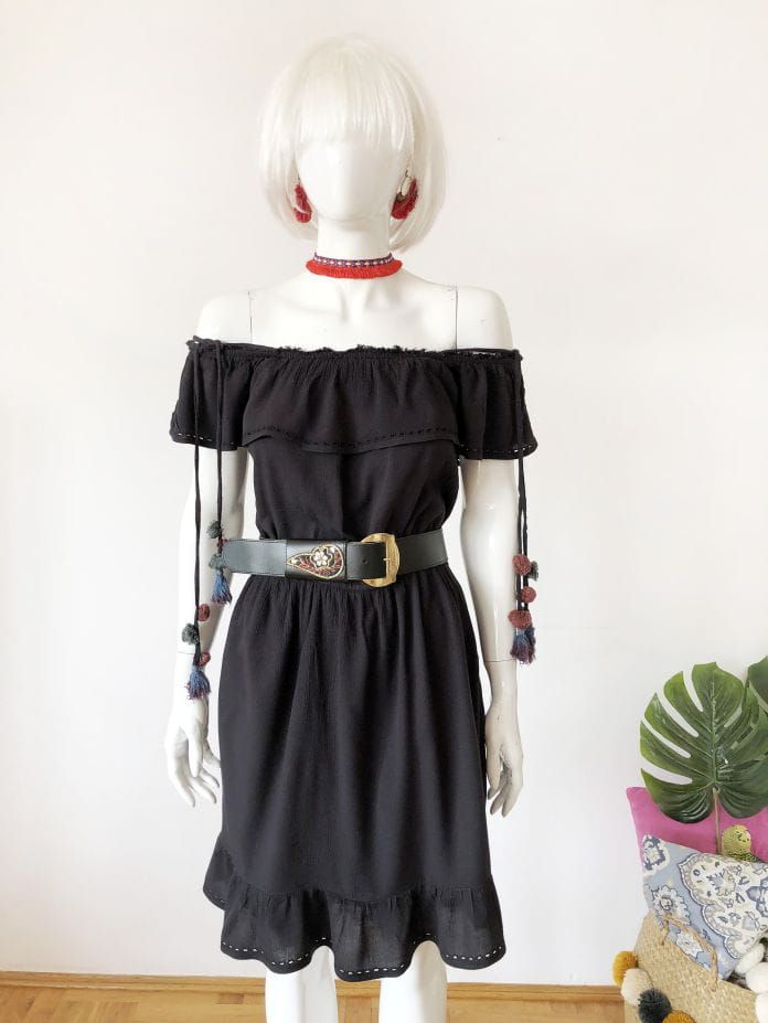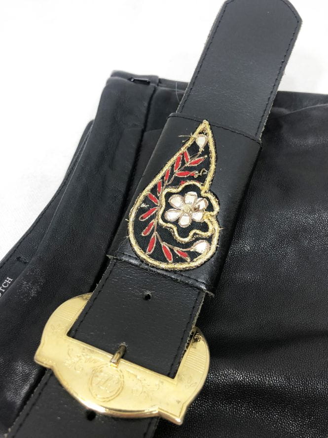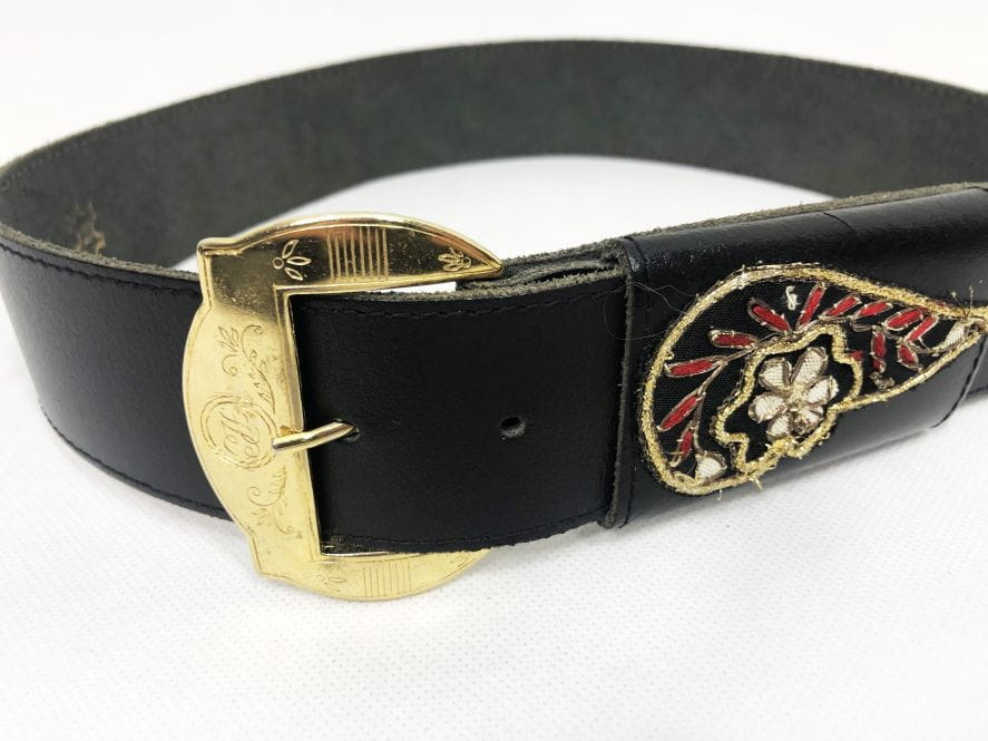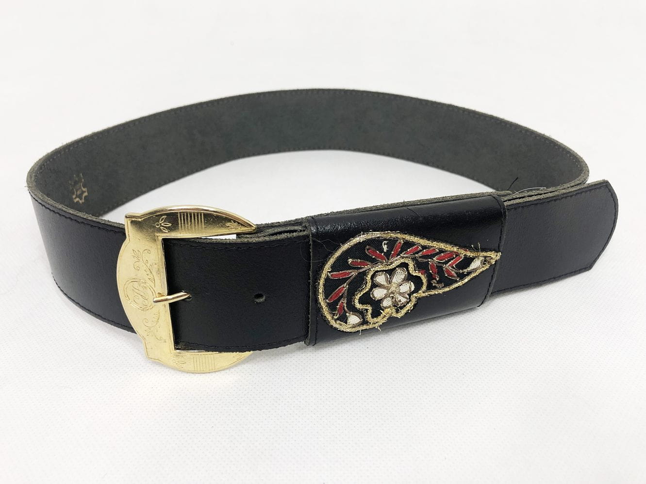 Czarny pasek vintage wykonany ze skóry naturalnej. Duża złota grawerowana klamra, z przodu haftowana aplikacja. Regulowany obwód.
