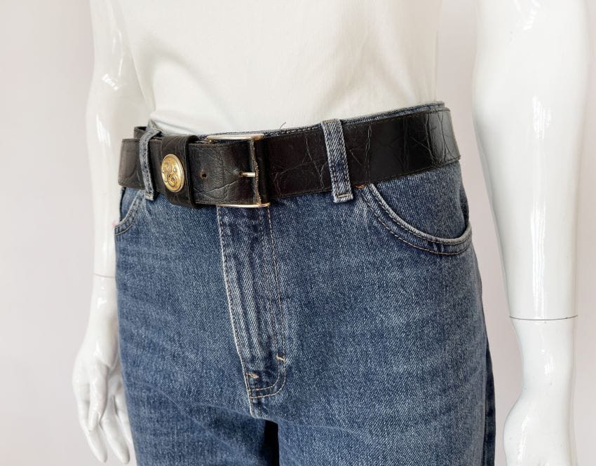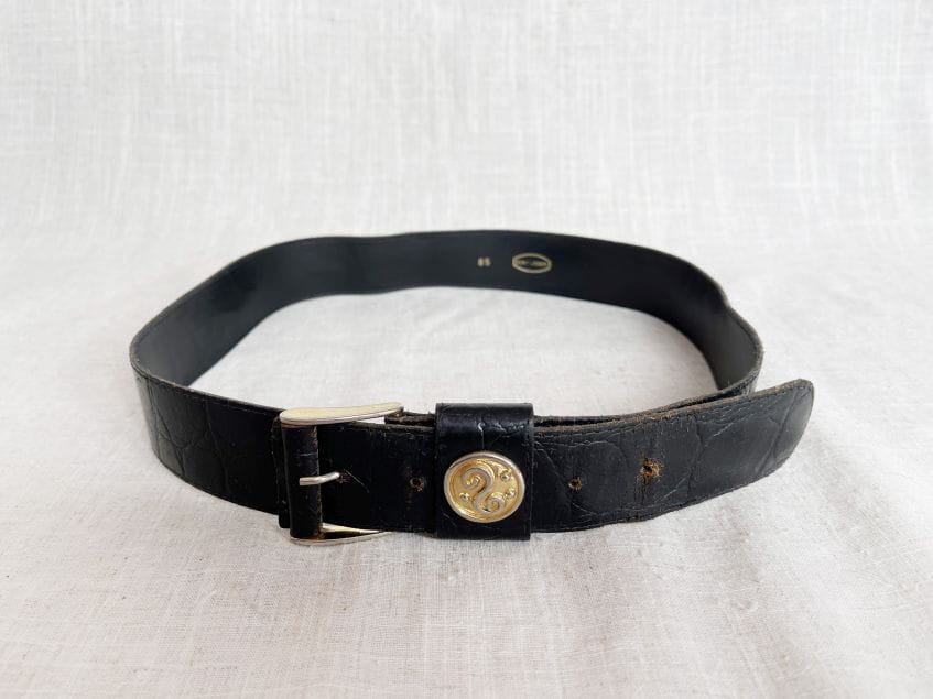Czarny pasek vintage wykonany z teksturowanej skóry naturalnej. Sprzączka z ozdobnym złotym elementem.